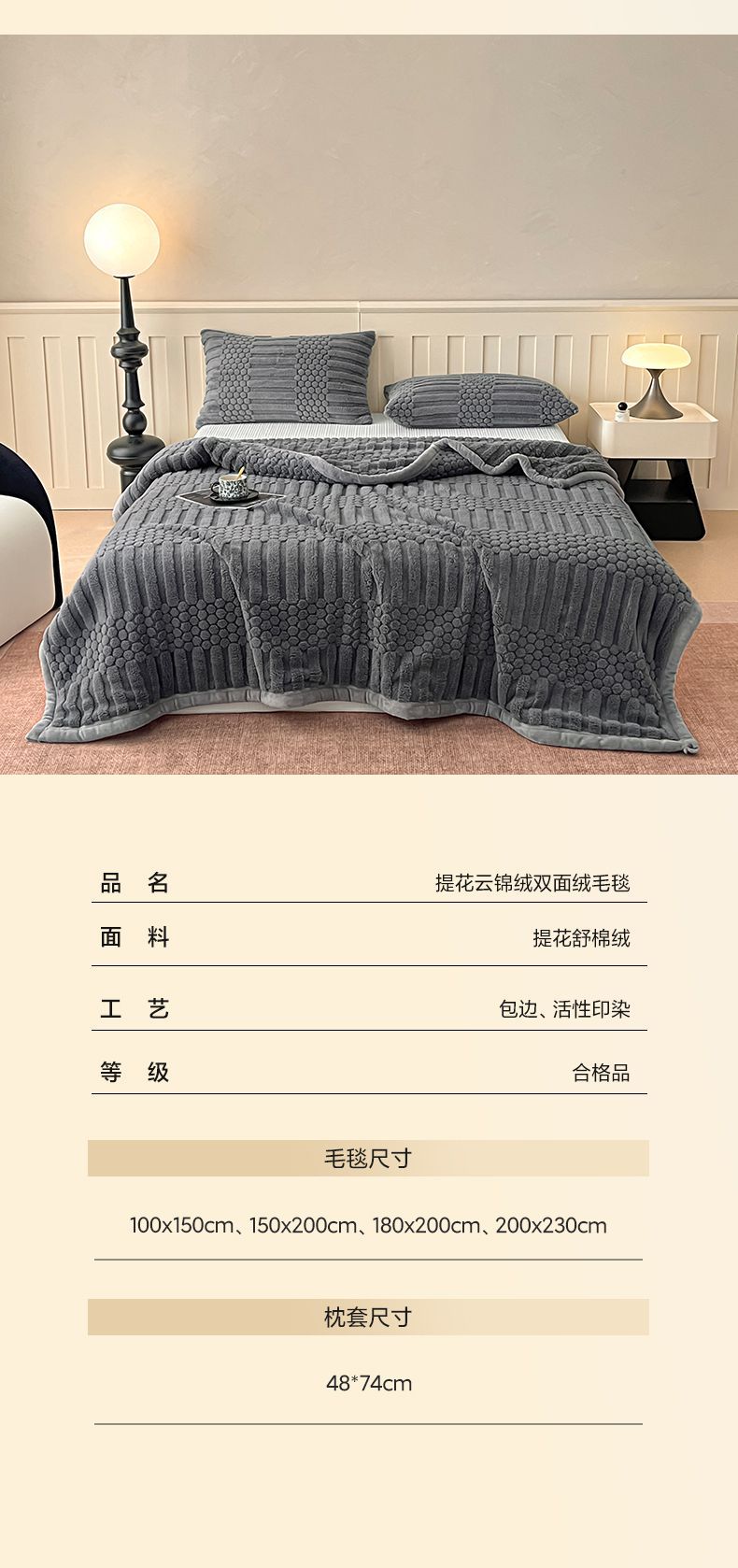 商品名称:欧邦 2025新款A类提花云锦绒双面绒单层毯-风铃系列 风铃-深灰