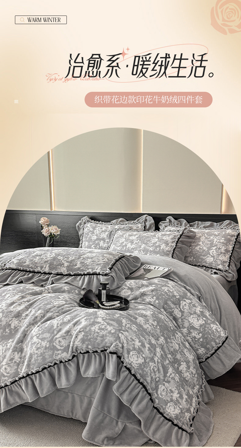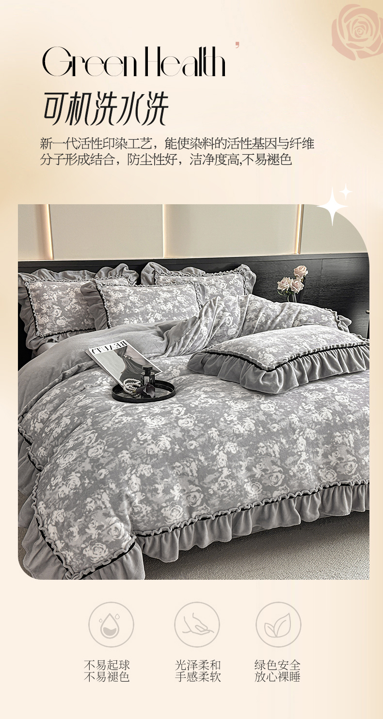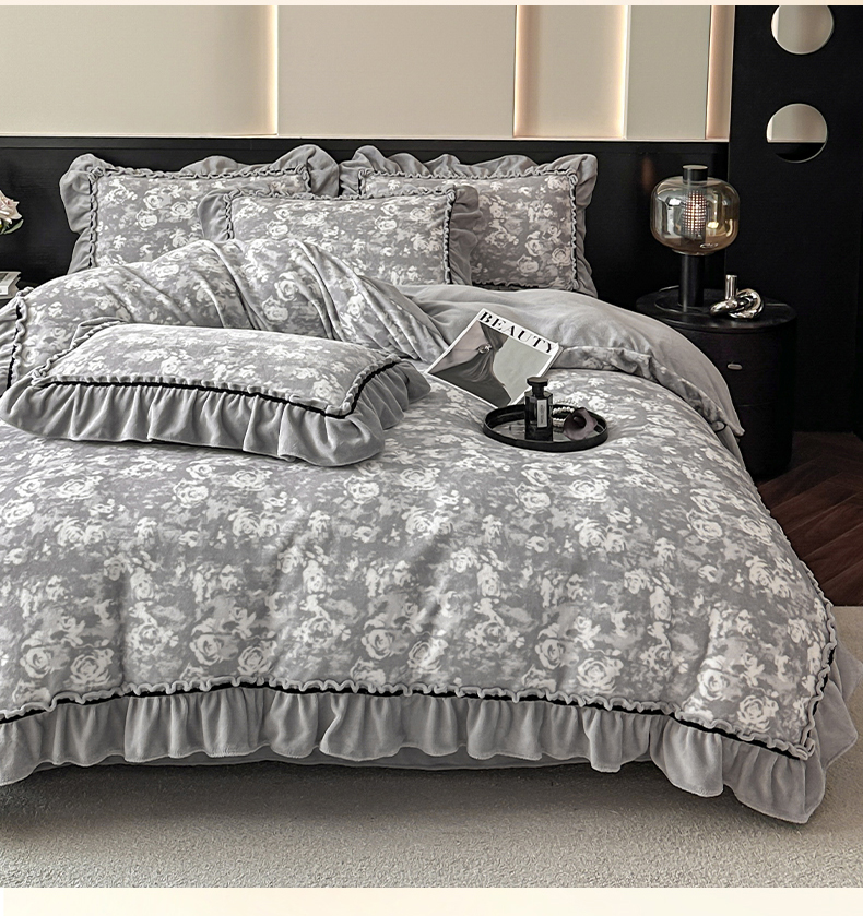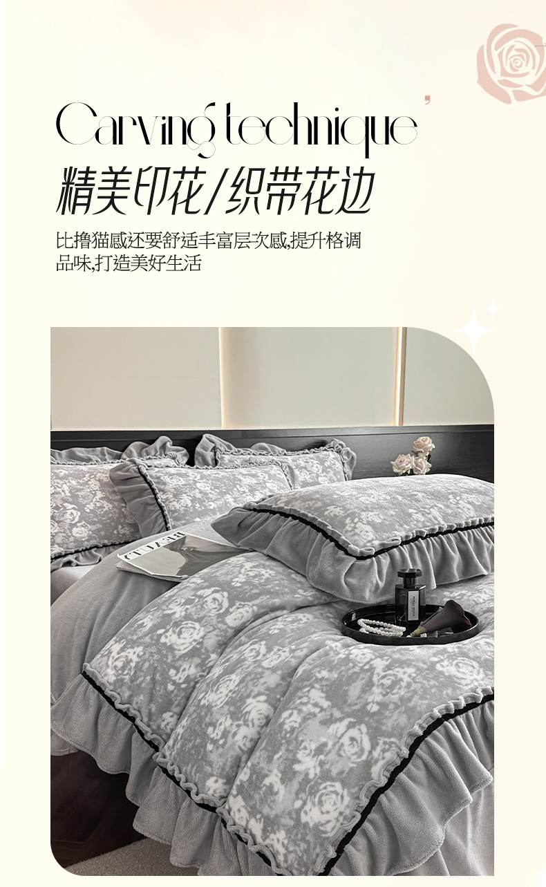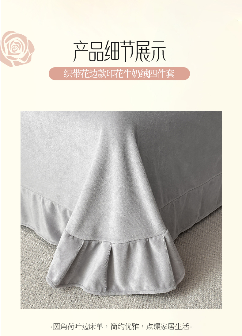 商品名称:绘萱家居 2025新款爆款高密消光织带花边款印花牛奶绒四件套纯色 芳华玫瑰-灰