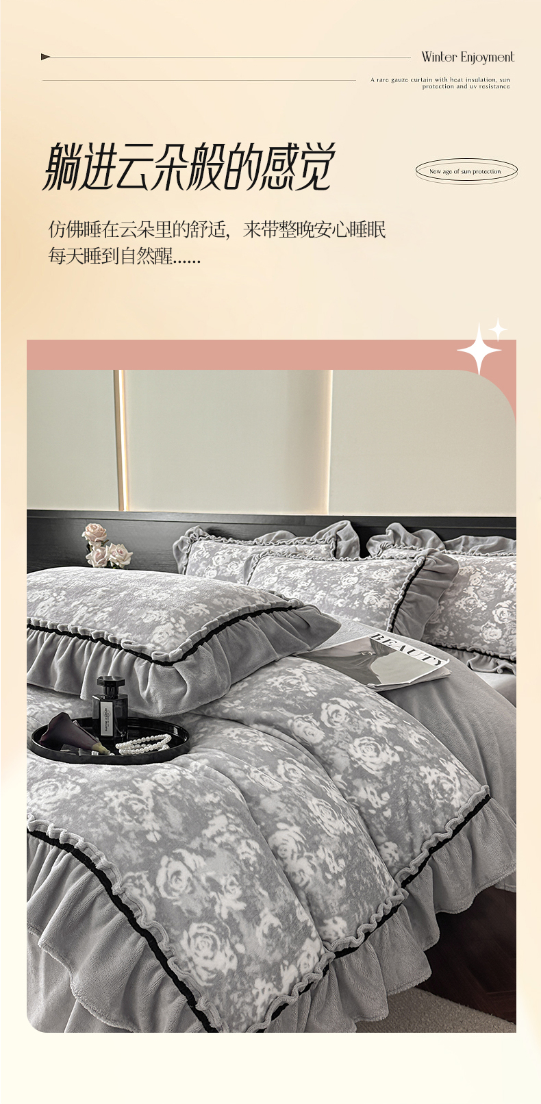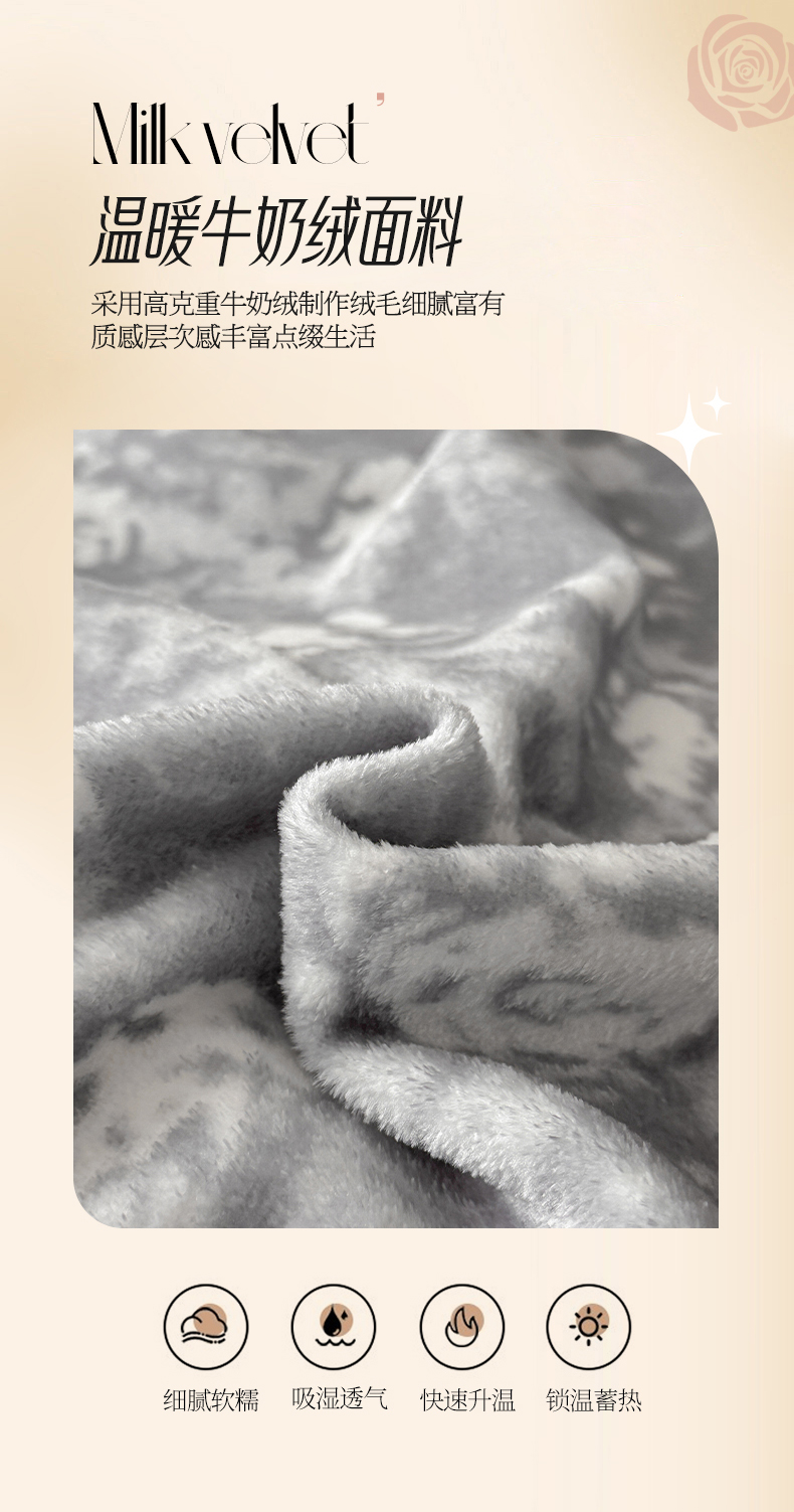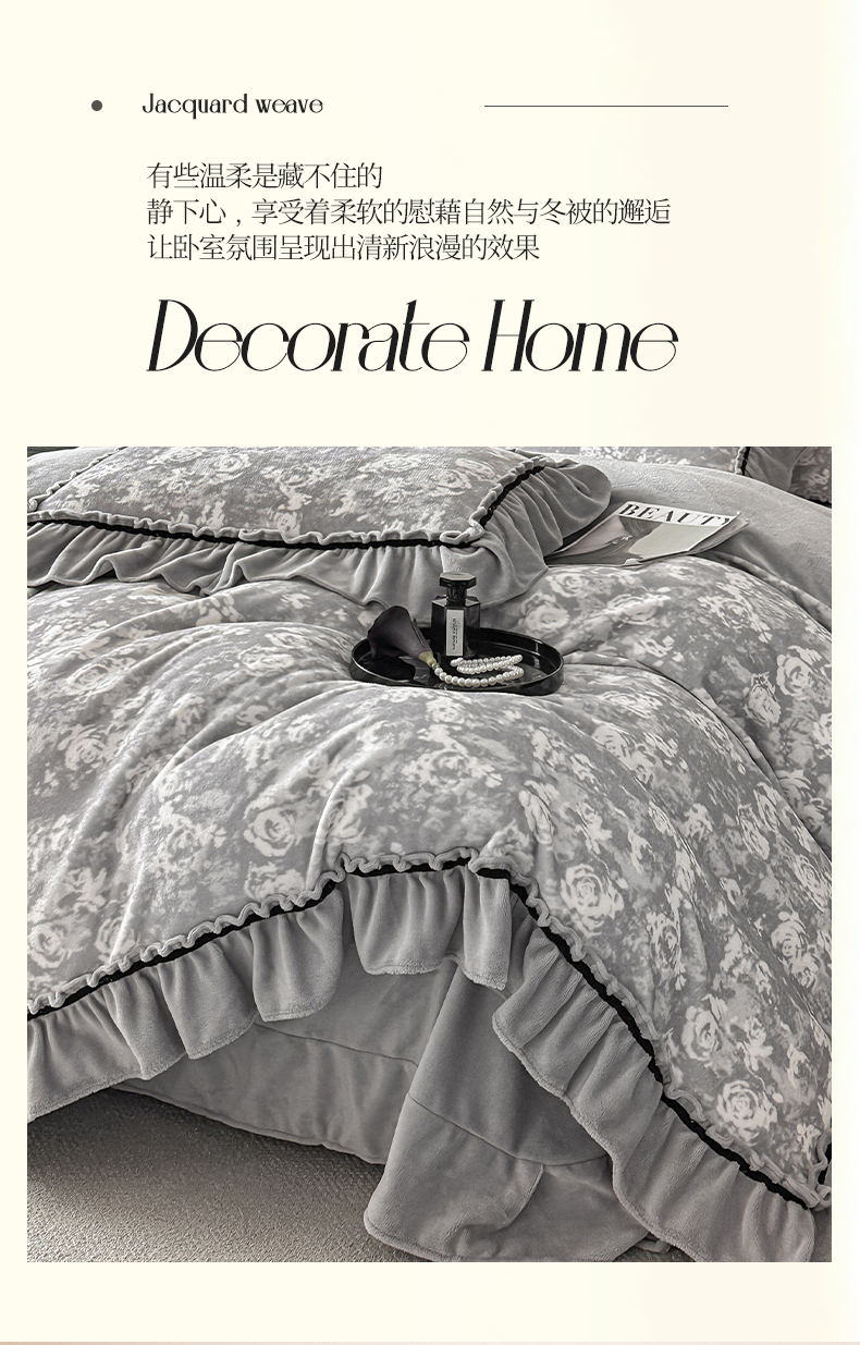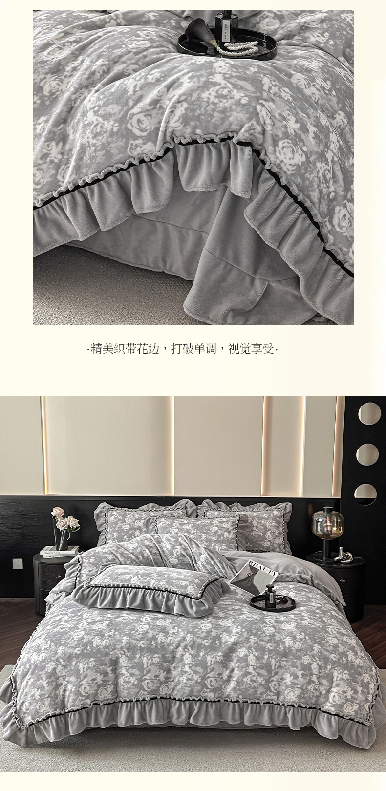 商品名称:绘萱家居 2025新款爆款高密消光织带花边款印花牛奶绒四件套纯色 芳华玫瑰-灰