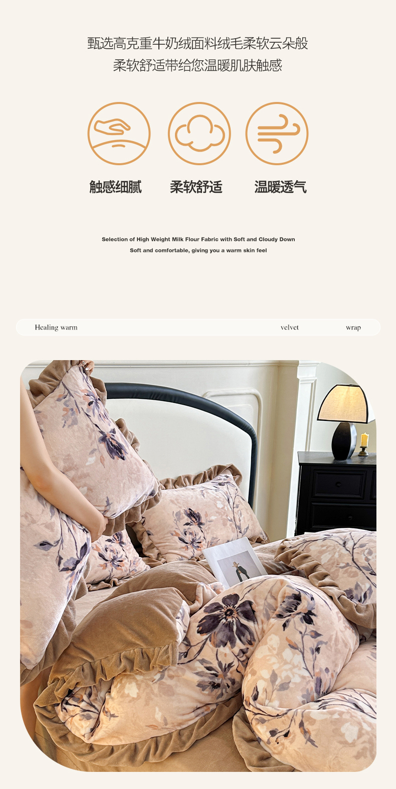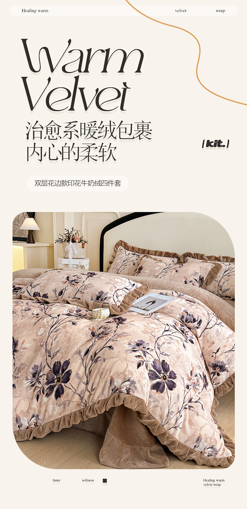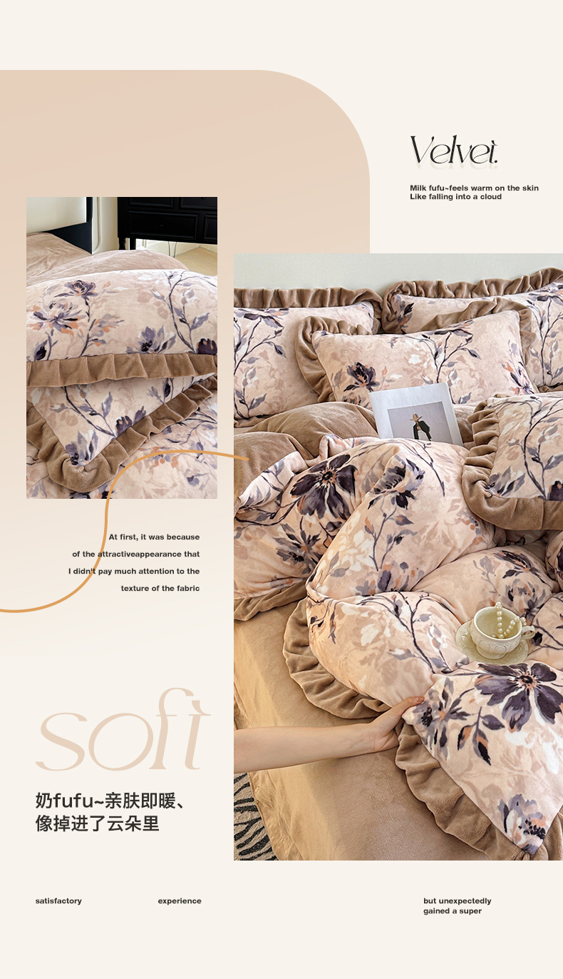 商品名称:绘萱家居 2025新款爆款高密消光双层花边牛奶绒四件套印花 幽幽花香