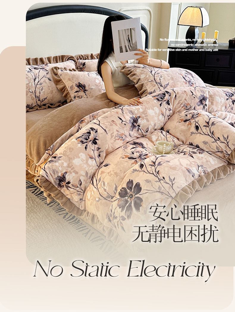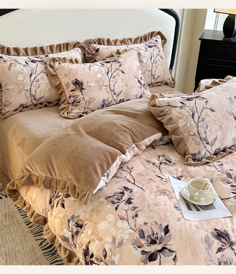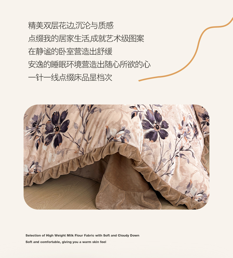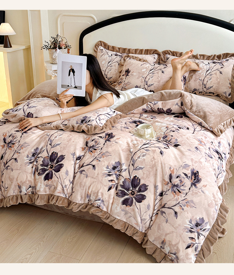 绘萱家居 2025新款爆款高密消光双层花边牛奶绒四件套印花 幽幽花香