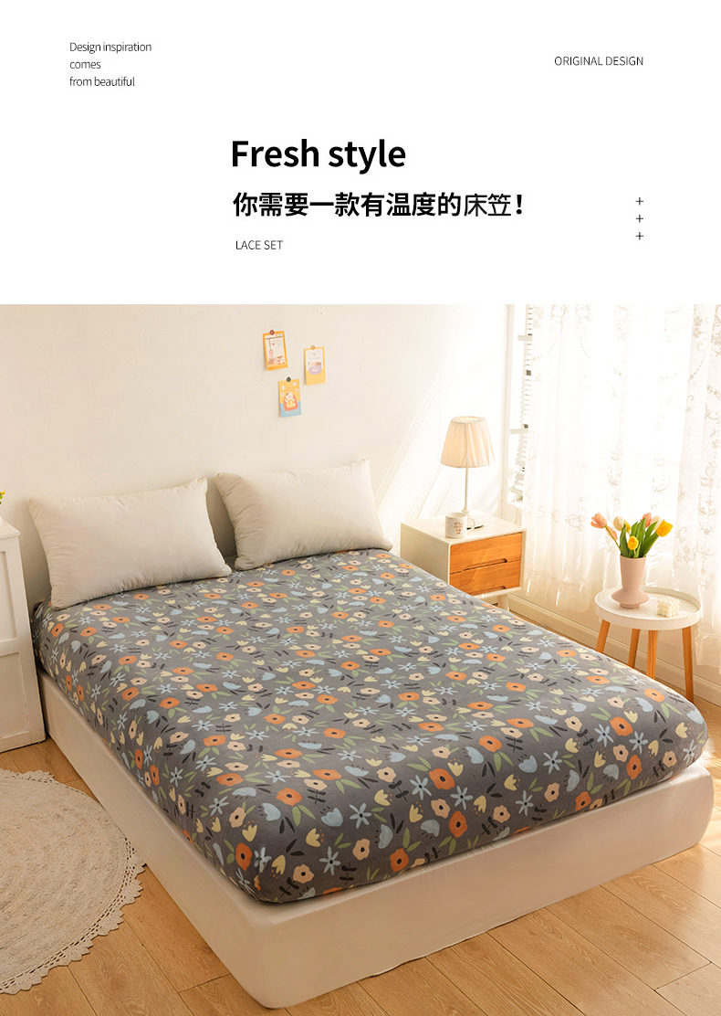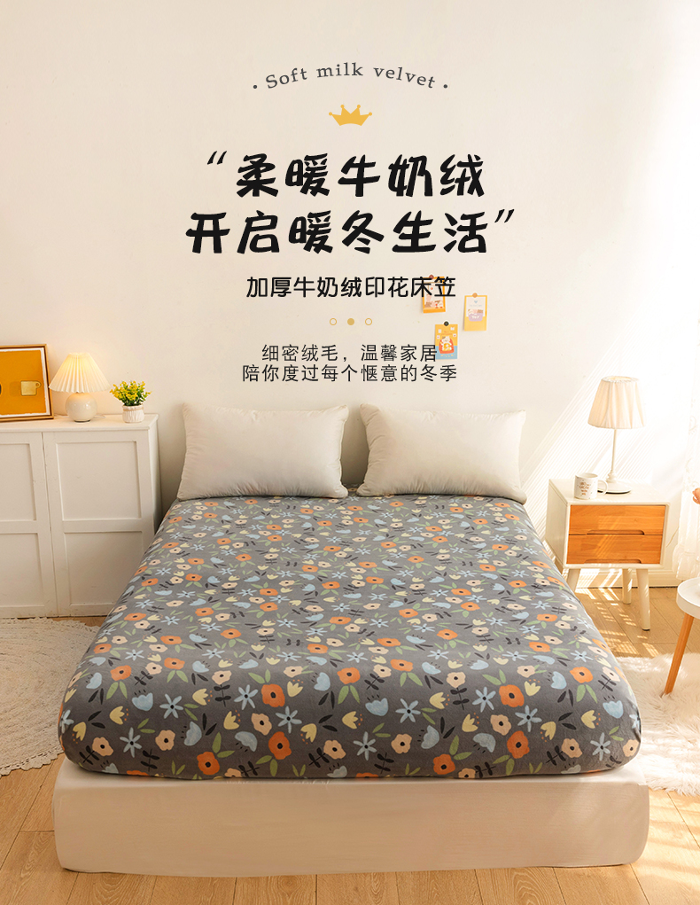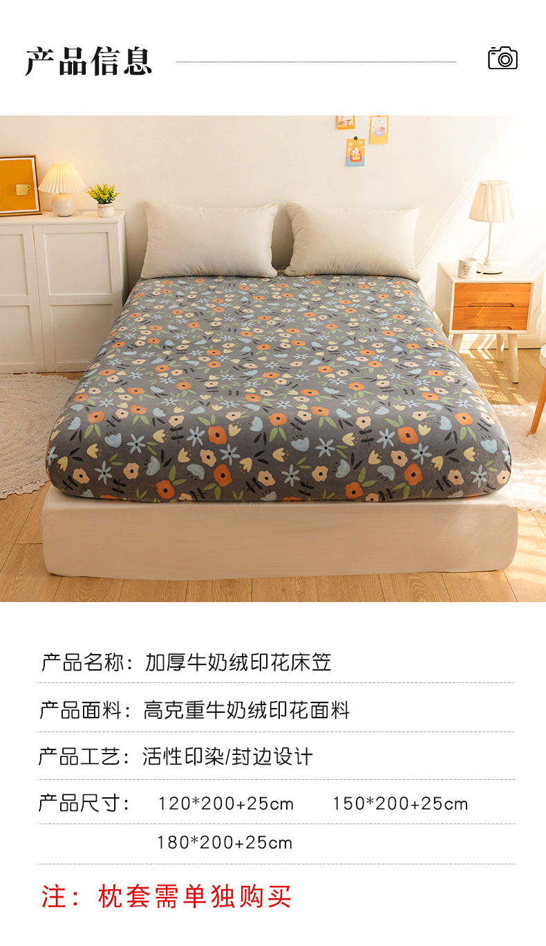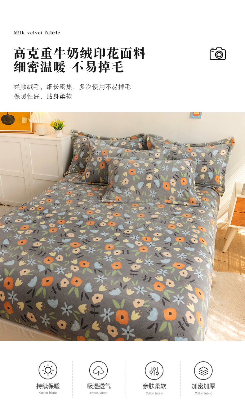 商品名称:金盛纺 2025新款高克重牛奶绒印花系列单床笠(可定制) 繁花(灰)