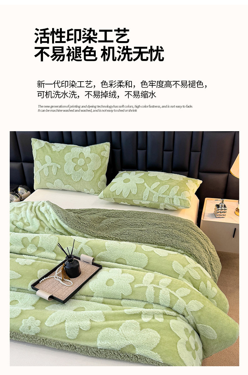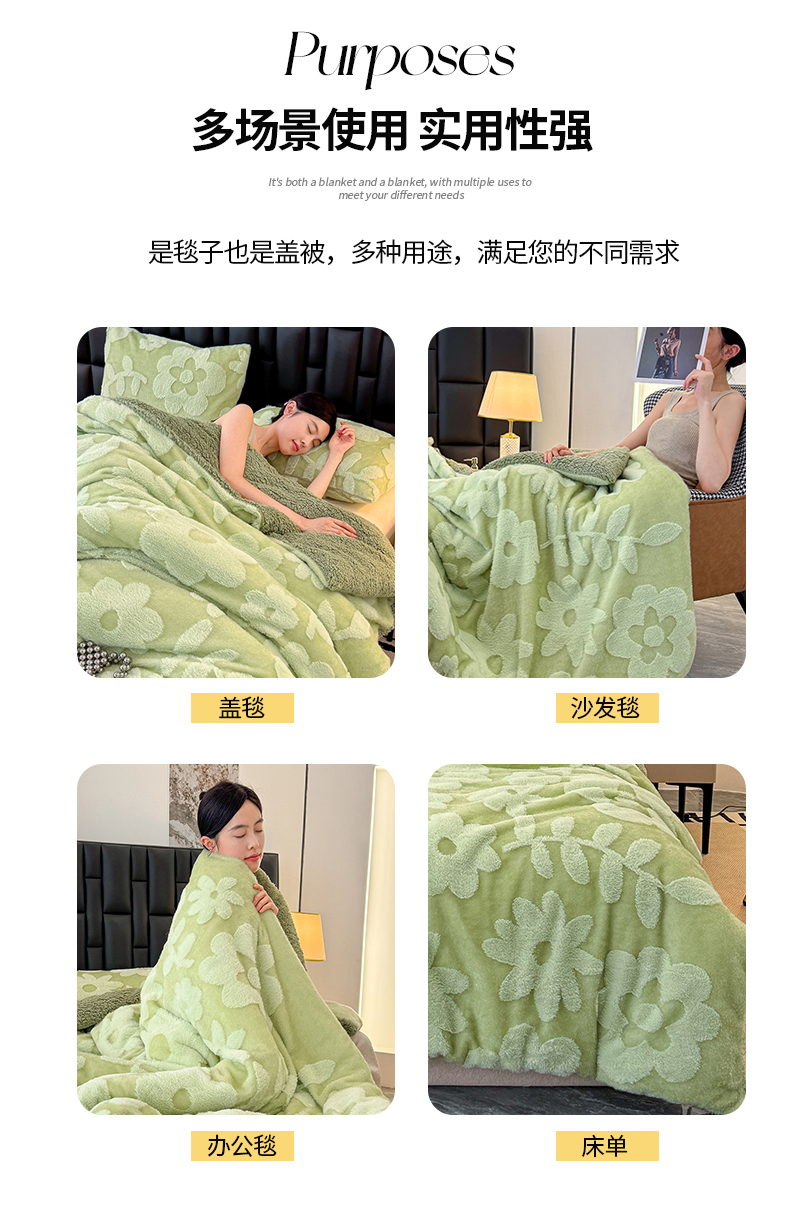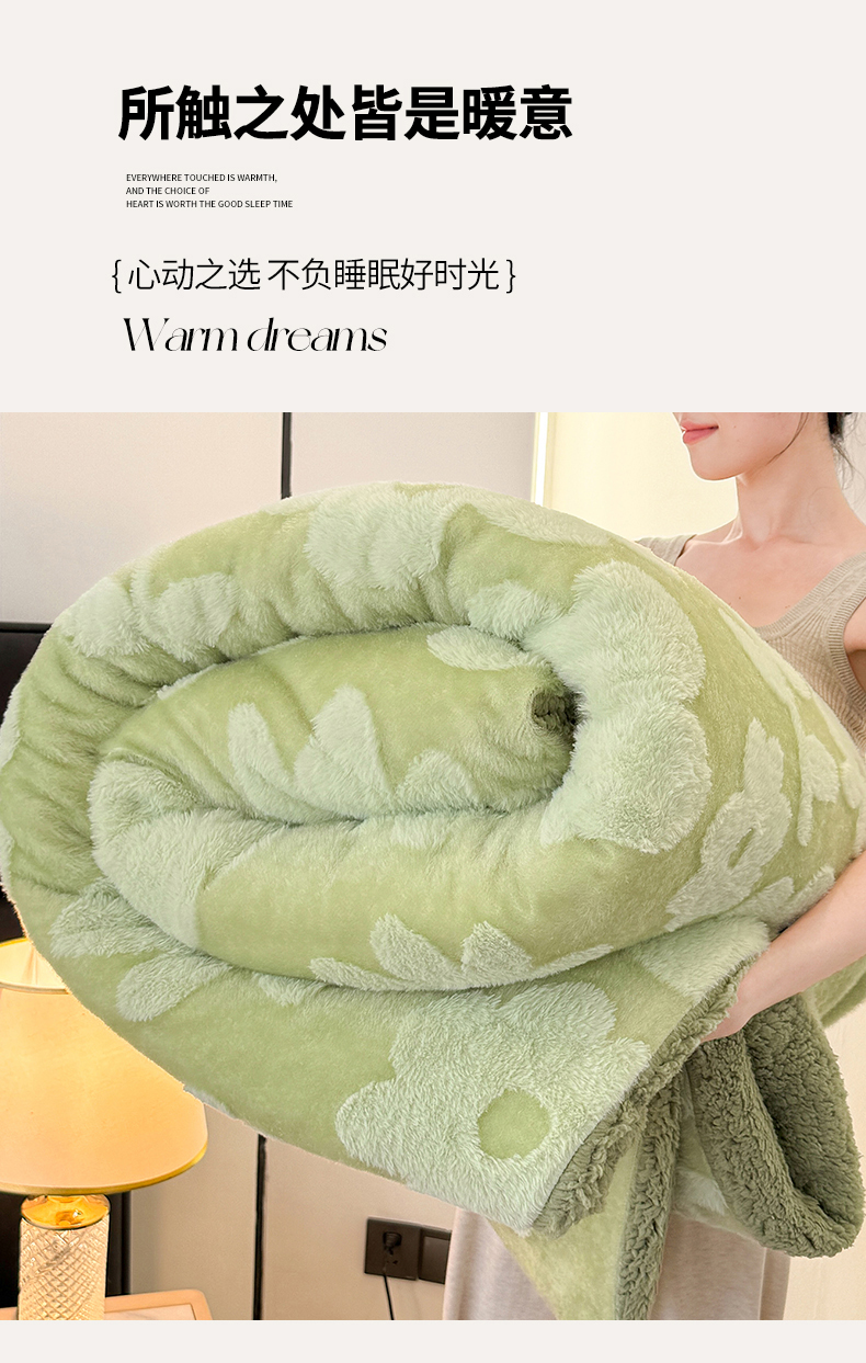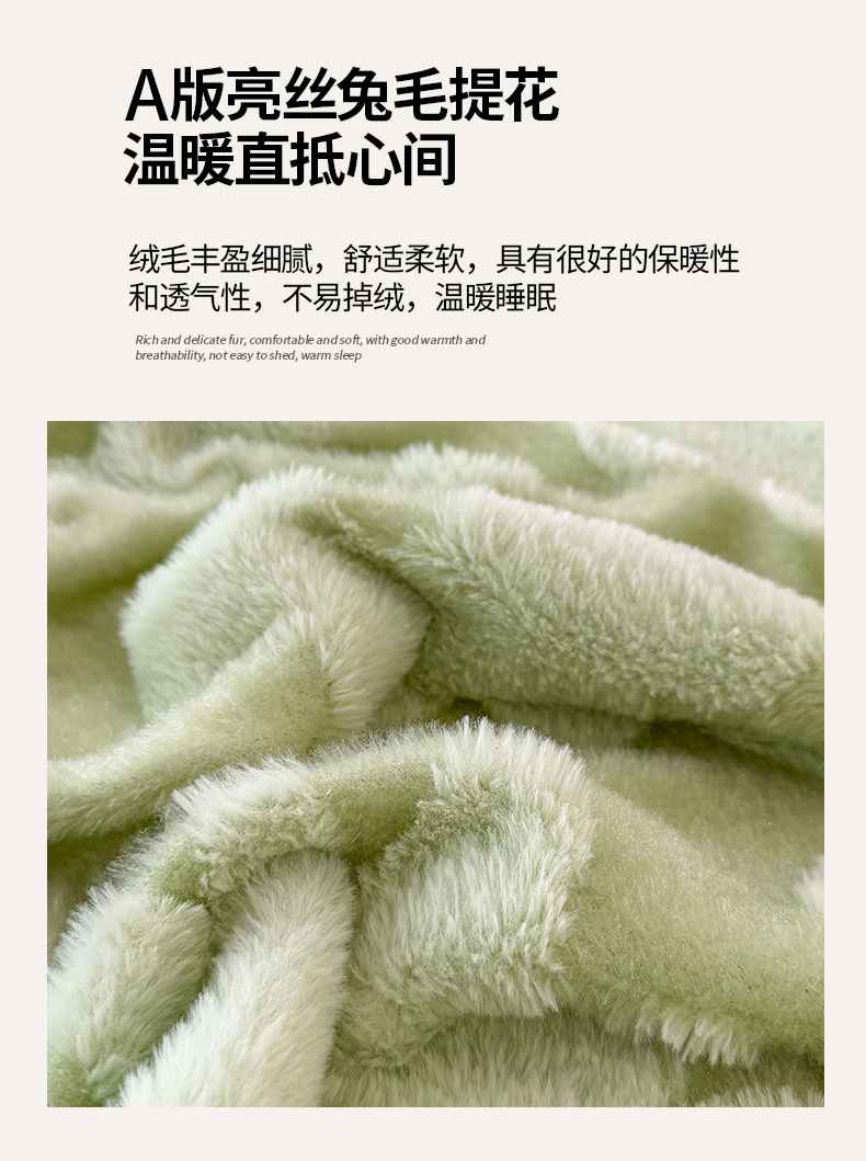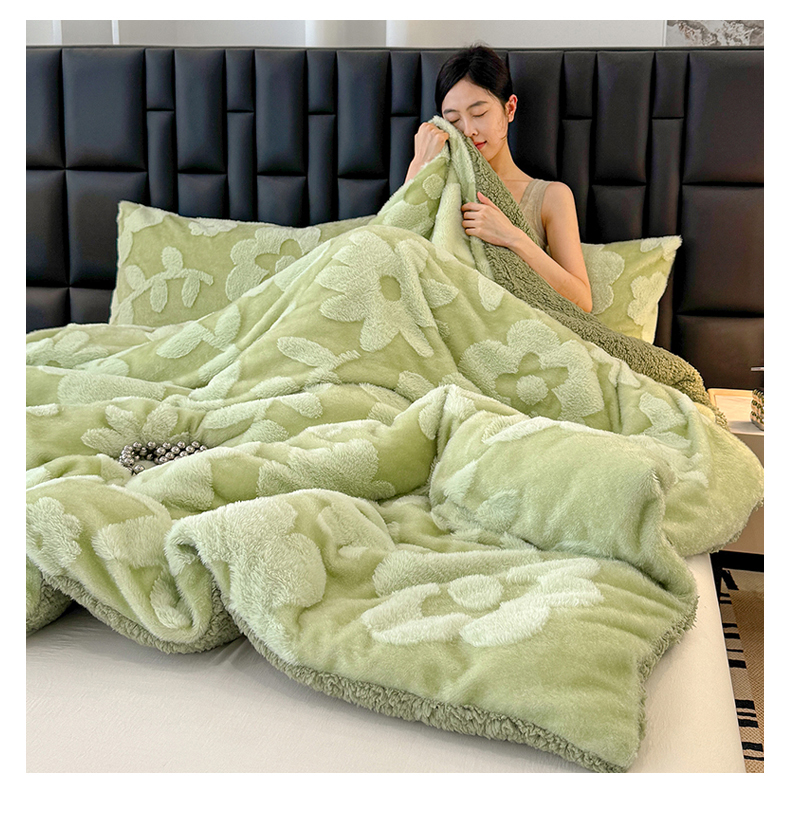 商品名称:枋梢家纺 2025新款亮丝兔毛绒兔毛提花暖居花漾羊羔绒 双层加厚保暖盖毯 居家午睡保暖毯 花漾-绿色