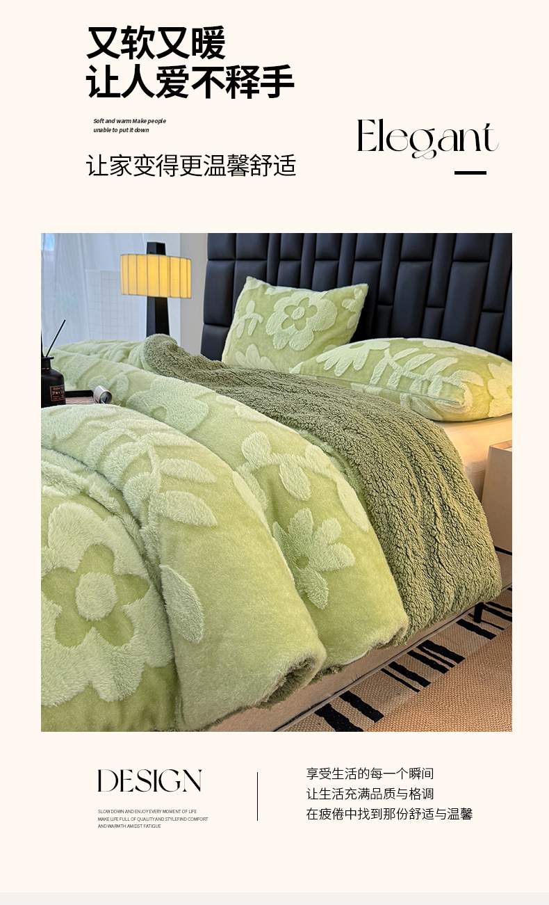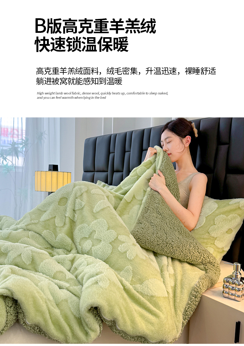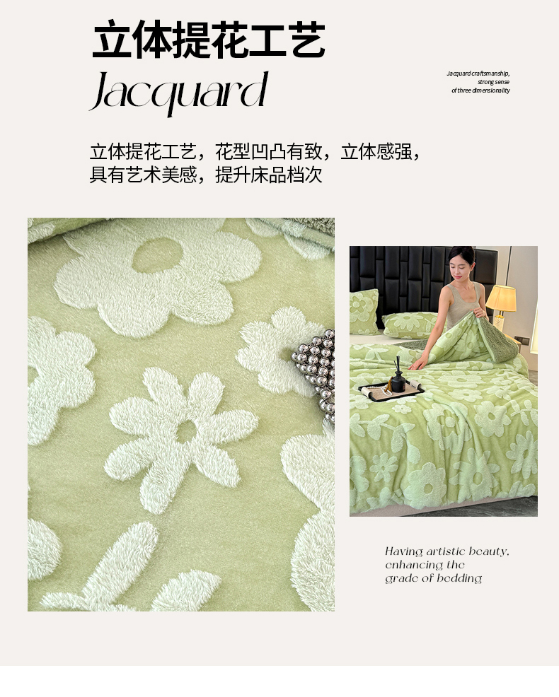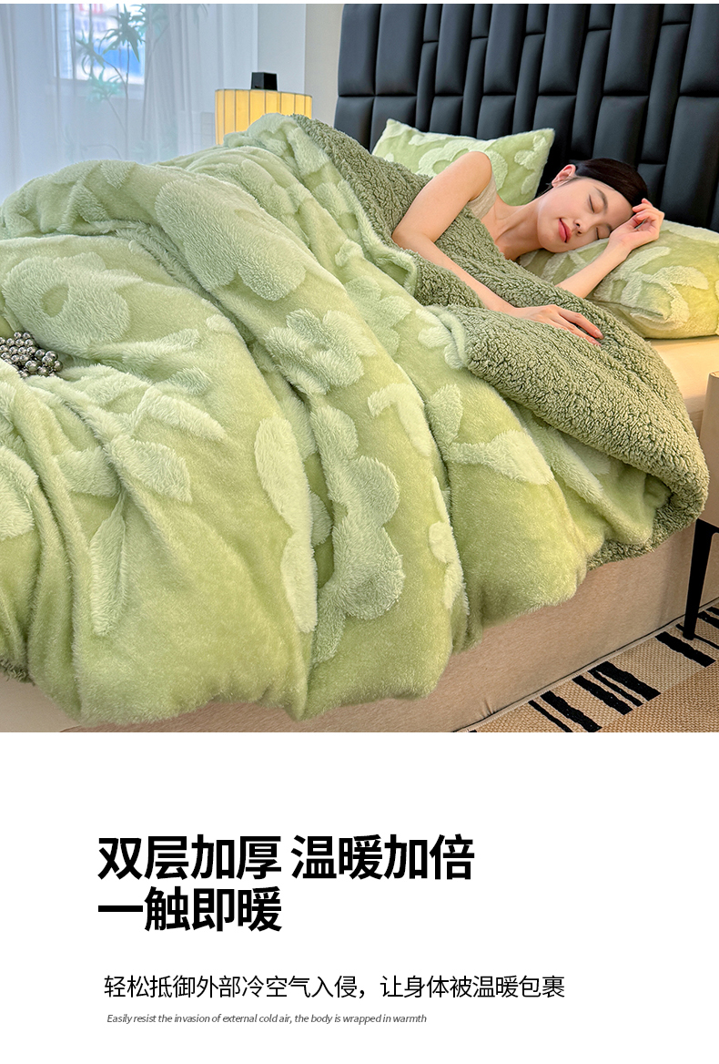 商品名称:枋梢家纺 2025新款亮丝兔毛绒兔毛提花暖居花漾羊羔绒 双层加厚保暖盖毯 居家午睡保暖毯 花漾-绿色