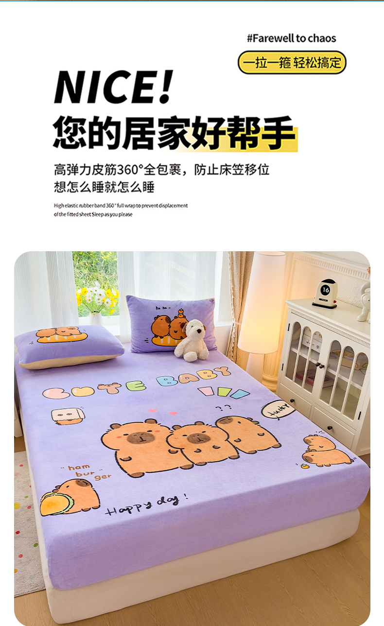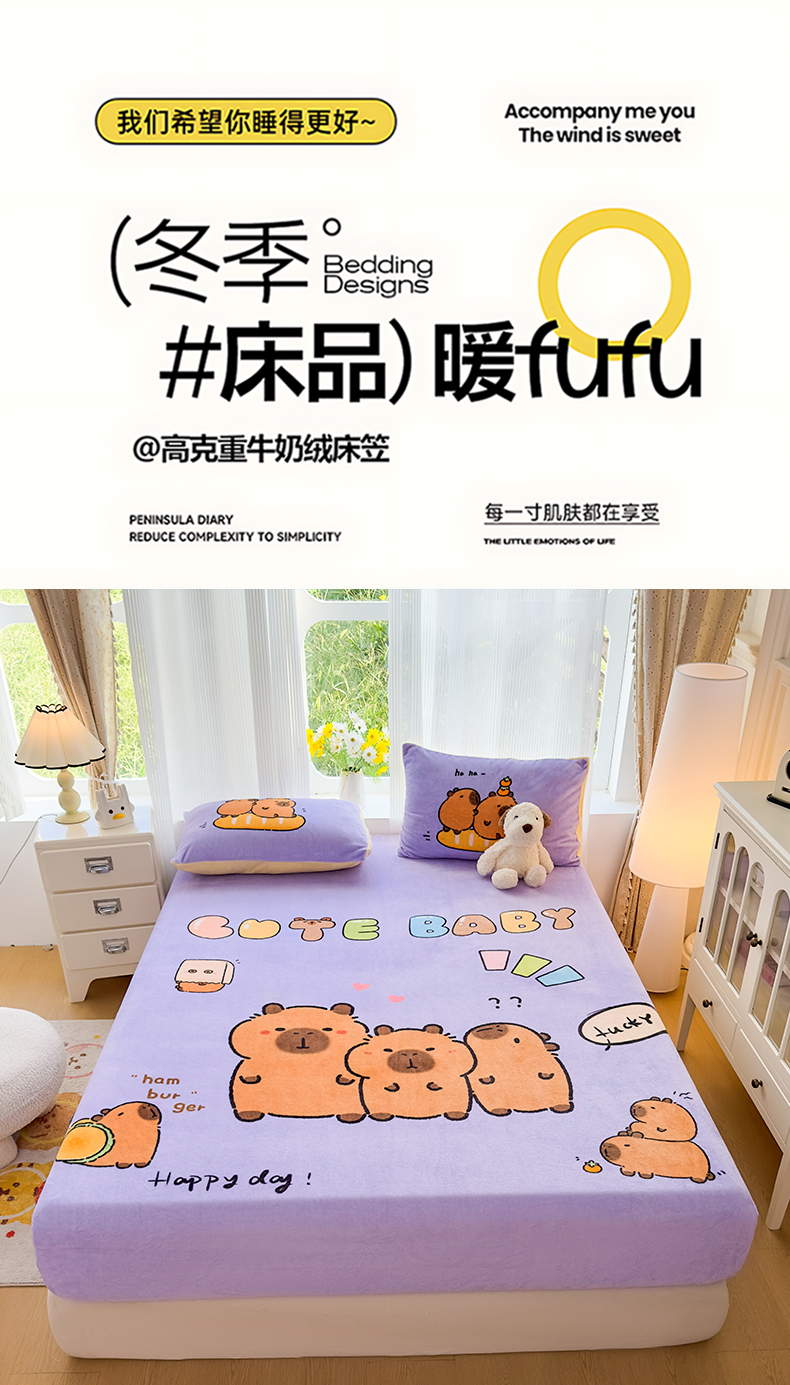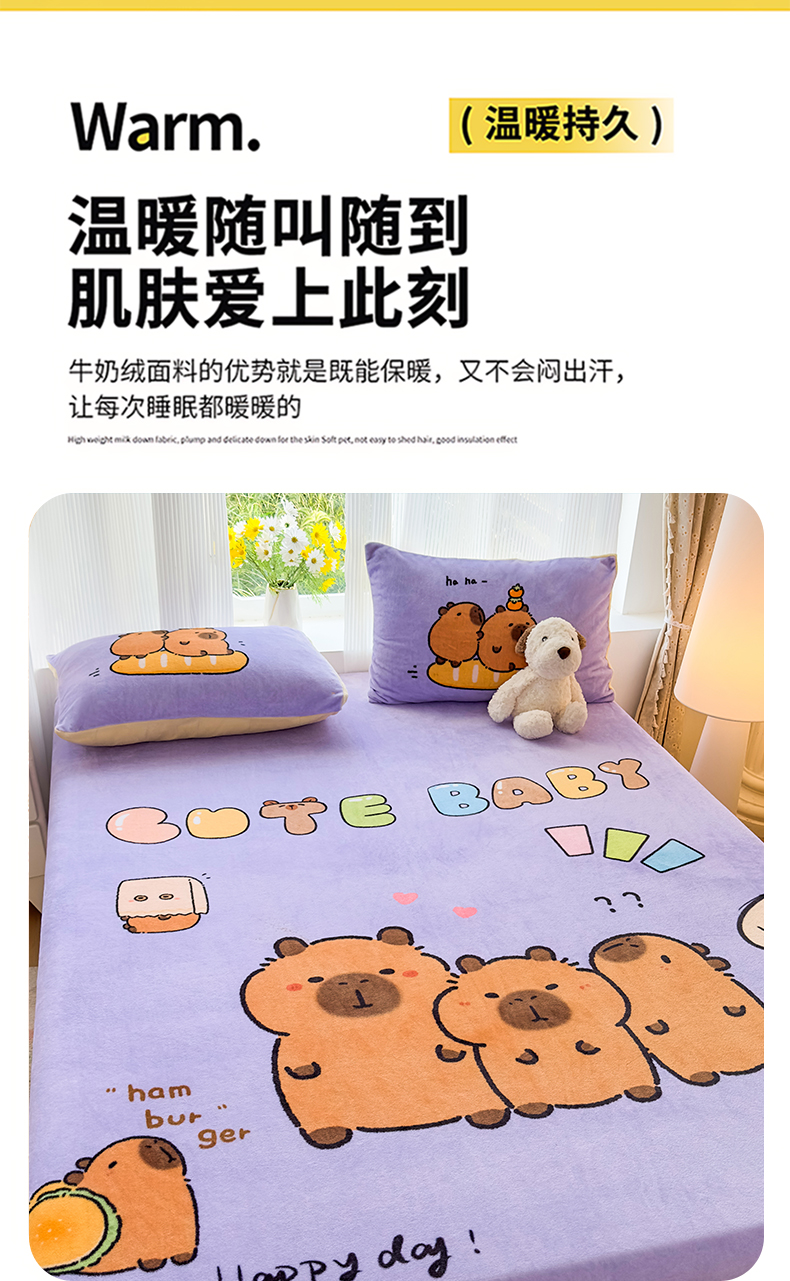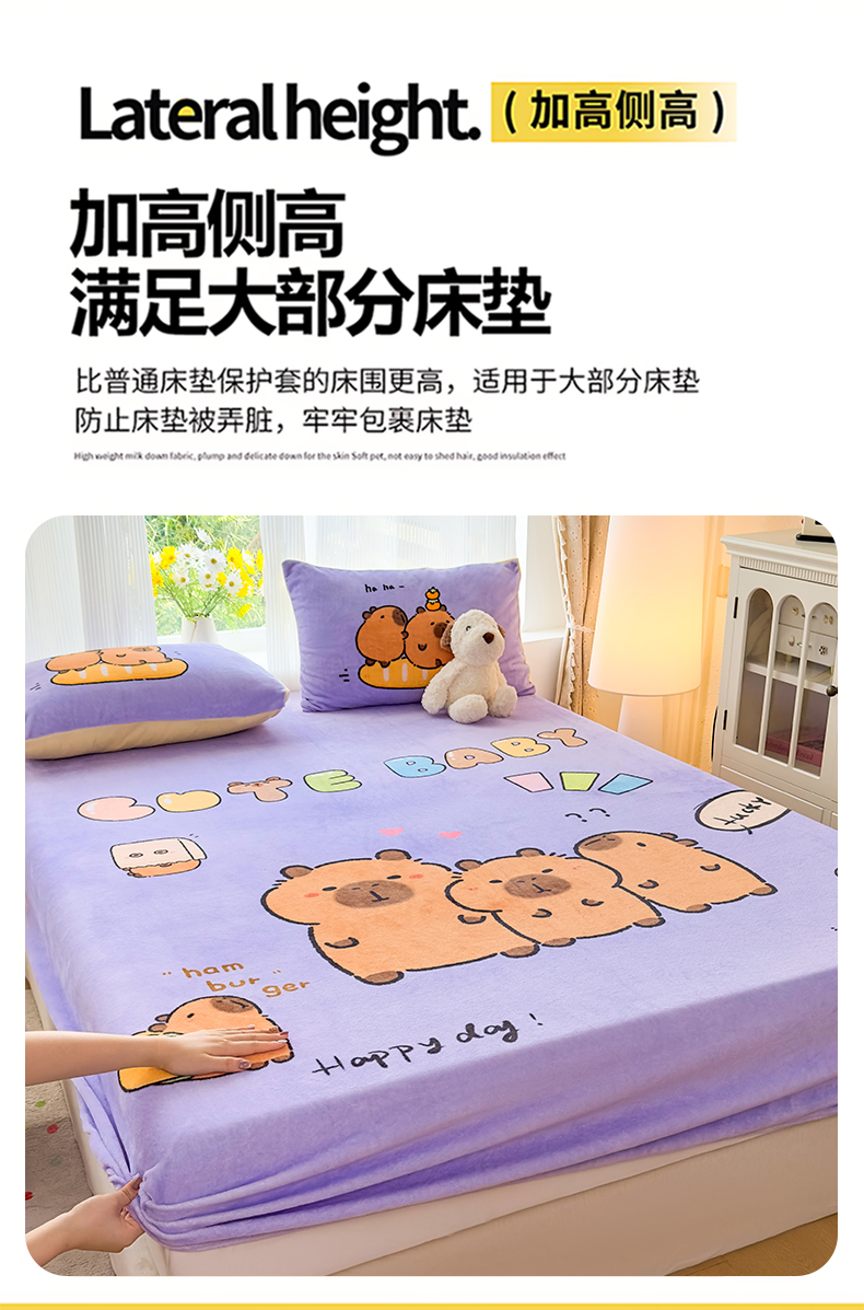 商品名称:浩诚 2025新款大版原创设计卡皮巴拉高克重牛奶绒单床笠 紫色巴拉