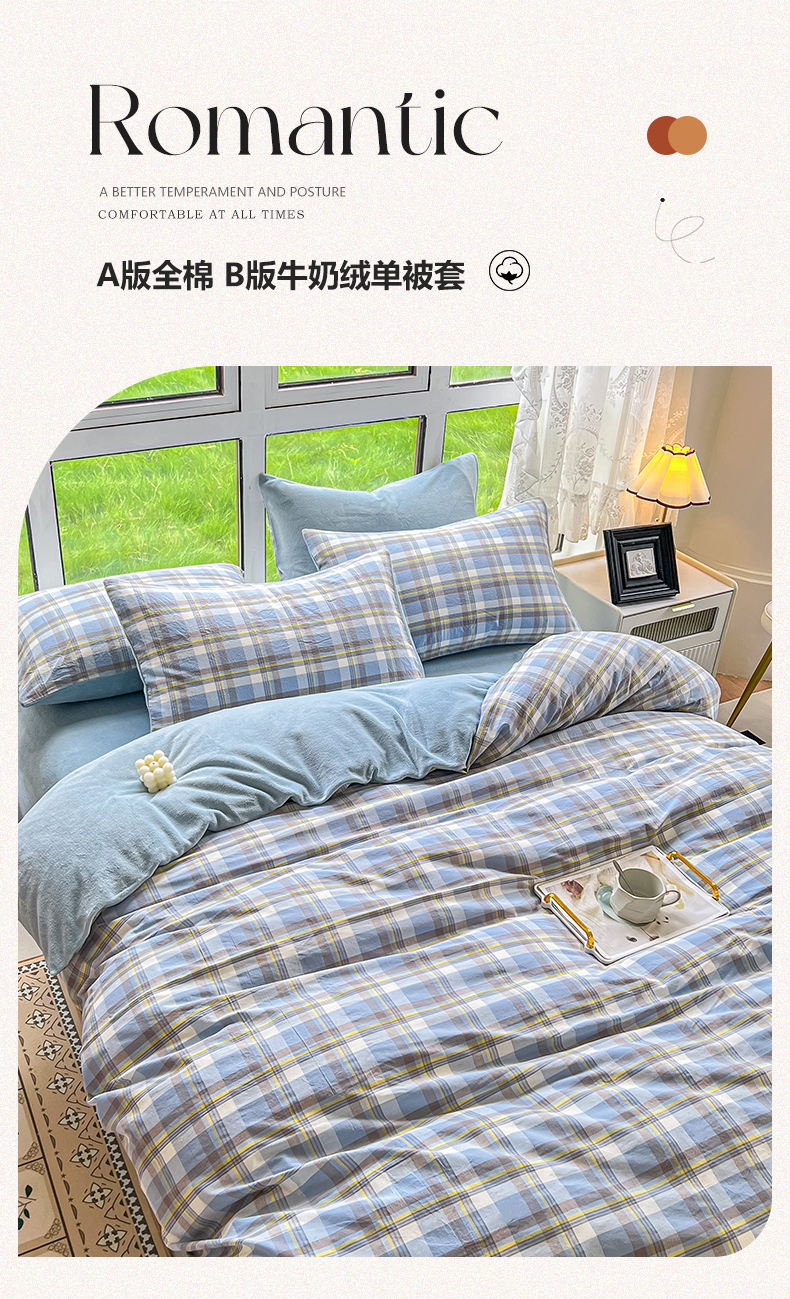 • 91家纺网 家纺一手货源 找家纺 柠萌家居 2025新款无印良品风双拼全棉色织水洗棉加牛奶绒单品被套简约风全棉拼牛奶绒单被套 棉+绒-简兮蓝