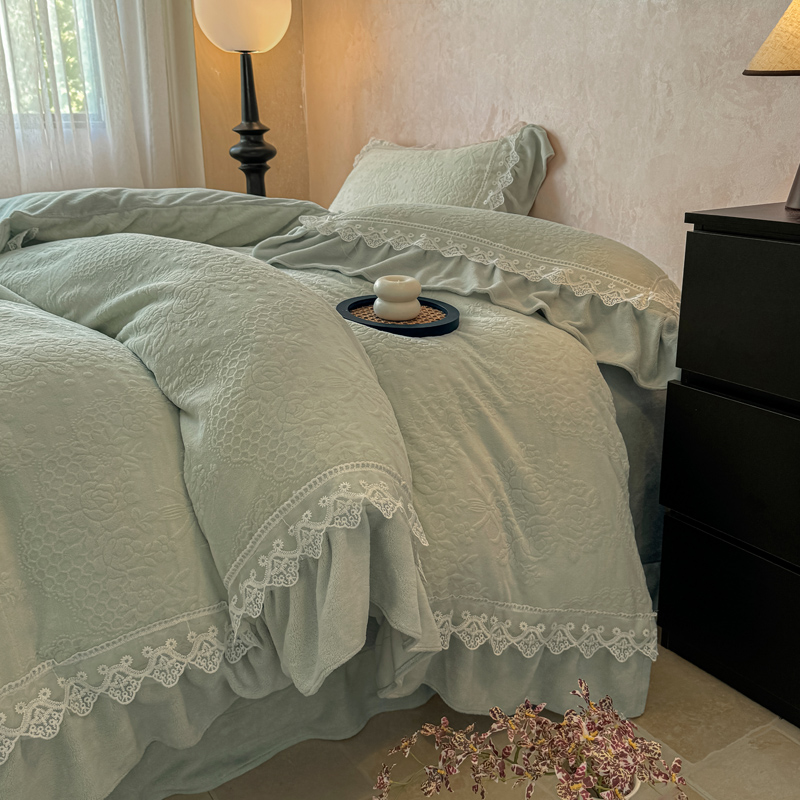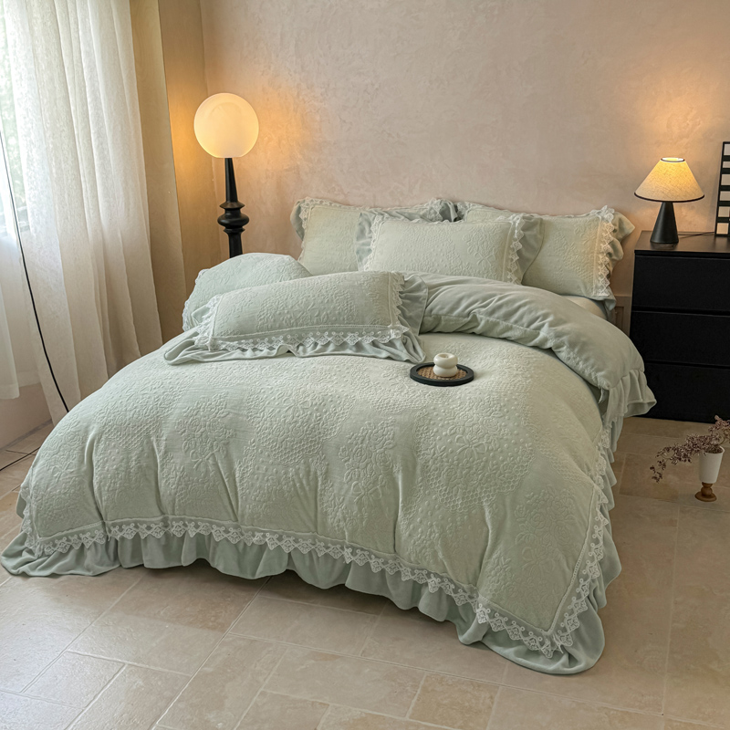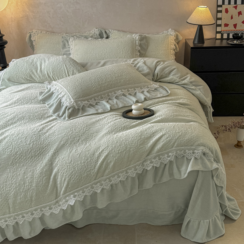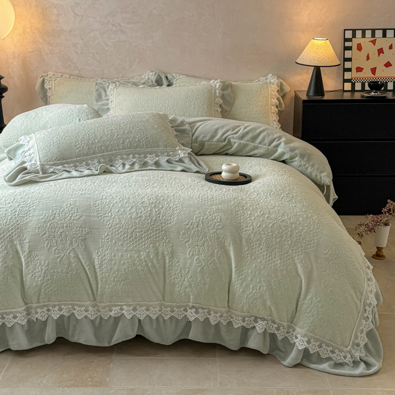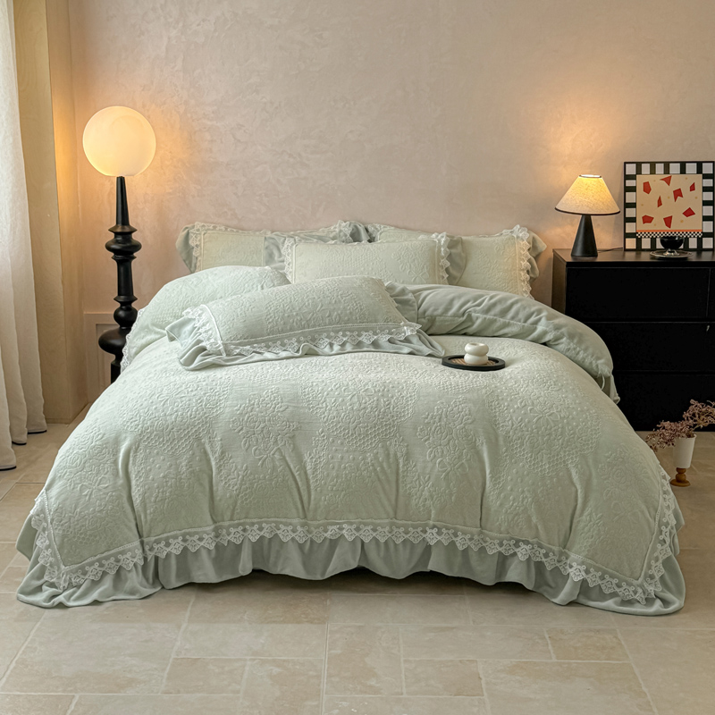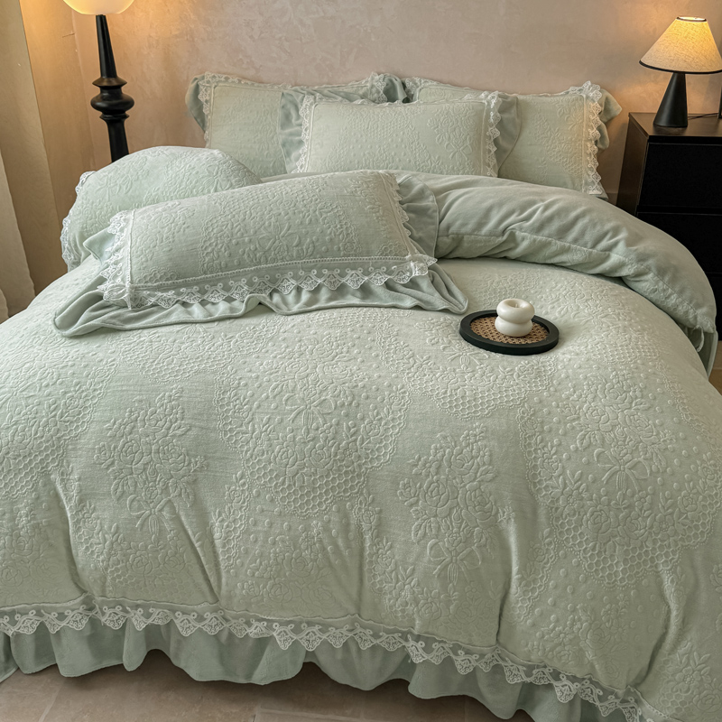 宝薇家纺 2025新款全消光雕花工艺法式花边牛奶绒宝宝绒四件套-艾薇儿 艾薇儿-绿