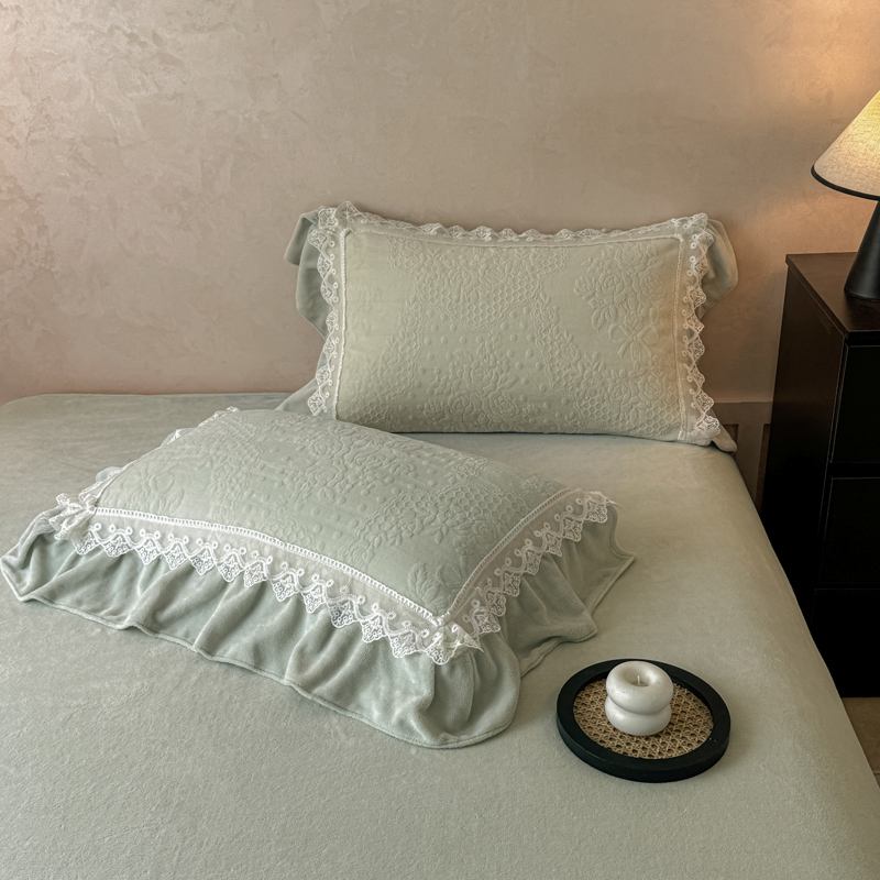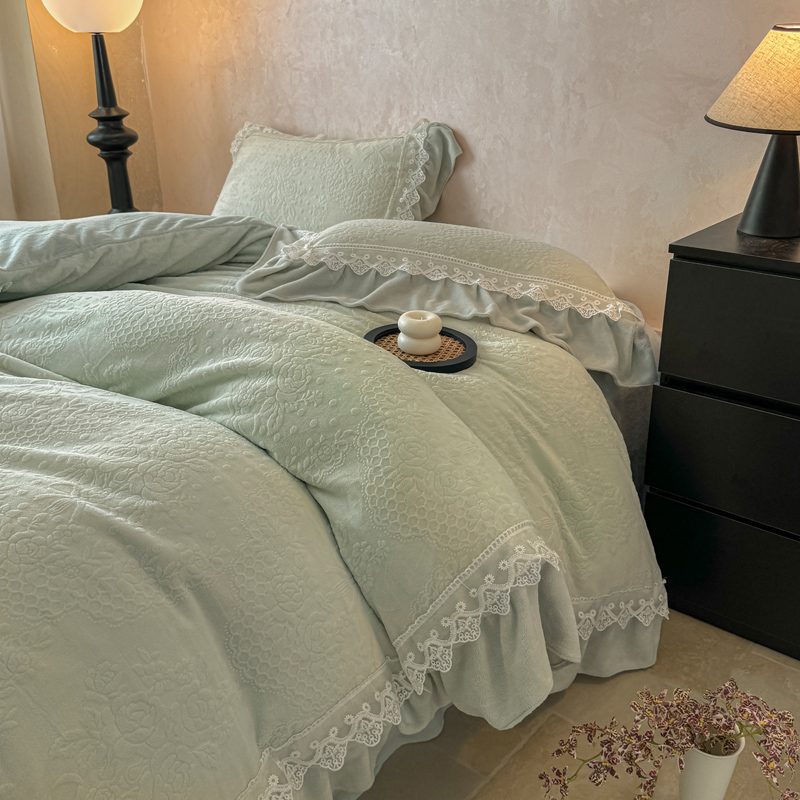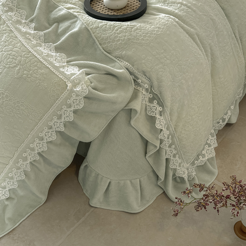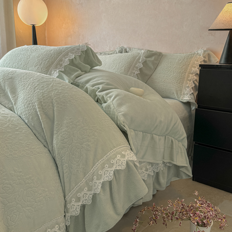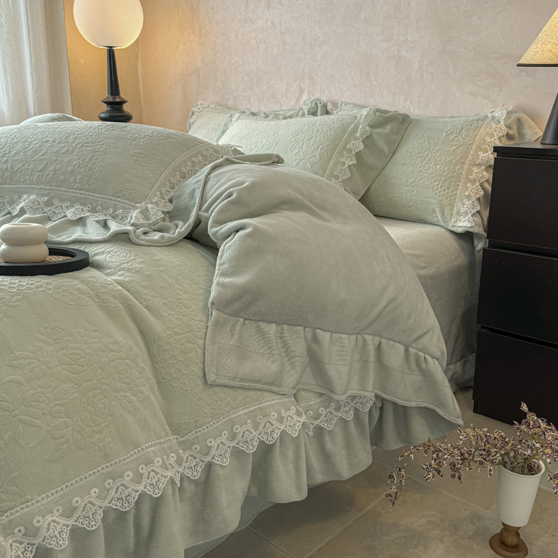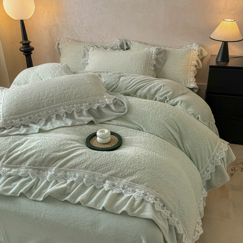 宝薇家纺 2025新款全消光雕花工艺法式花边牛奶绒宝宝绒四件套-艾薇儿 艾薇儿-绿