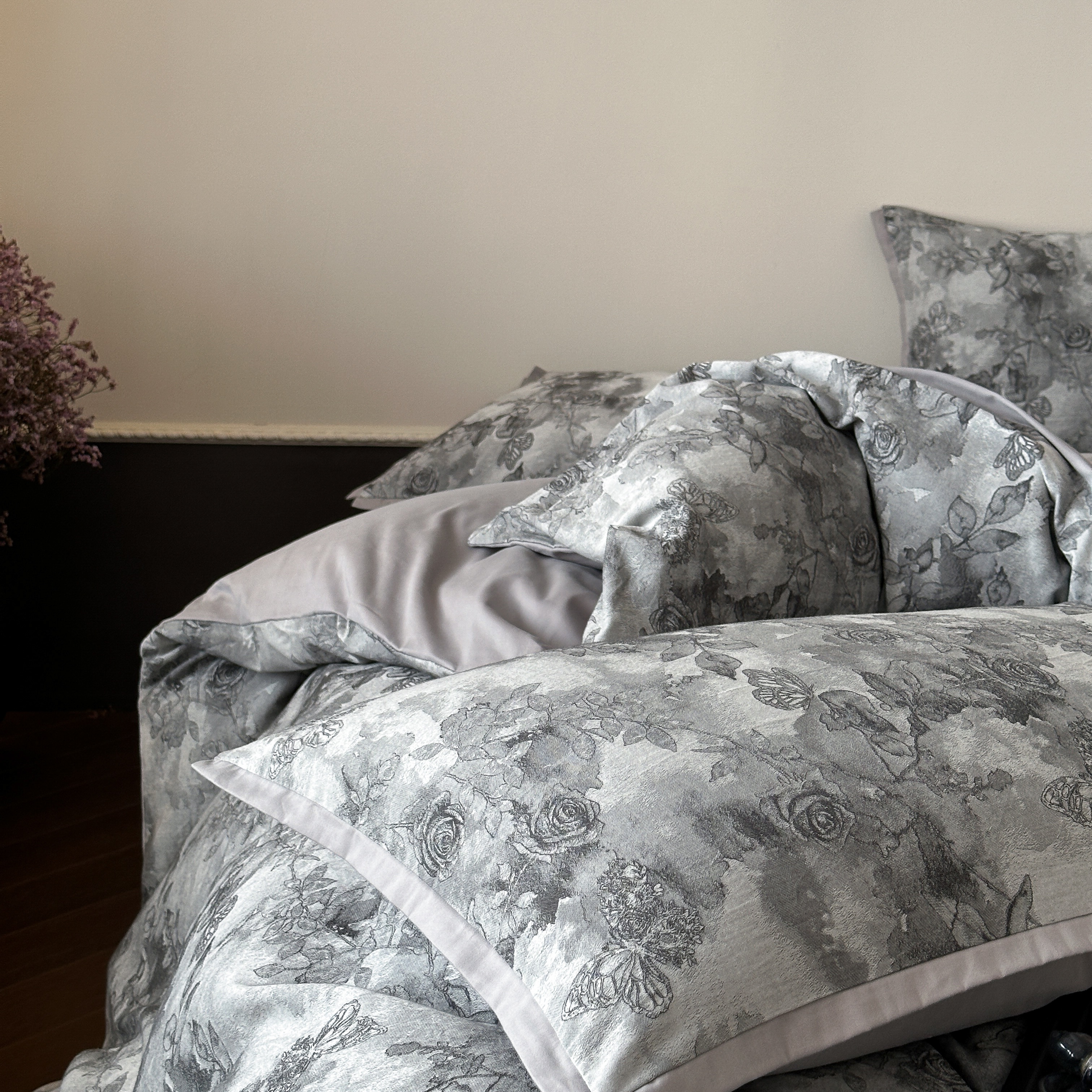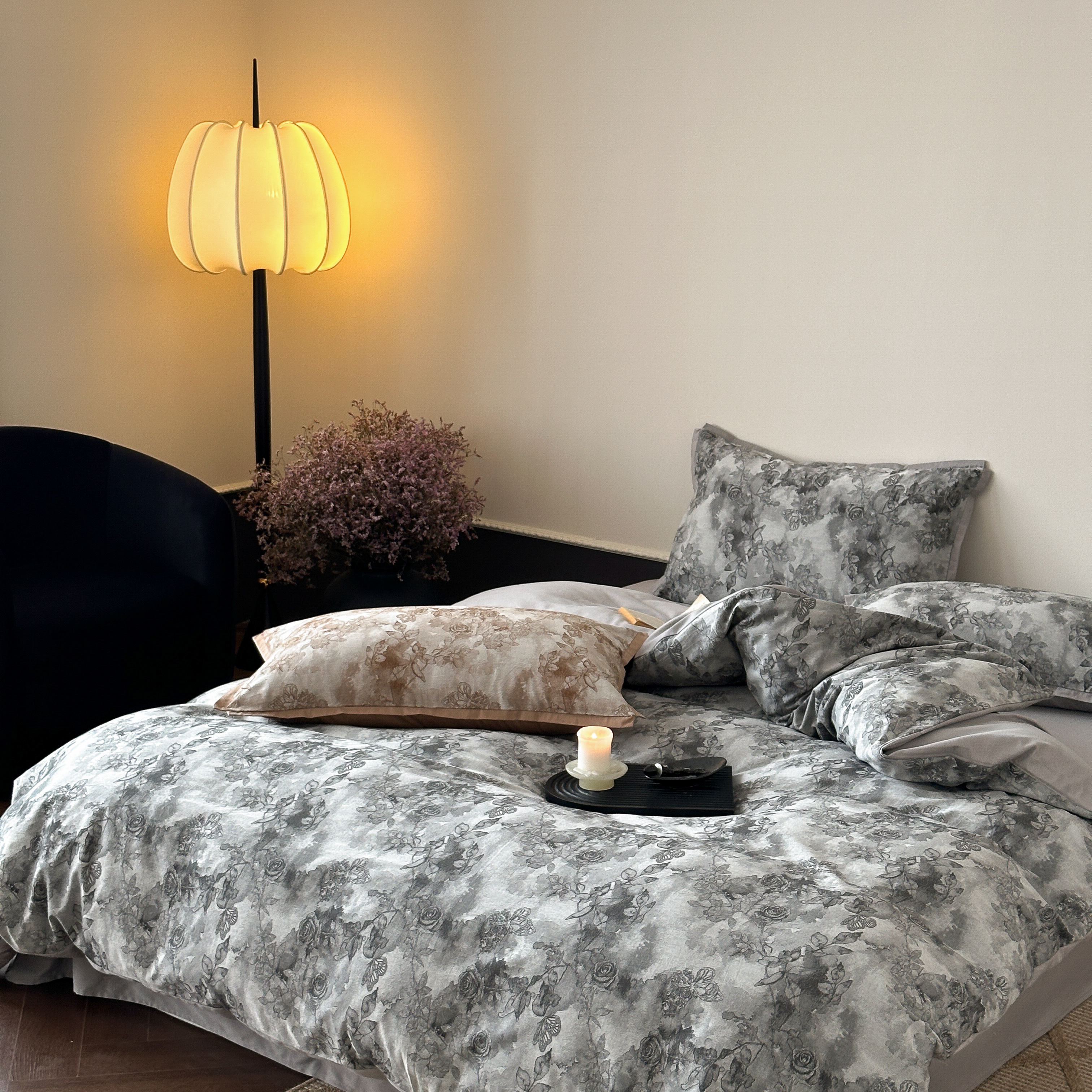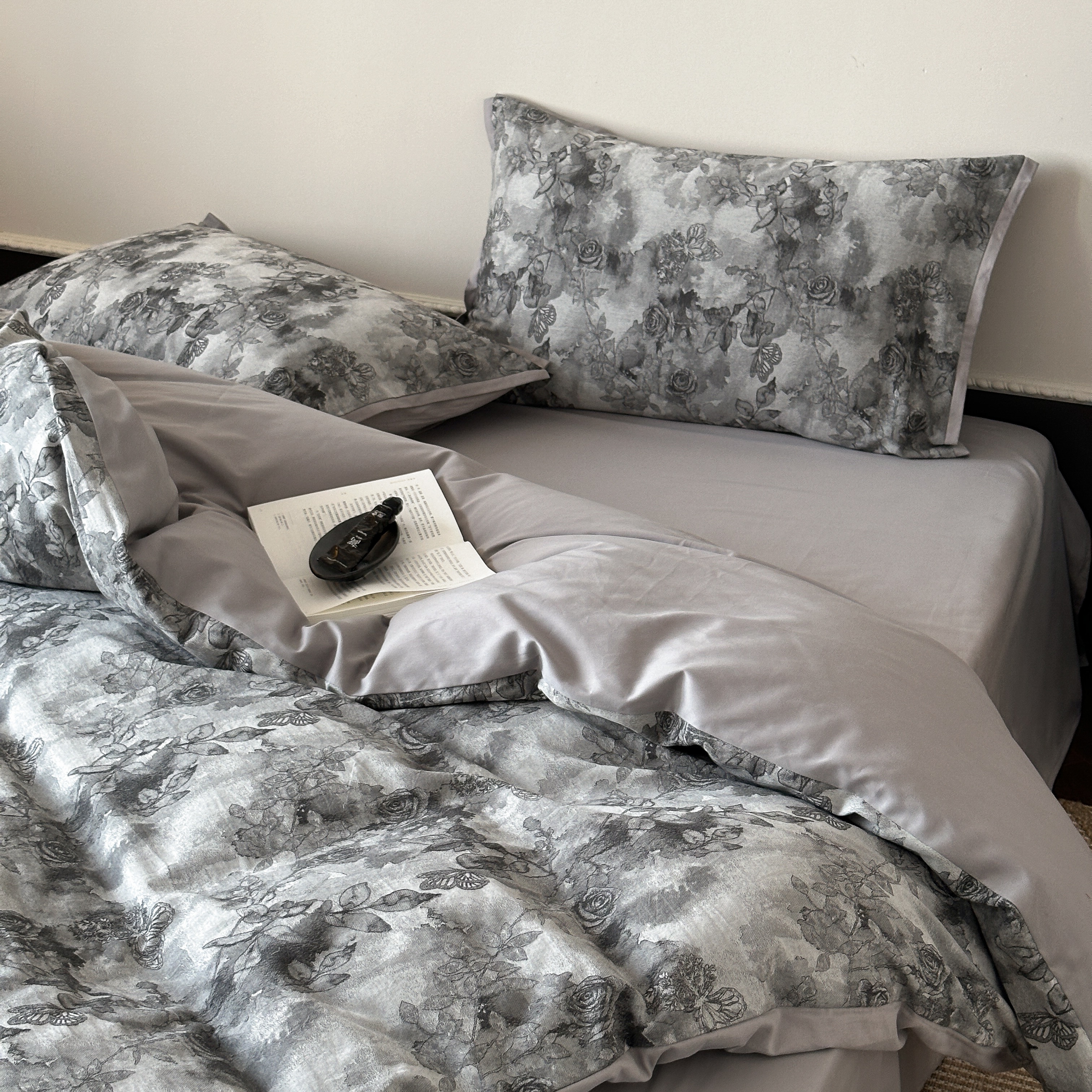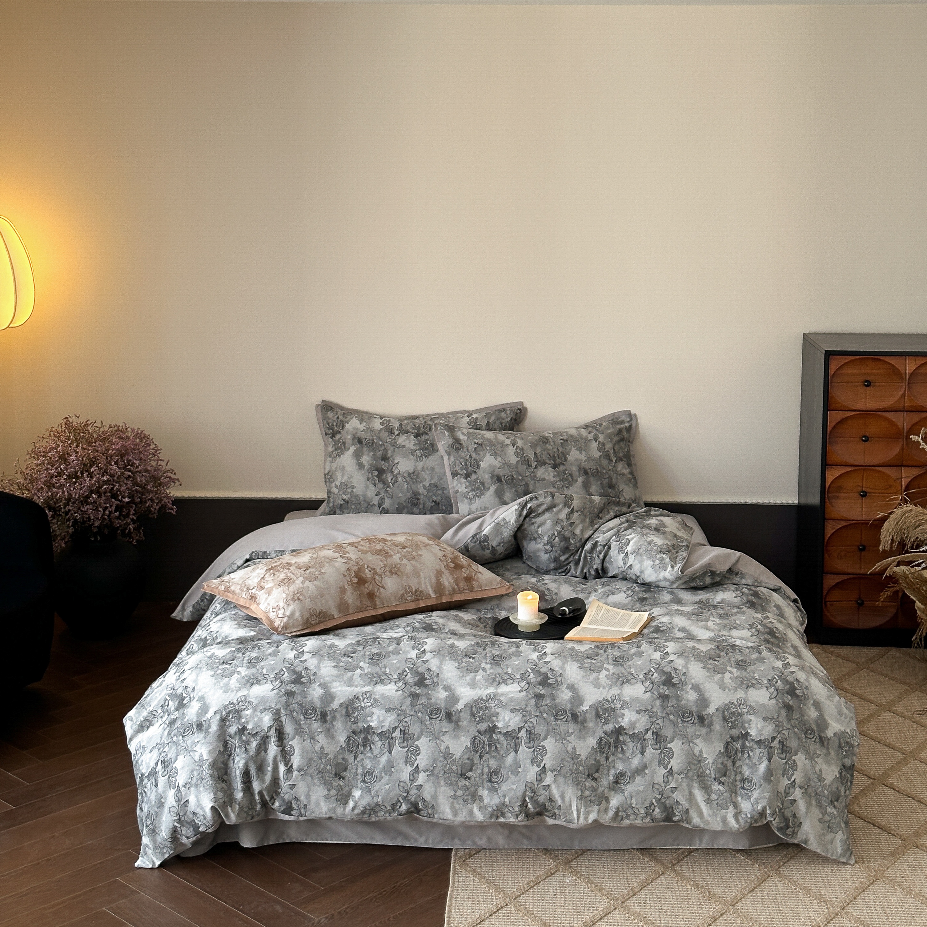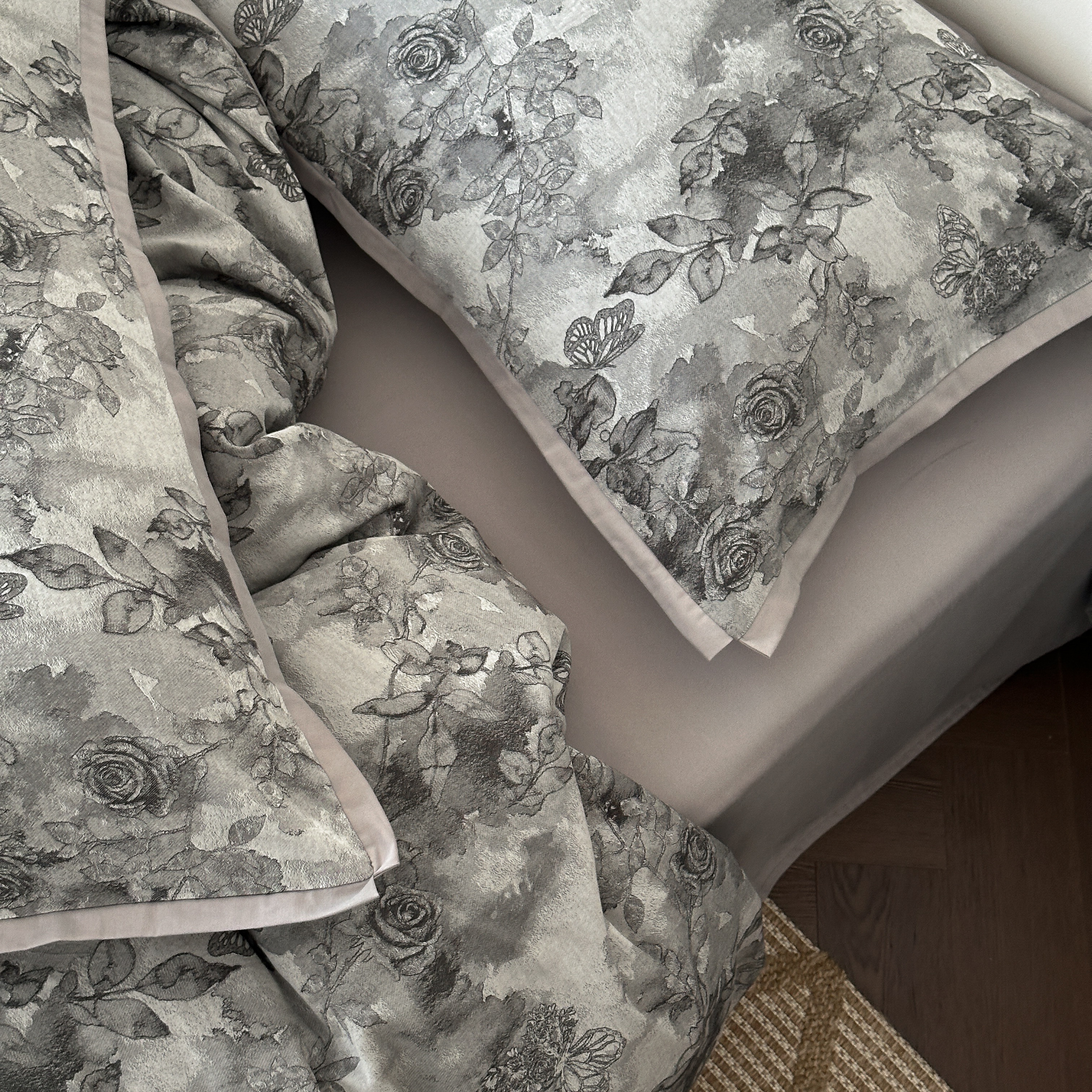 商品名称:旷野 2025新款双色提花100支磨毛四件套-薄雾玫瑰 薄雾玫瑰-乌木灰