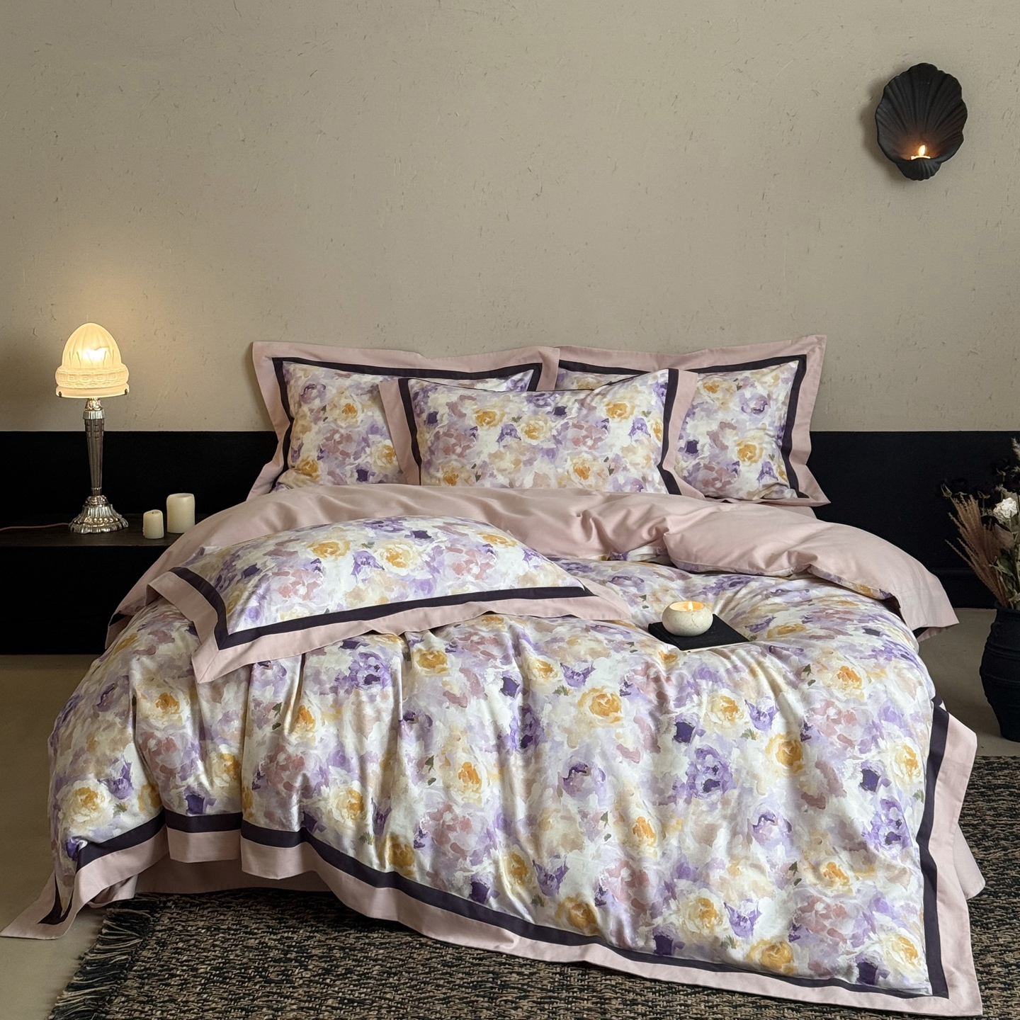 商品名称:多乐娜 2025新款100S长绒棉纯棉陶瓷磨毛法式油画风数码印花双拼角工艺款四件套 雾影花间