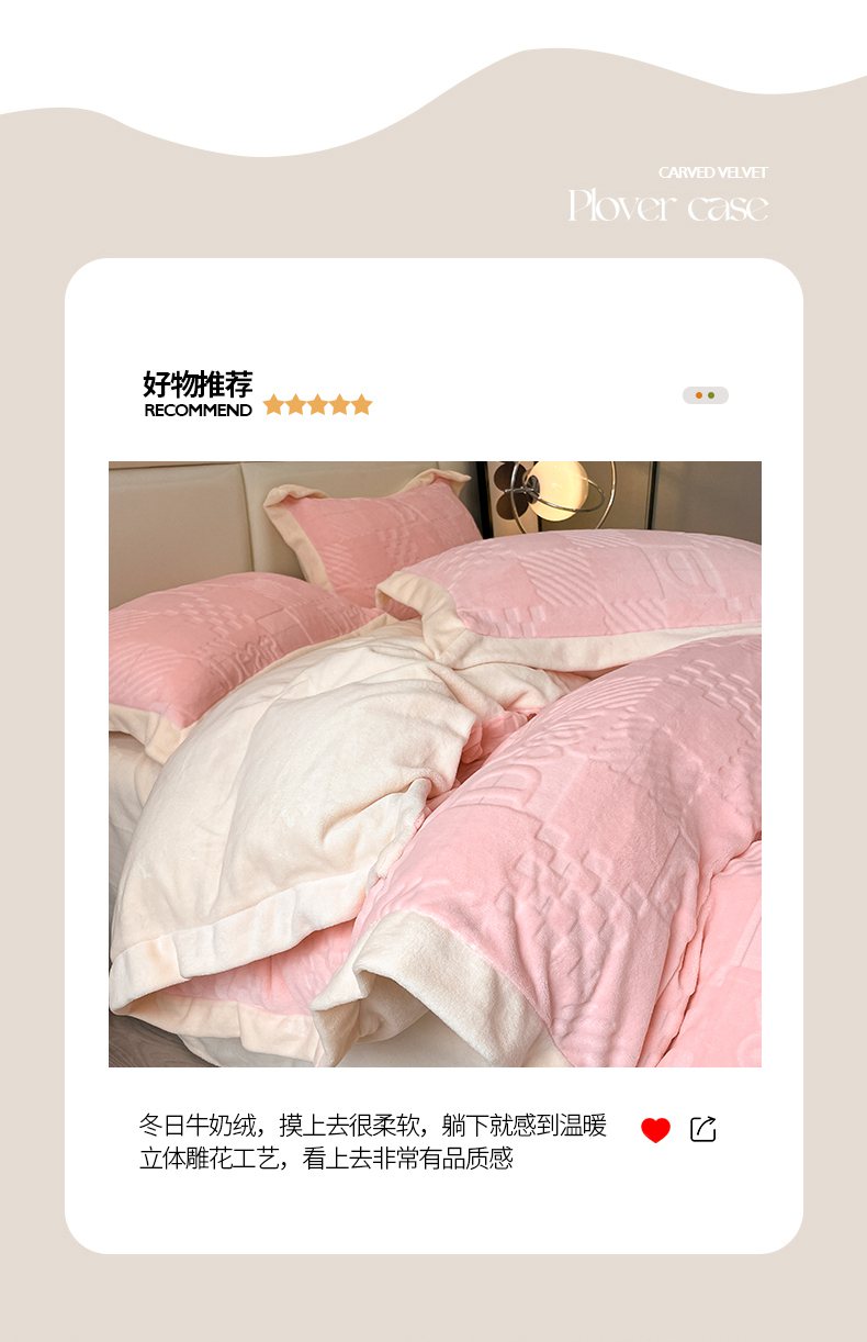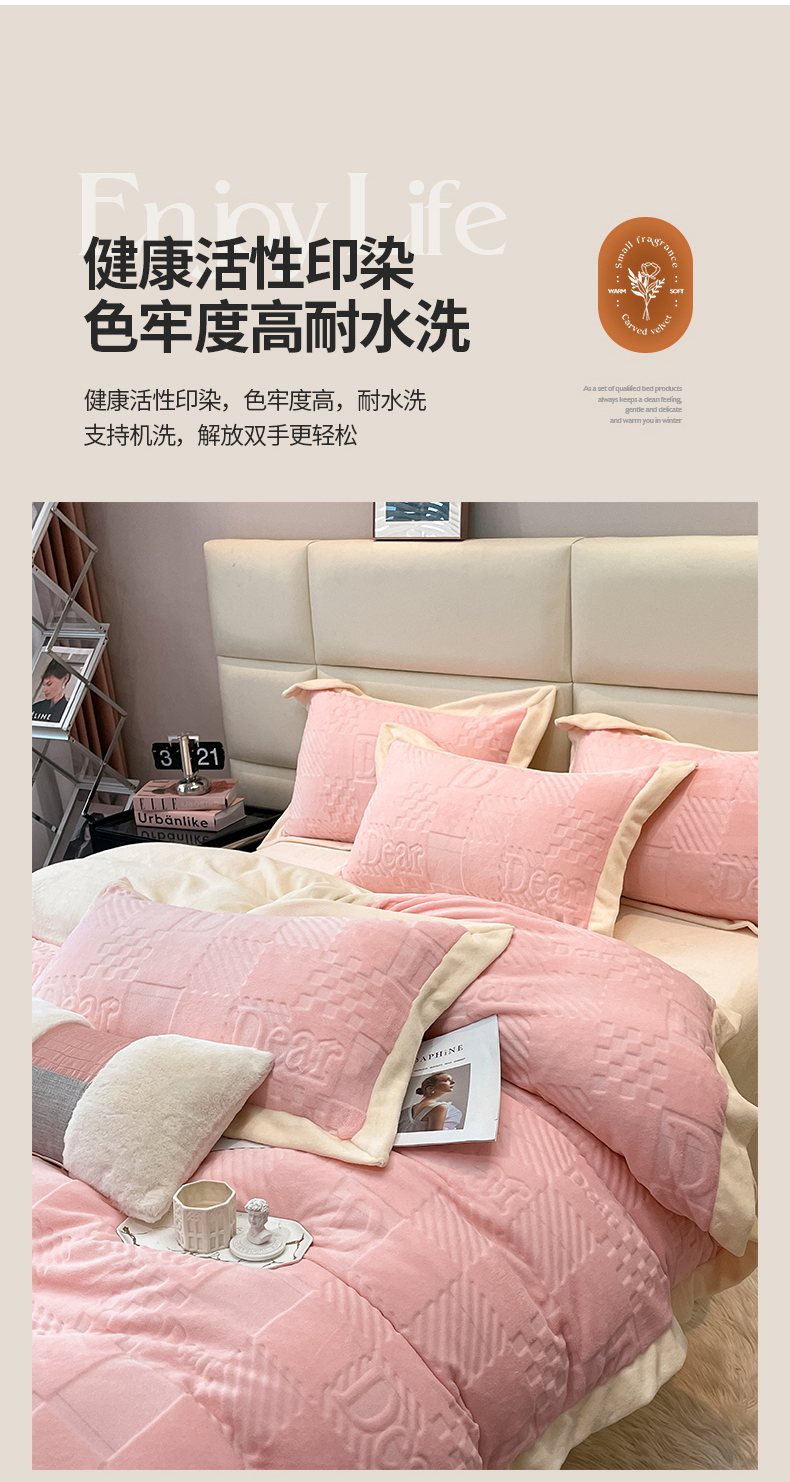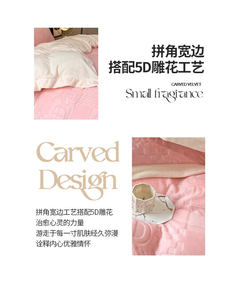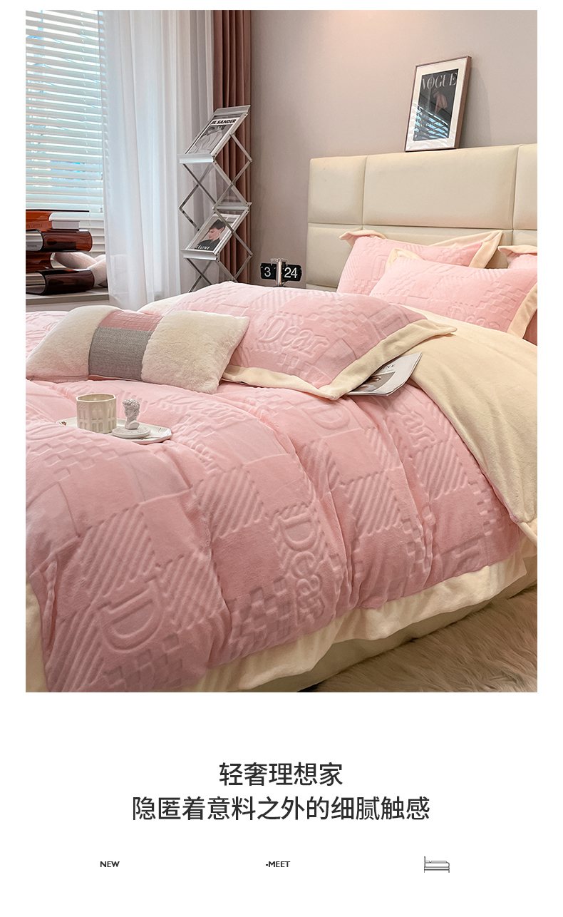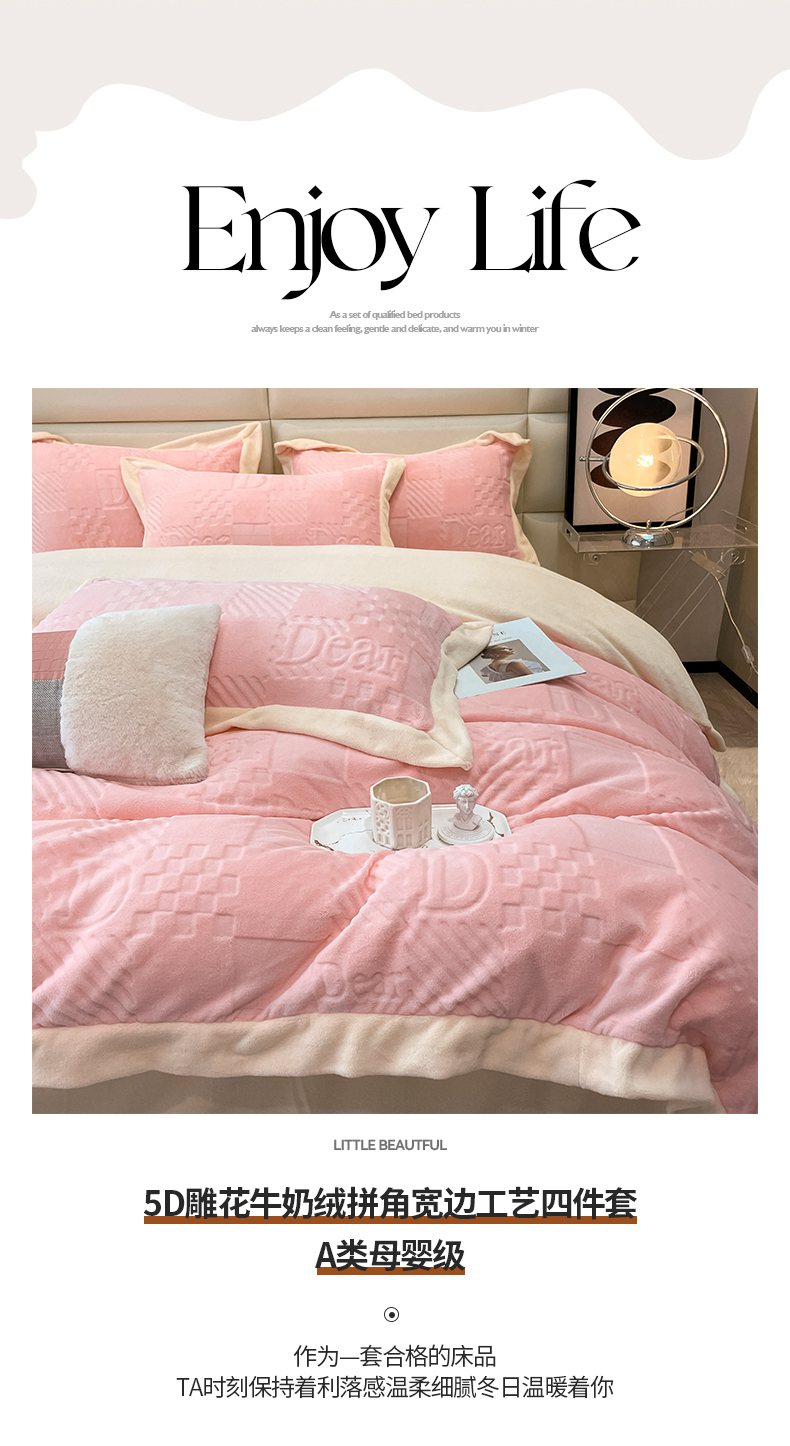 当前位置: 91家纺网 > 商品网购 > 床品套件 > 四件套 > 牛奶绒四件套 > 艾佳 2025新款5D雕花牛奶绒拼角宽边工艺四件套-唯爱系列 唯爱-蜜桃粉白