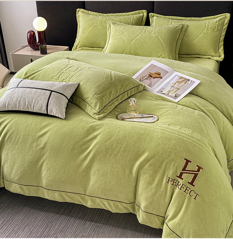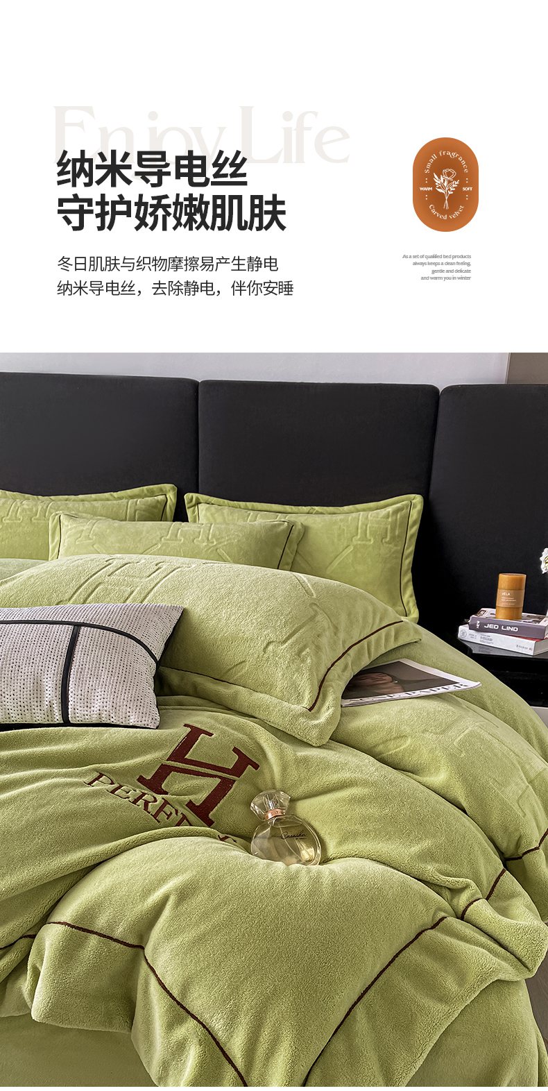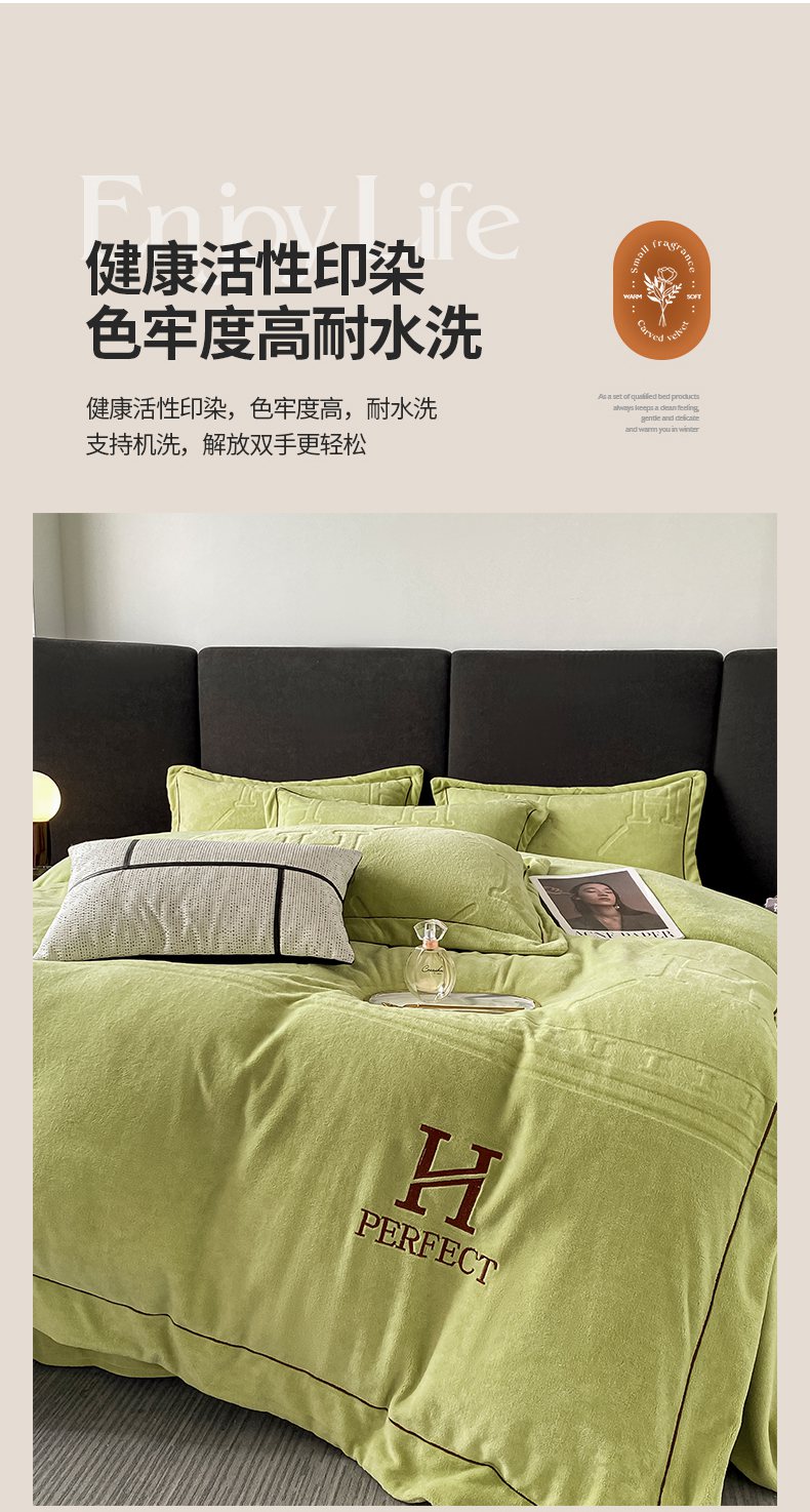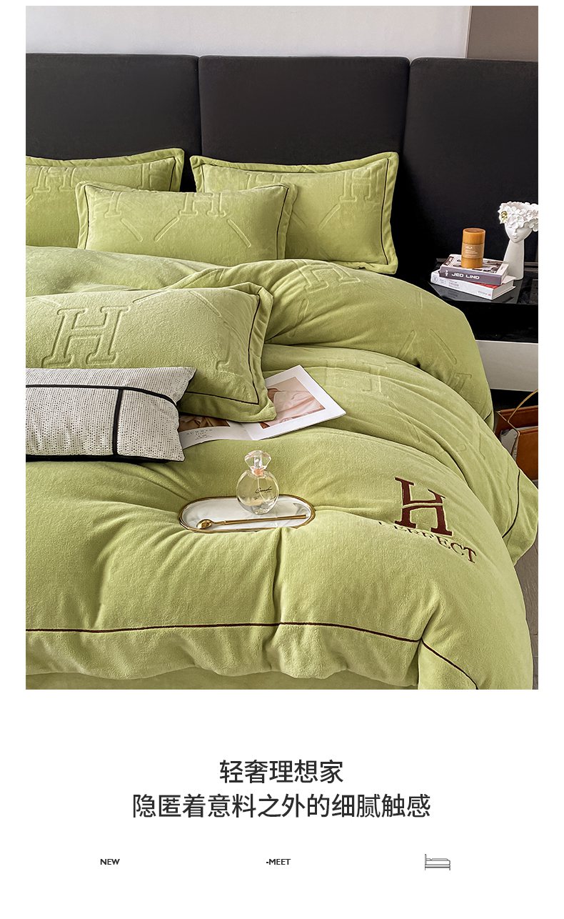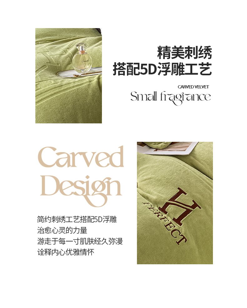 当前位置: 91家纺网 > 商品网购 > 床品套件 > 四件套 > 牛奶绒四件套 > 艾佳 2025新款A类全高克重雕花烂花刺绣牛奶绒四件套-小H系列 小H奶油绿