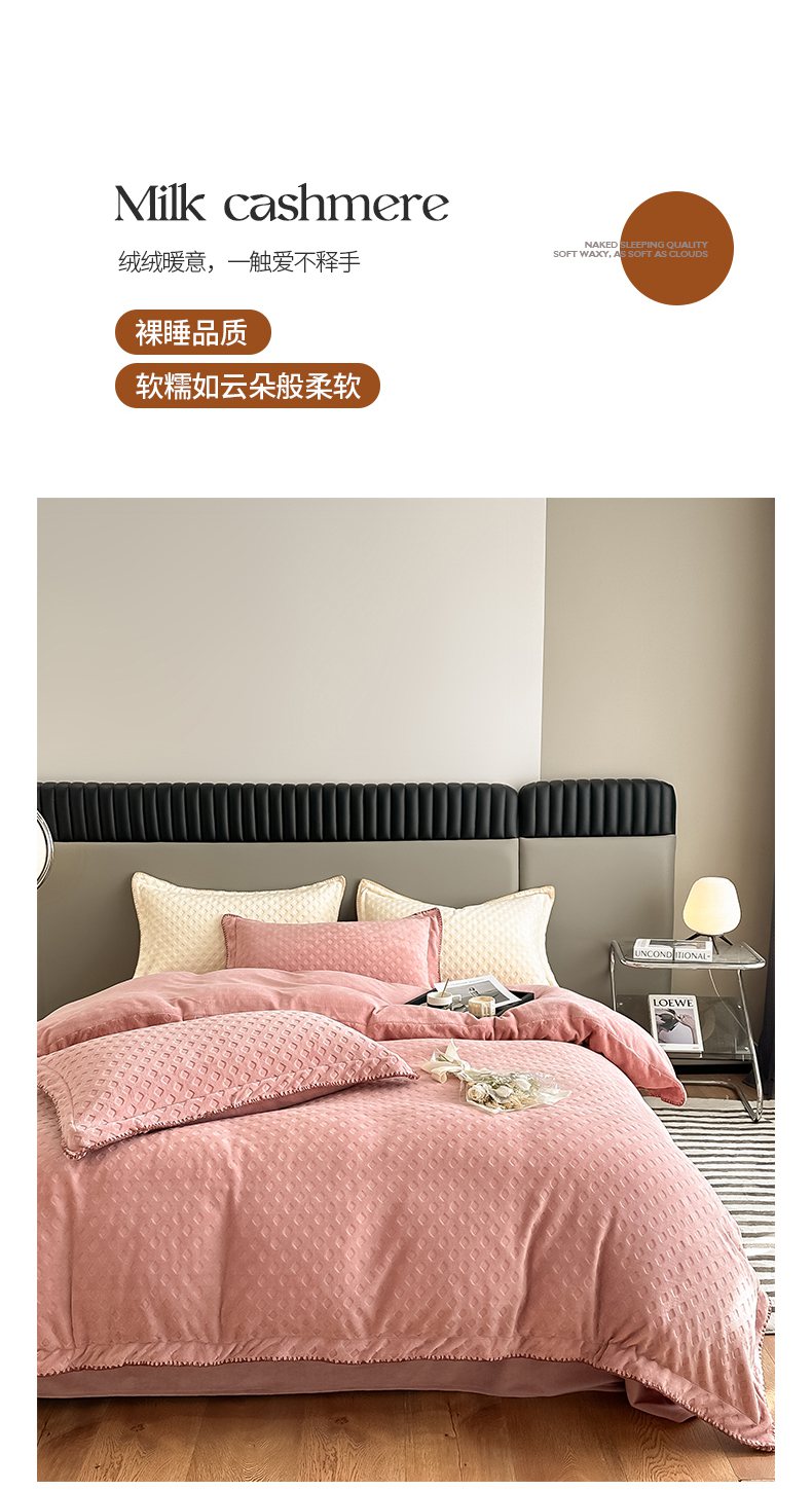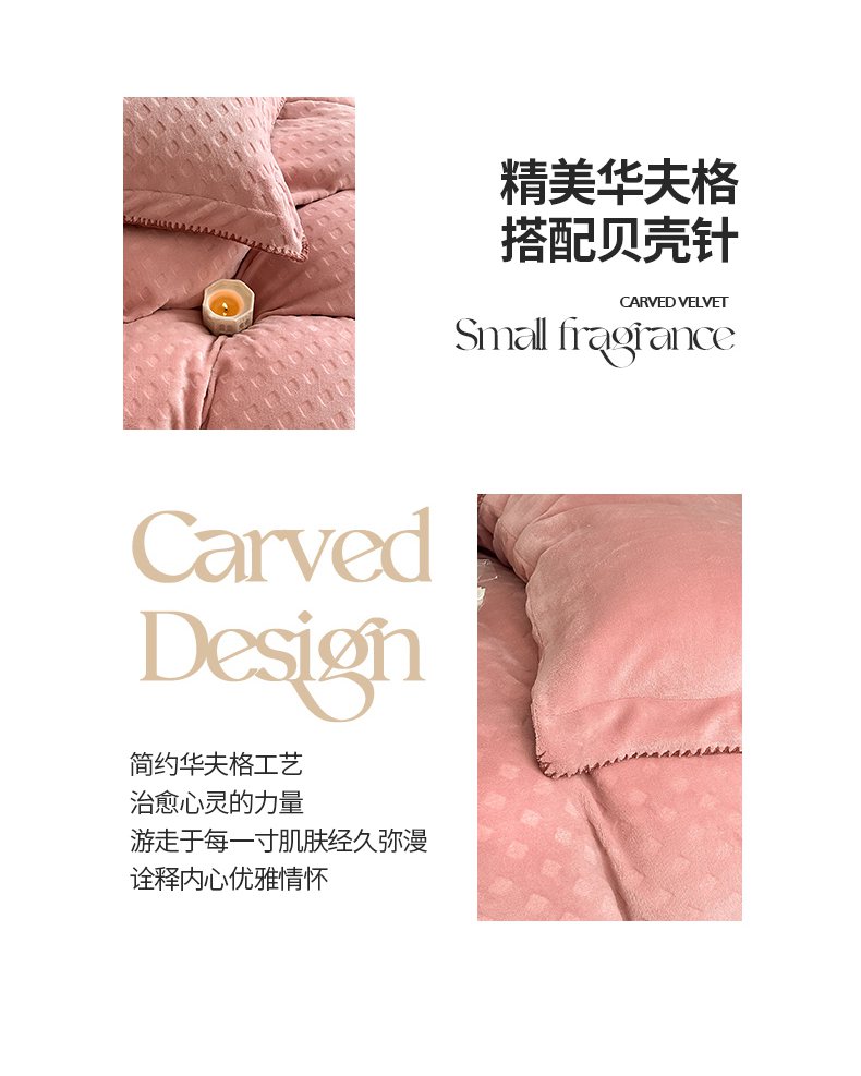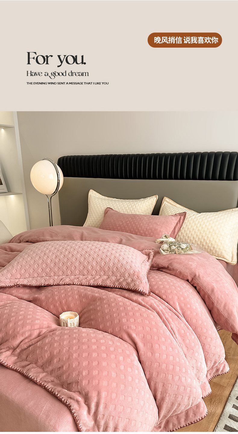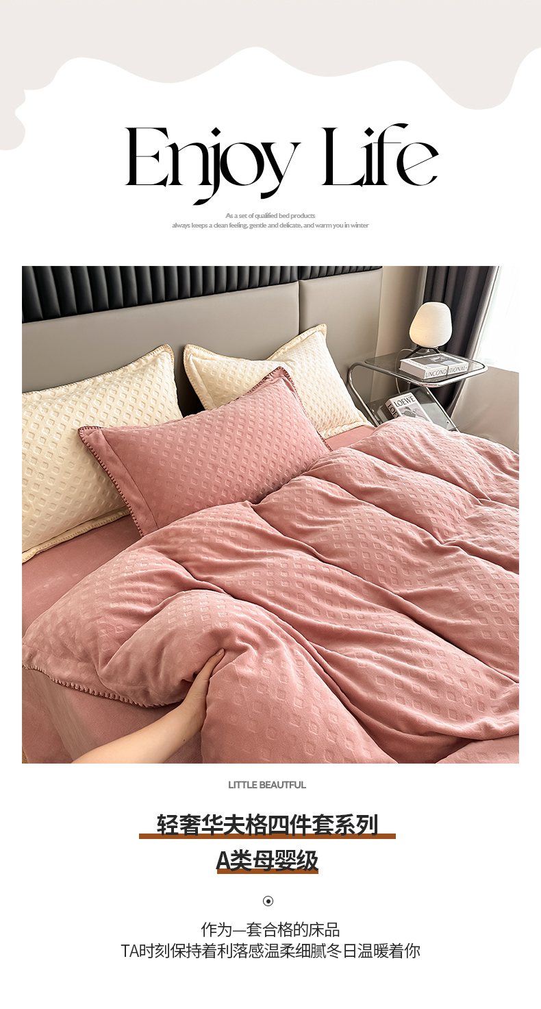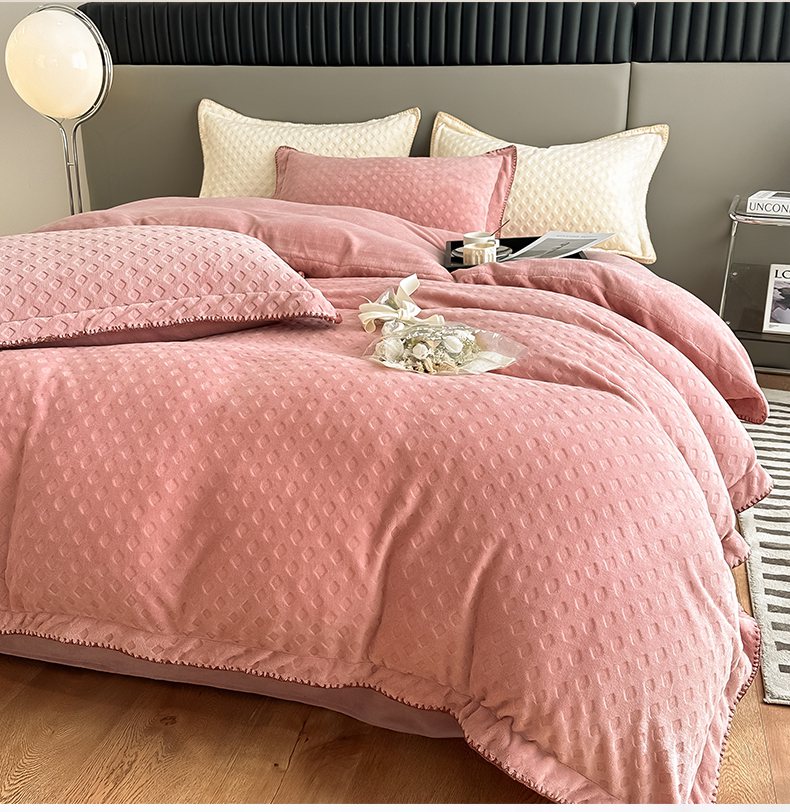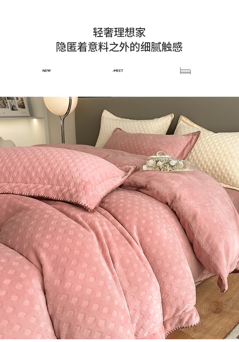 当前位置: 91家纺网 > 商品网购 > 床品套件 > 四件套 > 牛奶绒四件套 > 艾佳 2025新款华夫格高克重牛奶绒雕花三角贝壳边工艺加厚保暖四件套 华夫格藕粉