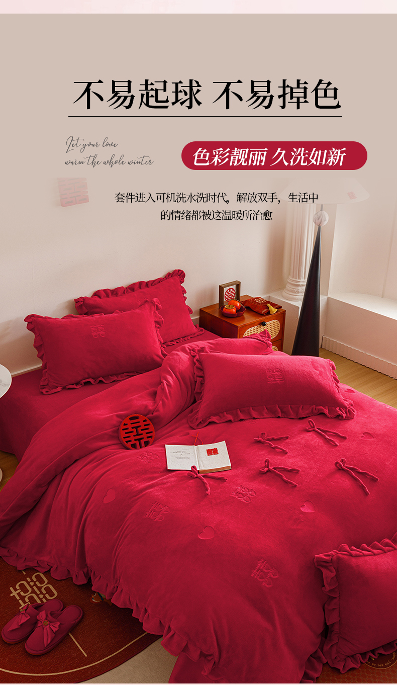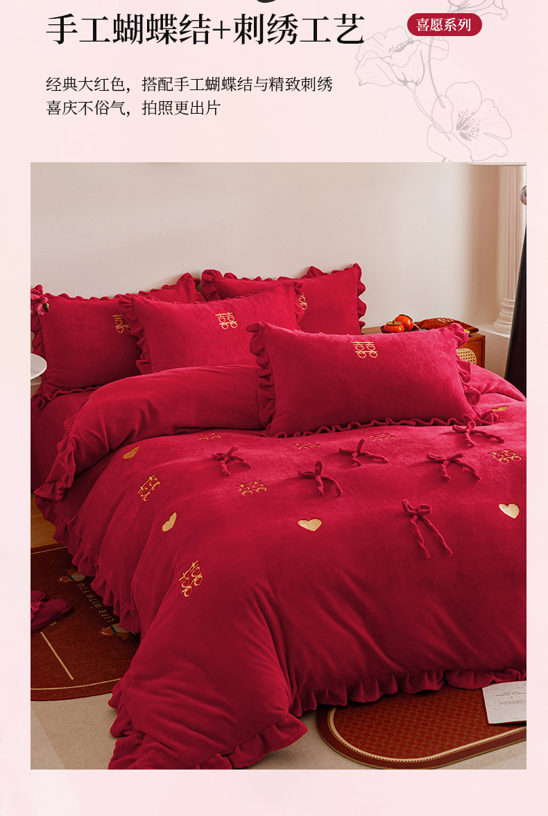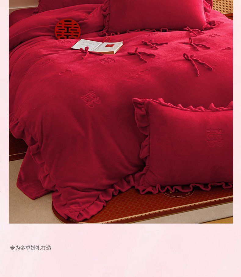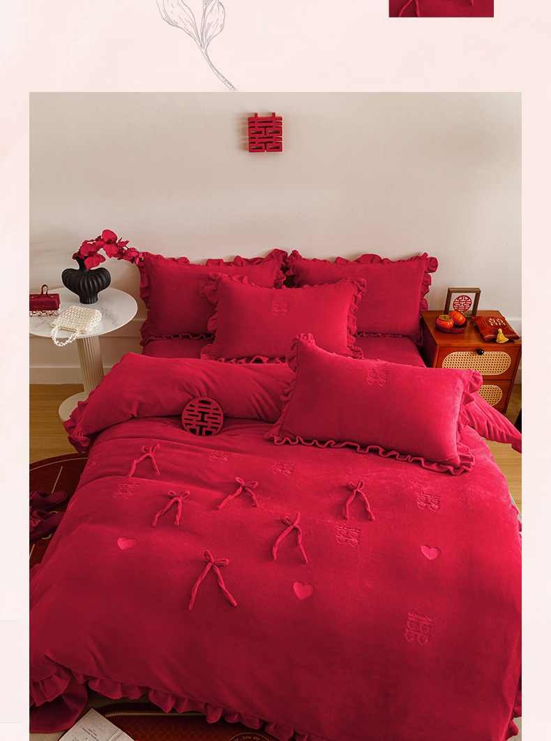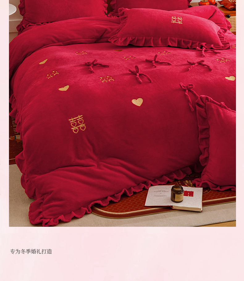 商品名称:苏源家居 2025新款婚庆加厚牛奶绒荷叶边刺绣结婚四件套 绒-喜愿-金色