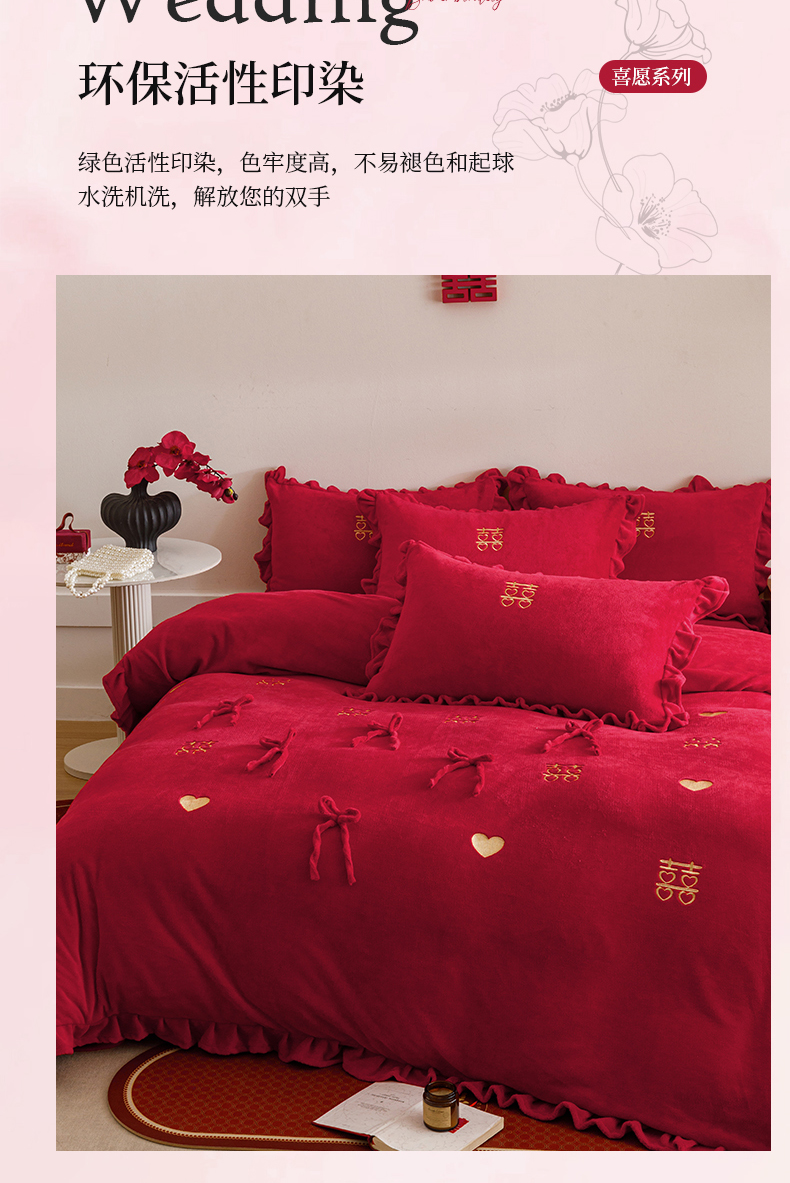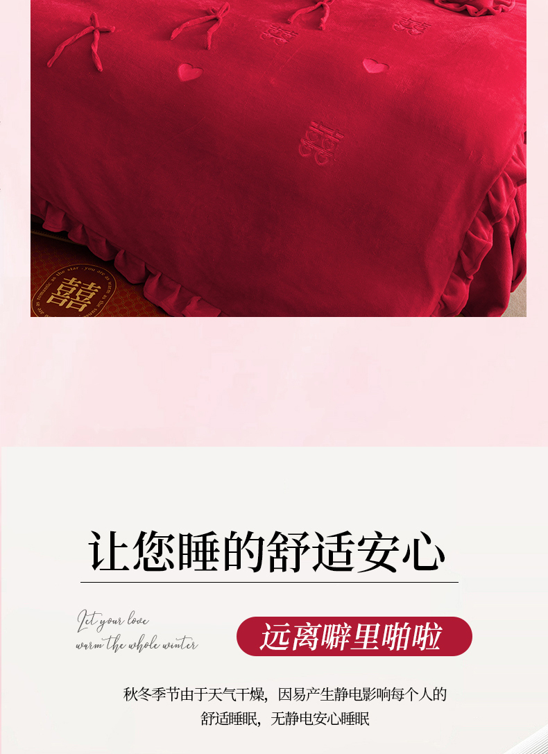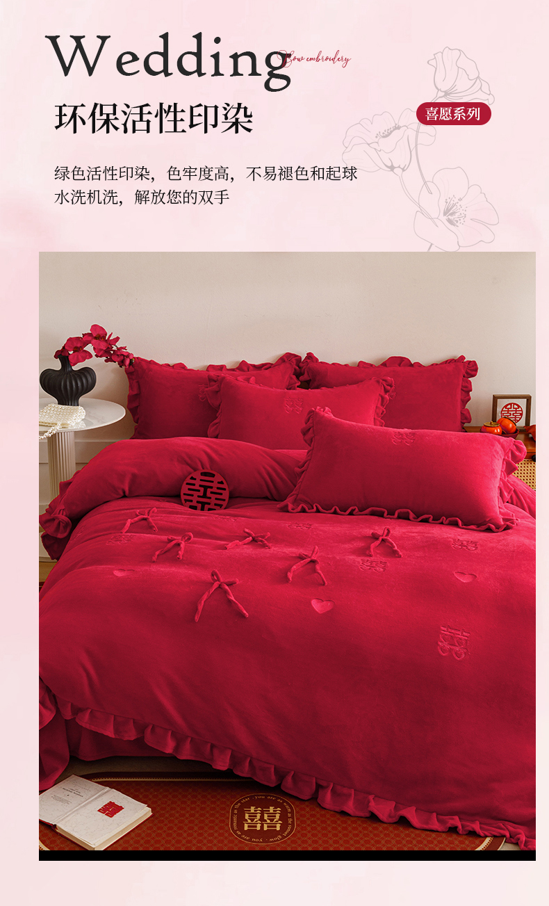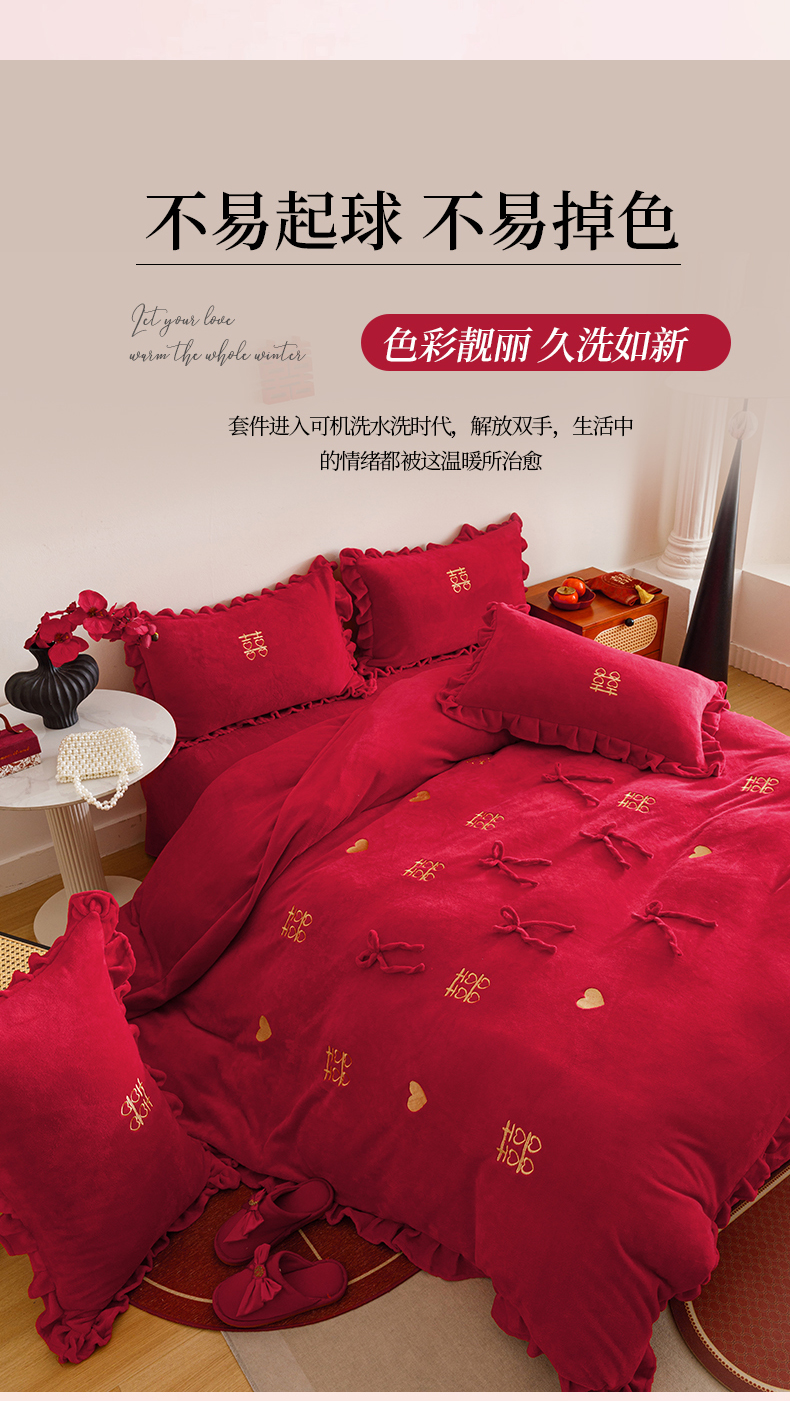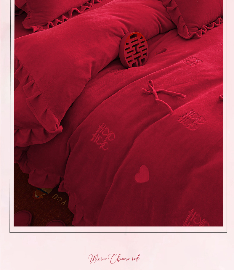 商品名称:苏源家居 2025新款婚庆加厚牛奶绒荷叶边刺绣结婚四件套 绒-喜愿-金色