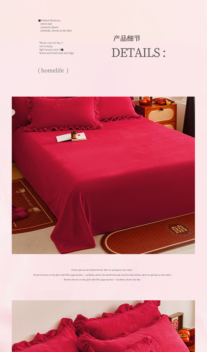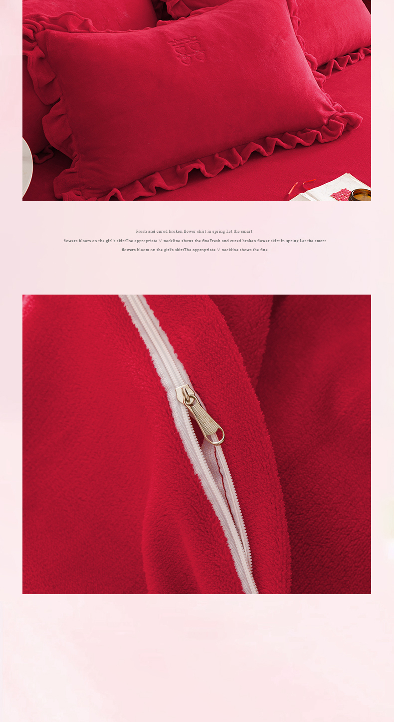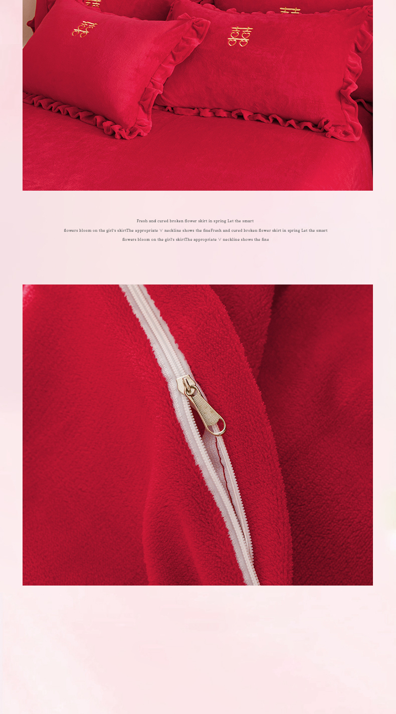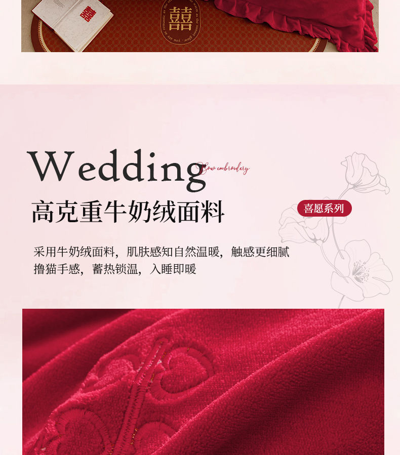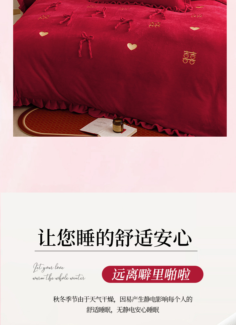 商品名称:苏源家居 2025新款婚庆加厚牛奶绒荷叶边刺绣结婚四件套 绒-喜愿-金色