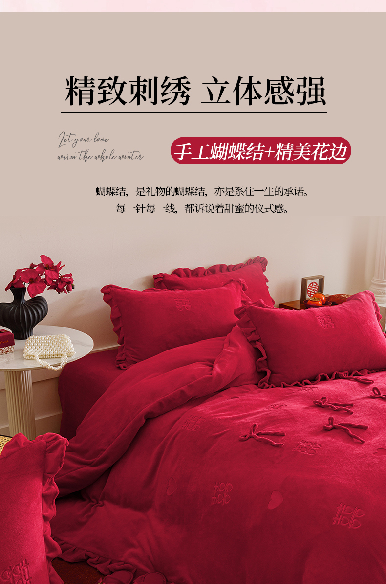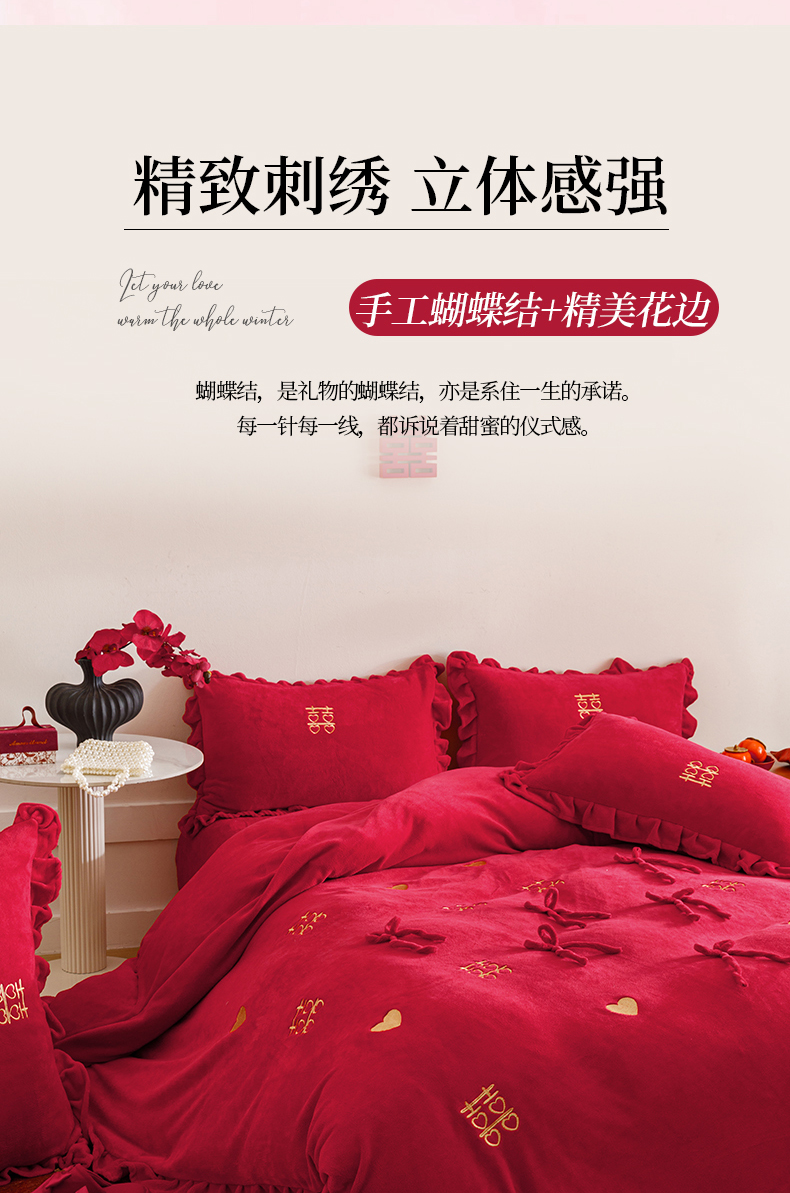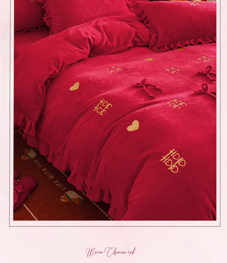 苏源家居 2025新款婚庆加厚牛奶绒荷叶边刺绣结婚四件套 绒-喜愿-金色