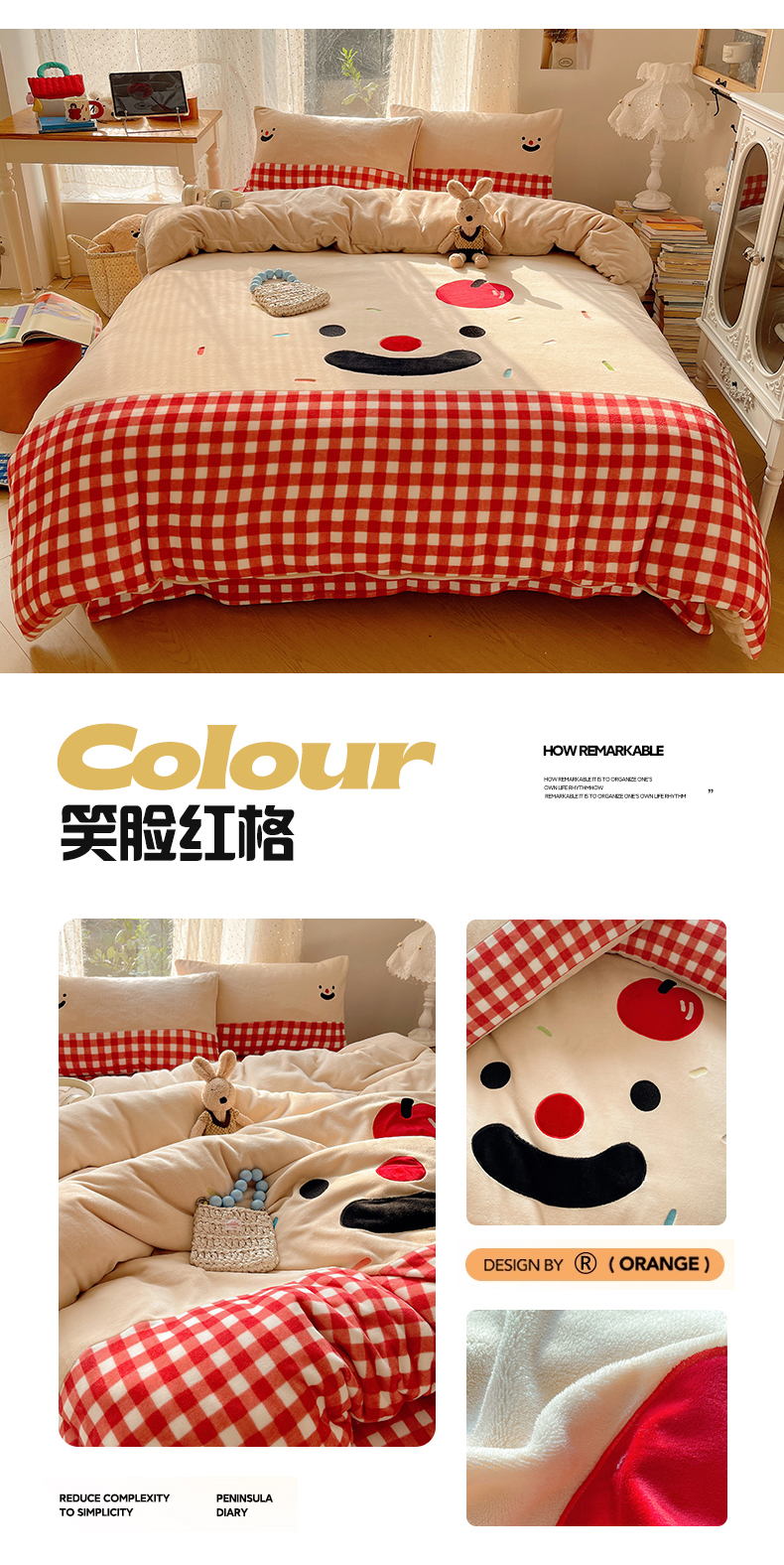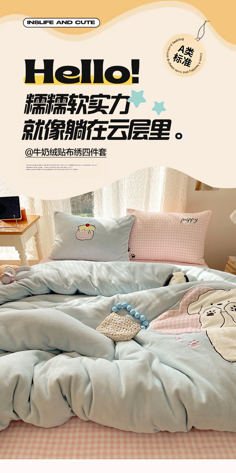 (总)轻奢坊 2025新款牛奶绒ins可爱贴布绣四件套,爱心乖狗,洛丽塔猫,苹果黑猫,晚安小狗,笑脸红格,笑脸咖格