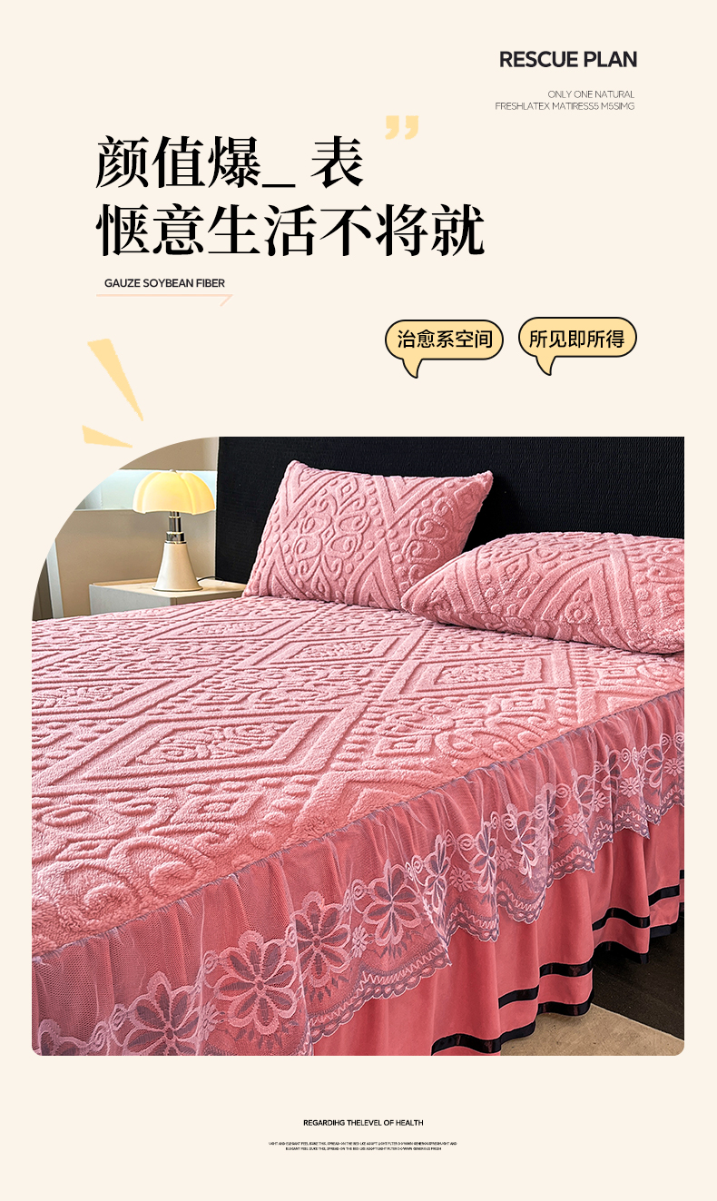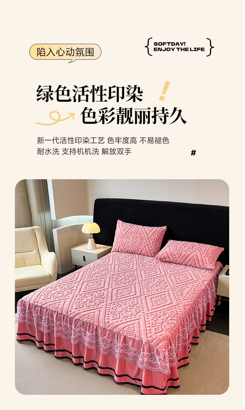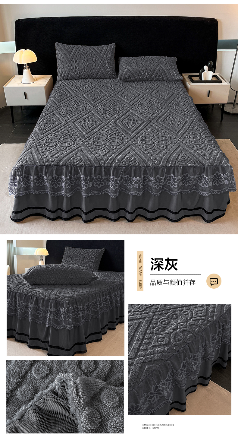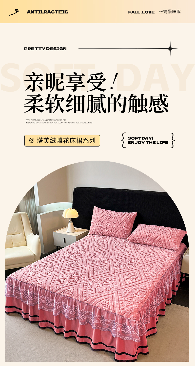 • 91家纺网 家纺一手货源 找家纺 (总)米瑞娜  2025新款塔芙绒雕花蕾丝床裙跨境外贸,白色,宝蓝,果绿,灰色,卡其,蓝灰,玫红,浅紫