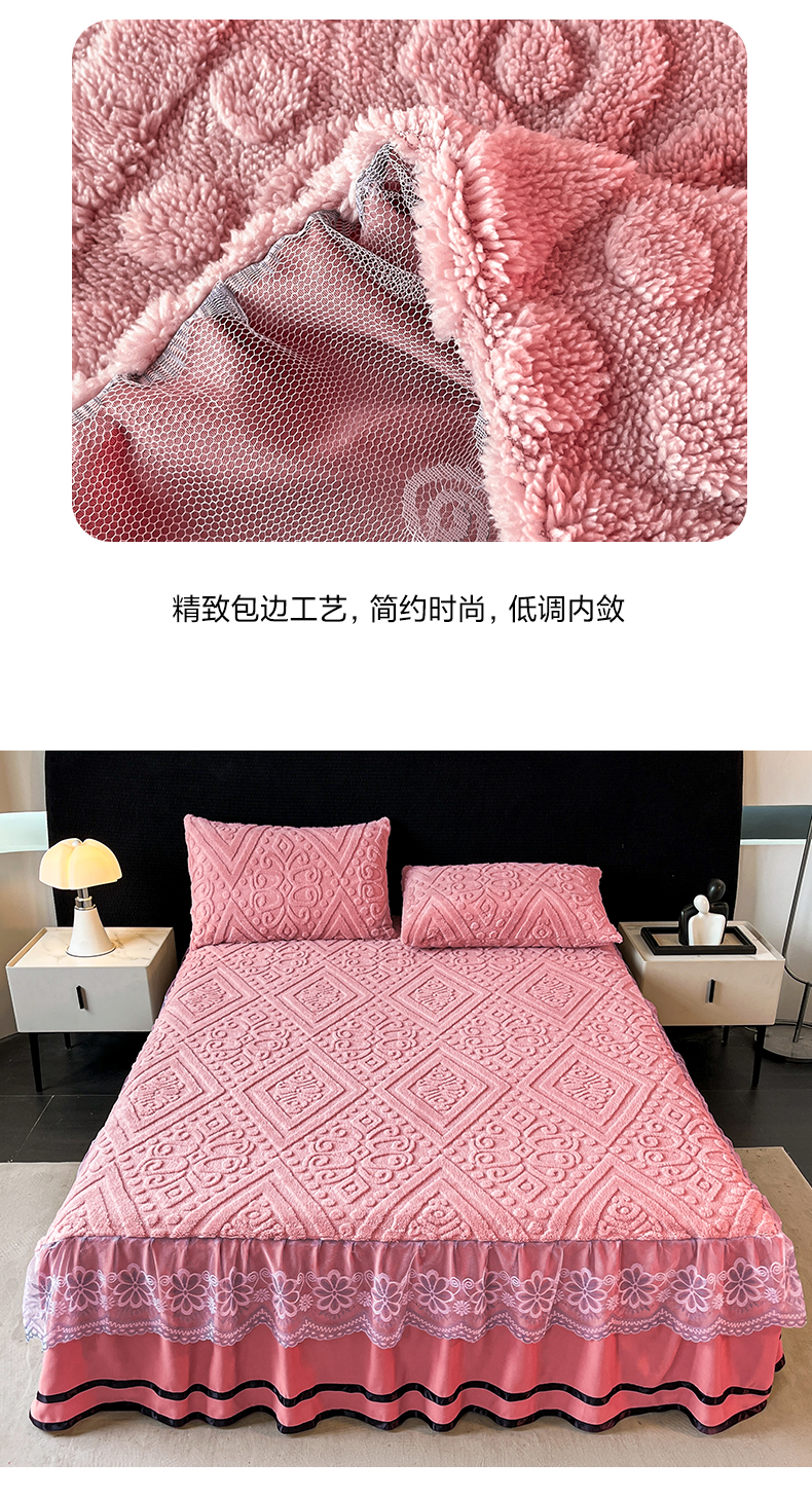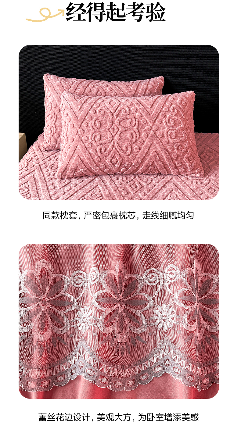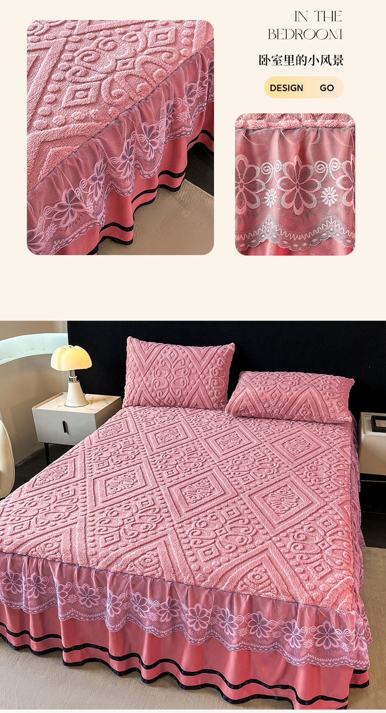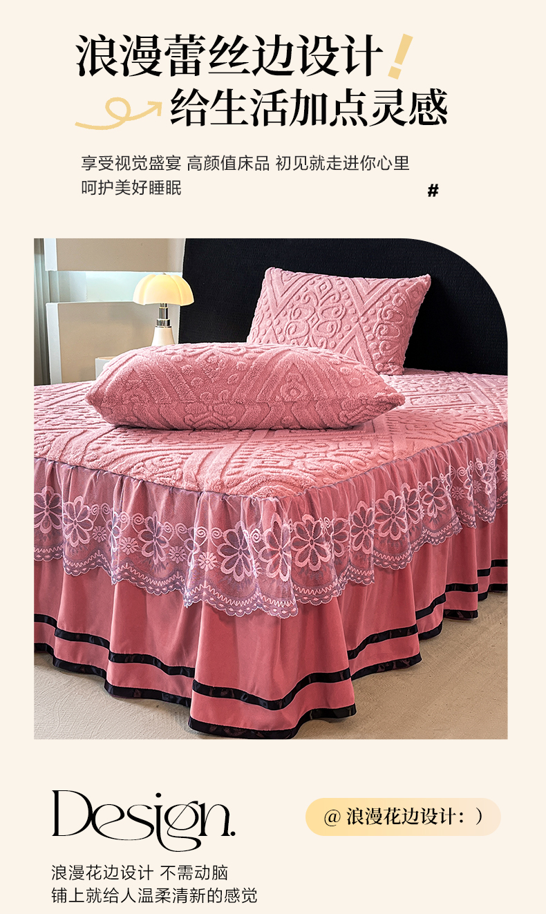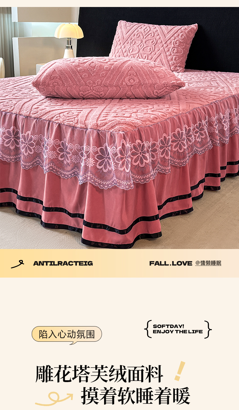 米瑞娜 2025新款塔芙绒床裙三件套雕花绒蕾丝跨境单床裙外贸现货尺寸齐全 欧式床裙-玫红