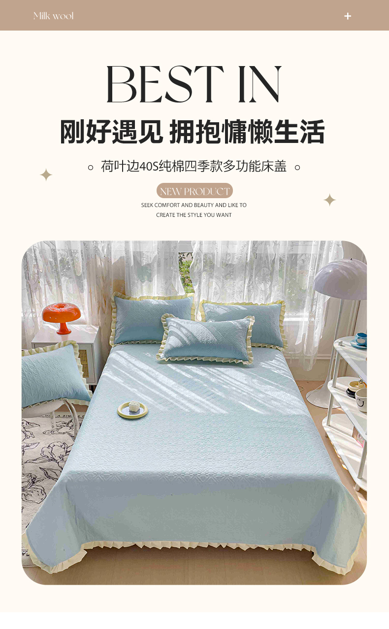 • 91家纺网 家纺一手货源 找家纺 妮可 2025新款全棉纯色花边款40S纯棉夹棉绗缝四季款多功能床盖 叠拍图