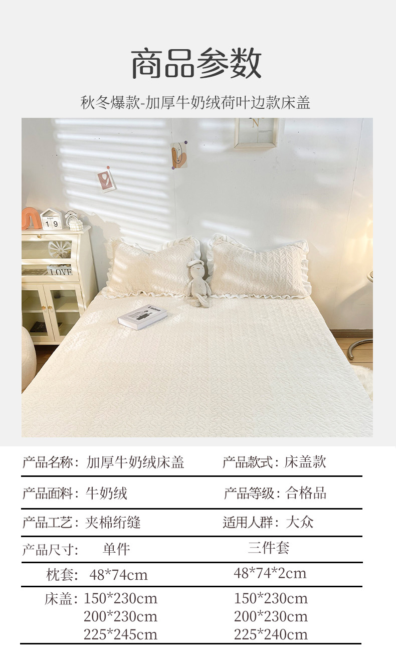 • 91家纺网 家纺一手货源 找家纺 妮可 2025秋冬新款加厚牛奶绒多功能荷叶边纯色床盖 奶油白