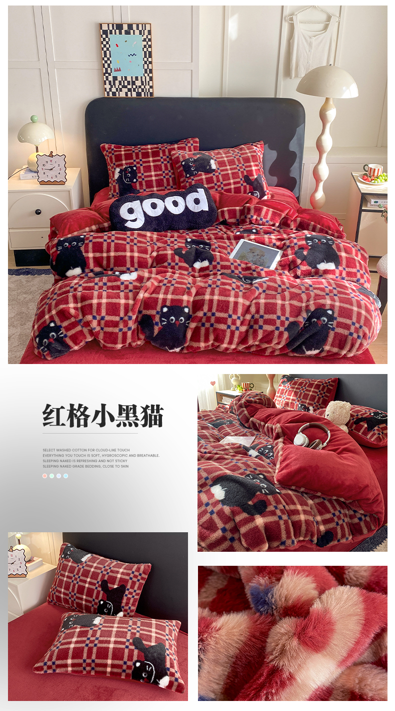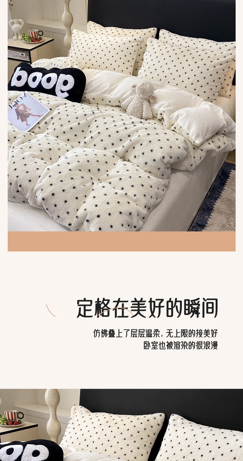 (总)蝶帕家纺 2025新款兔毛绒印花四件套,斑马纹咖,小波点,马格丽,水墨玫瑰,心动,波点咖,红格小黑猫