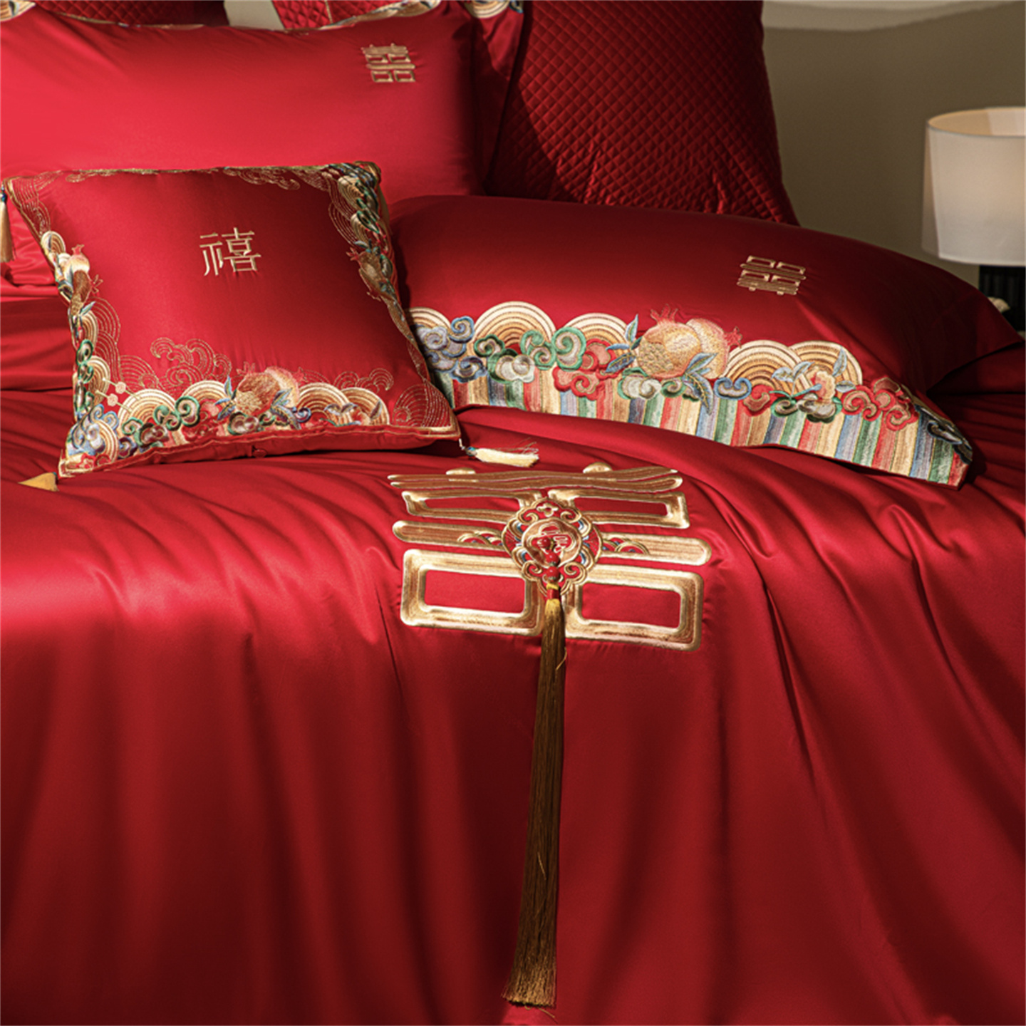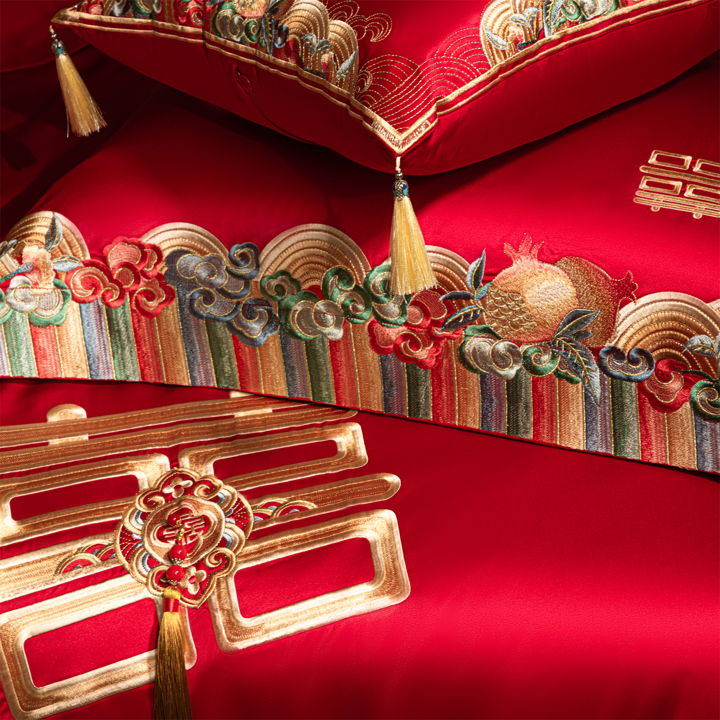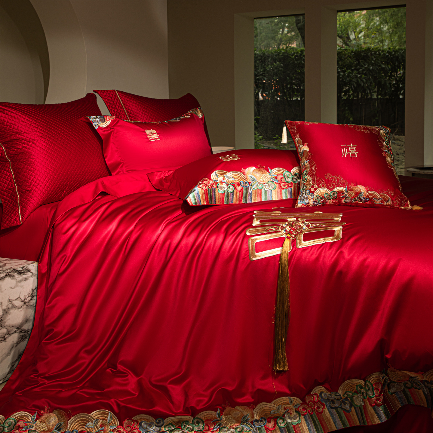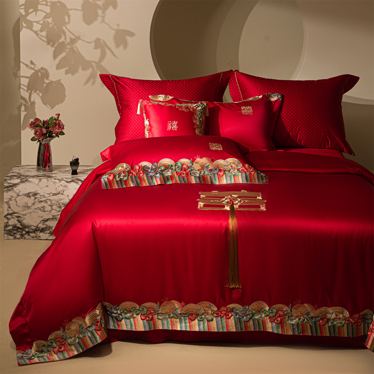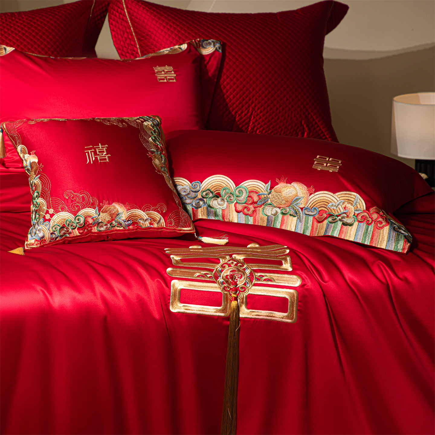 商品名称:(总)佳汐蓝家纺 2025新款100支全棉刺绣婚庆四件套-喜传祥瑞