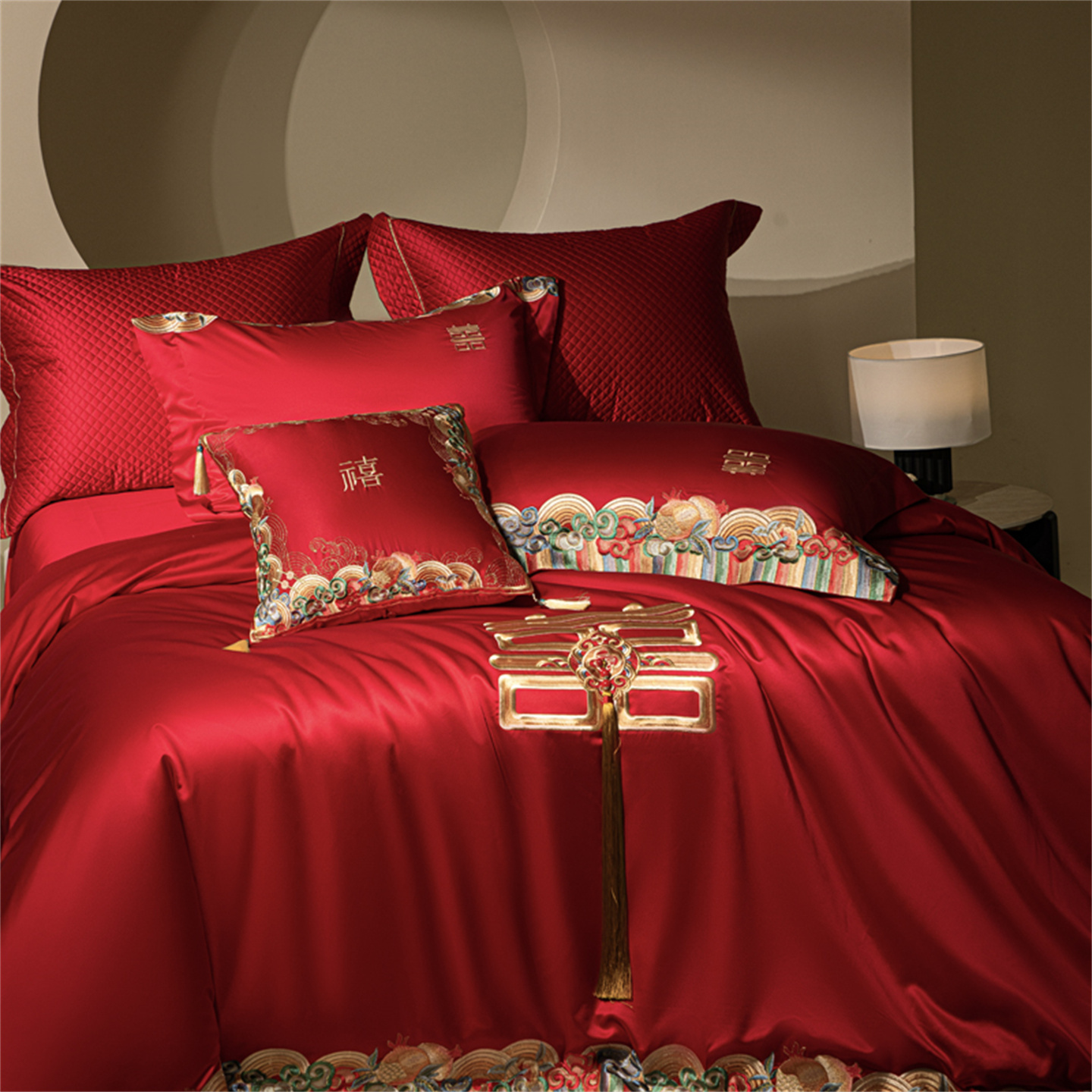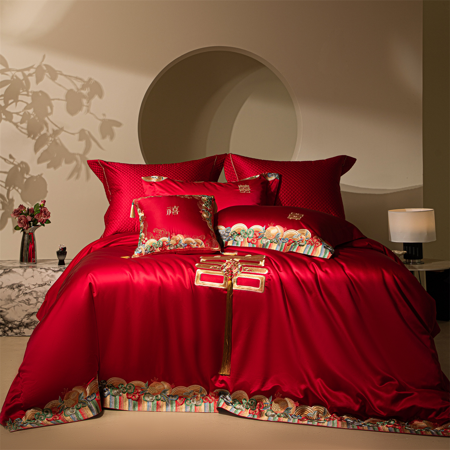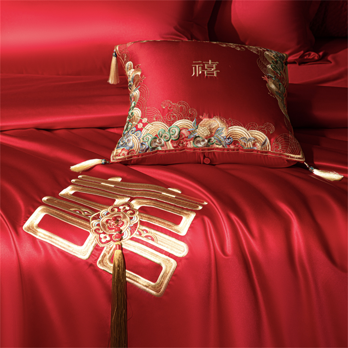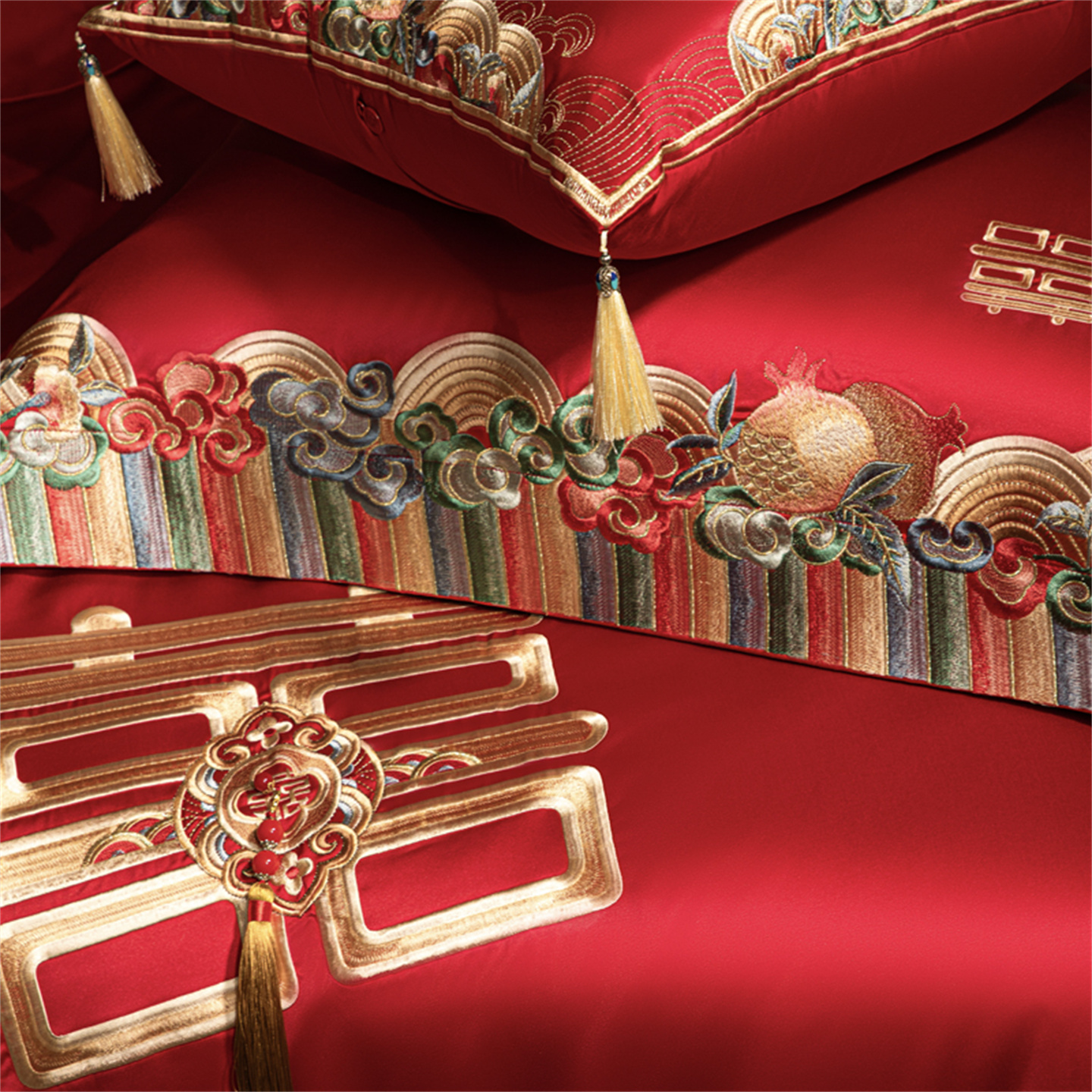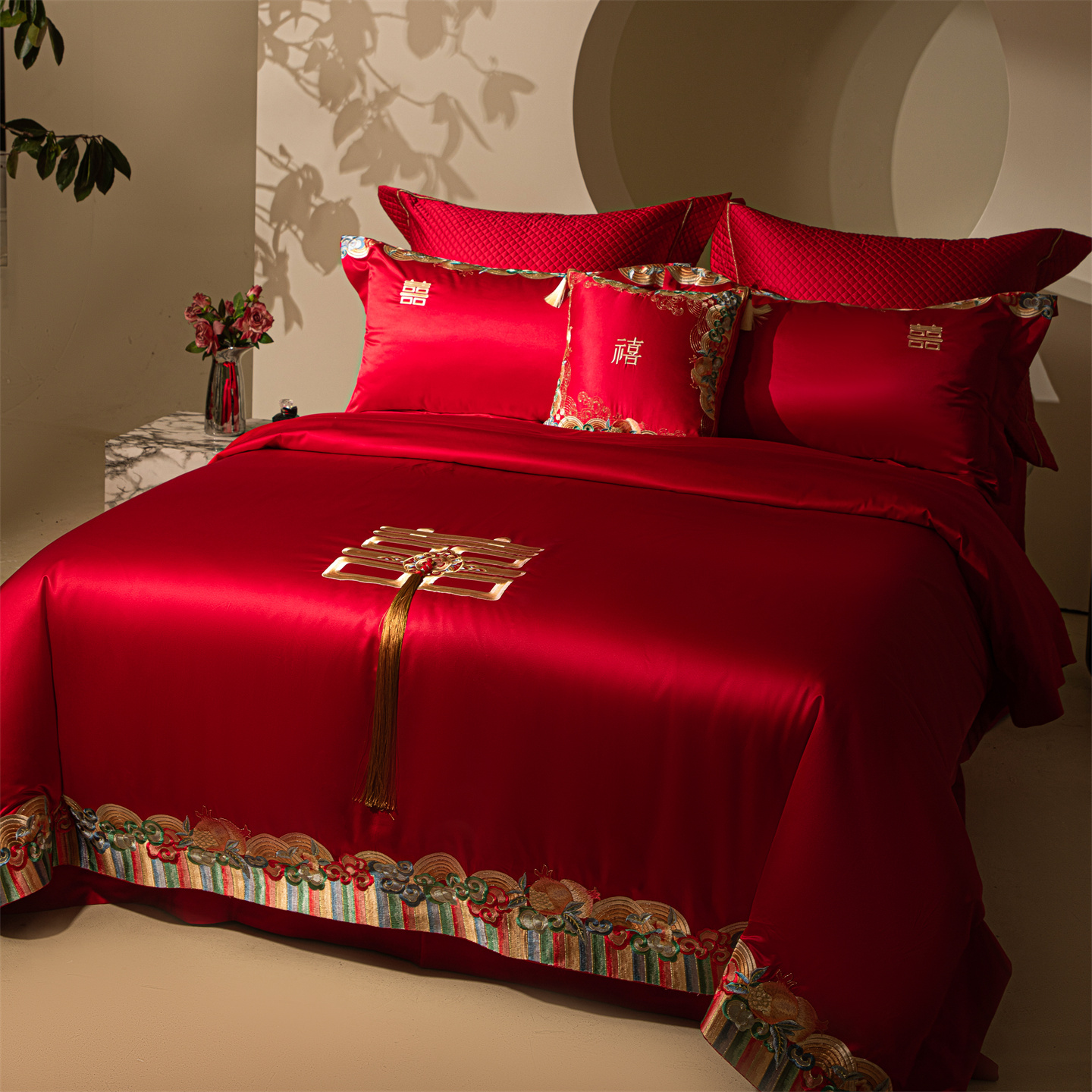 商品名称:(总)佳汐蓝家纺 2025新款100支全棉刺绣婚庆四件套-喜传祥瑞