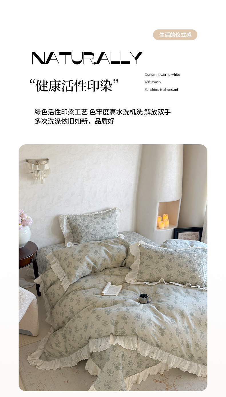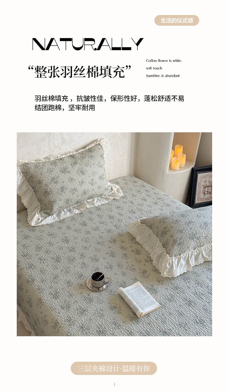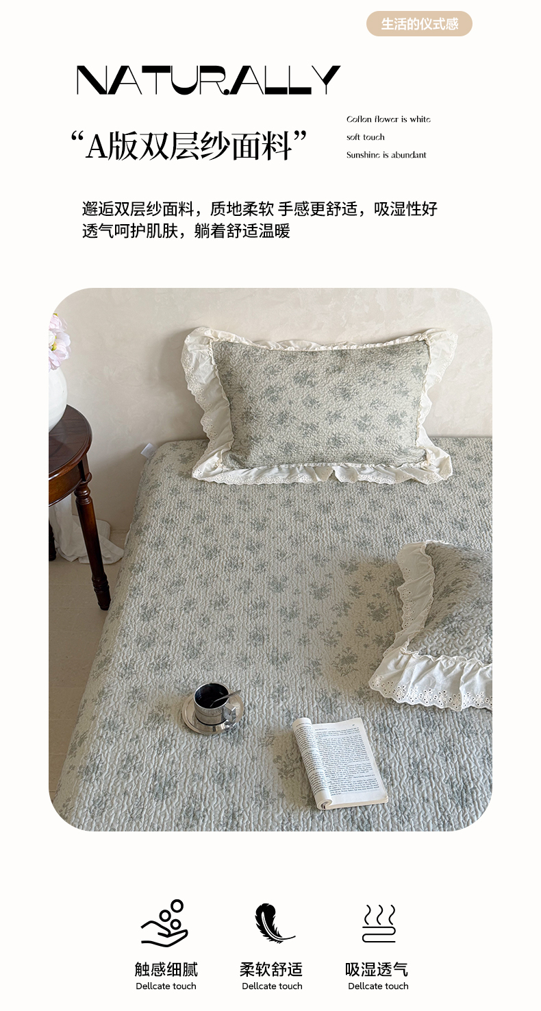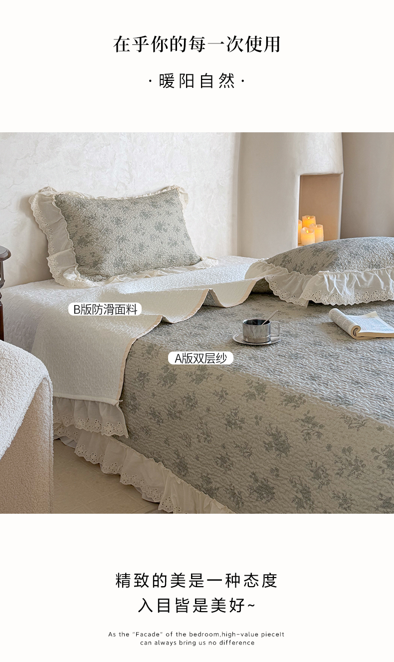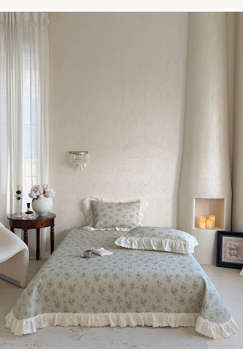 商品名称:琳可家居 2026新款印花全棉双层纱床盖棉布花边高温水洗A类标准夹棉可机洗 风雅花韵