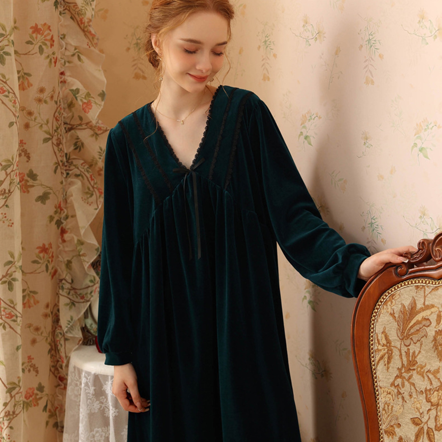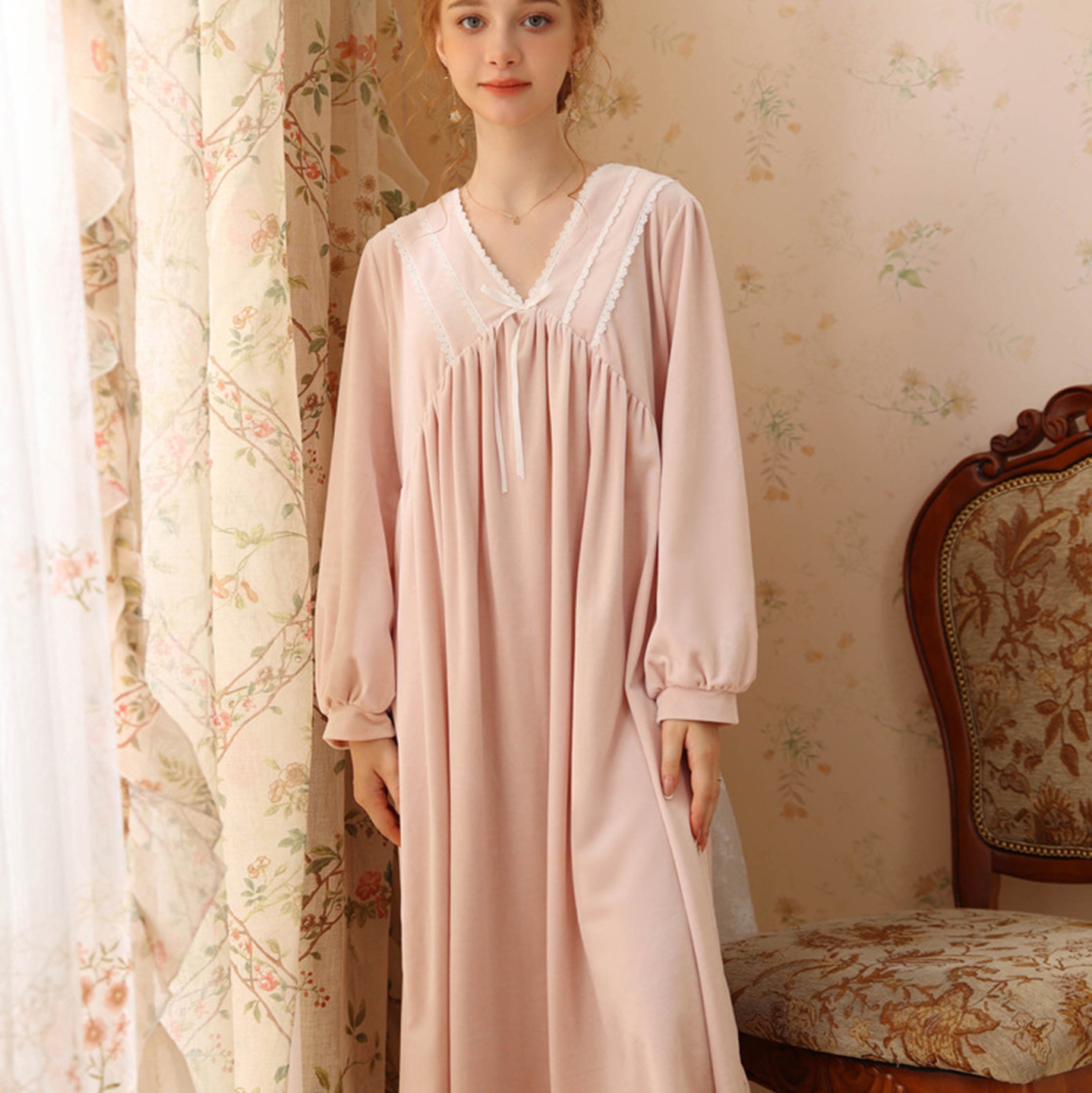 洛兰沙家居馆 2026秋冬新款宽松V领加厚款睡裙睡袍 粉色