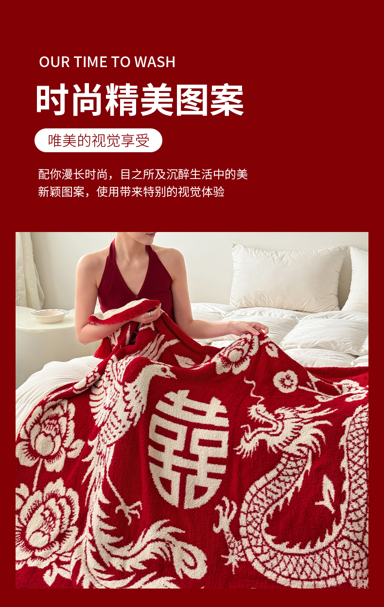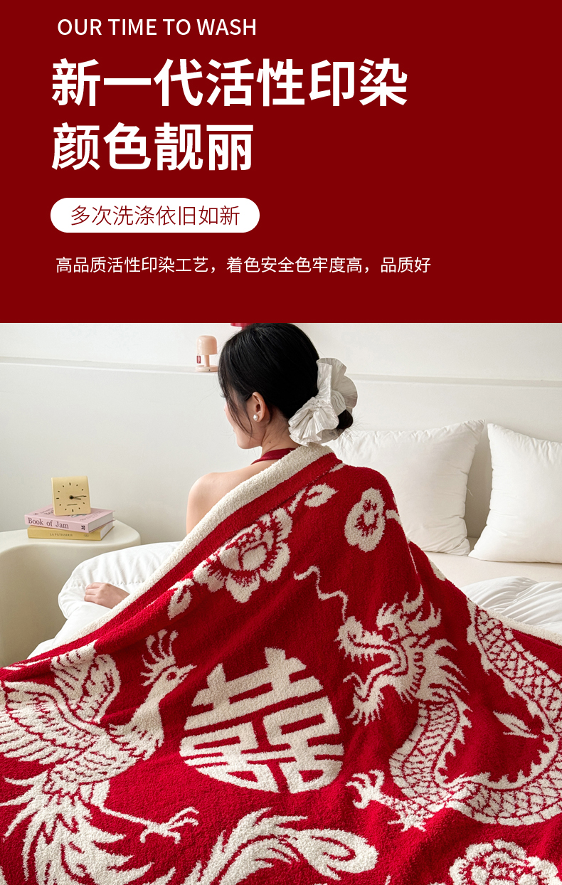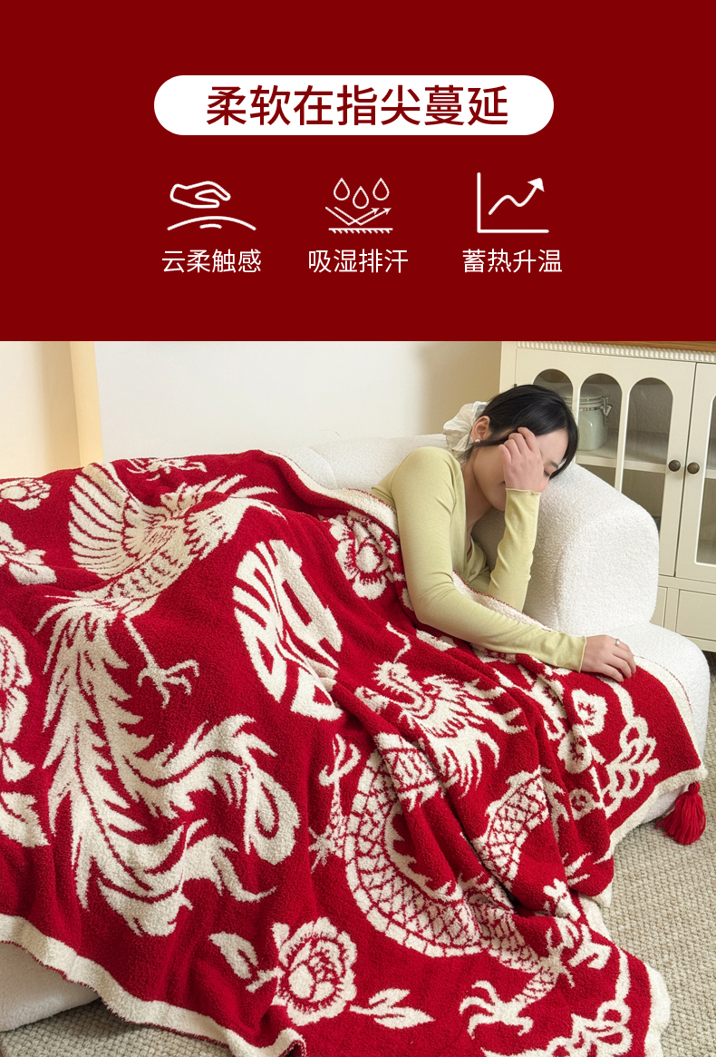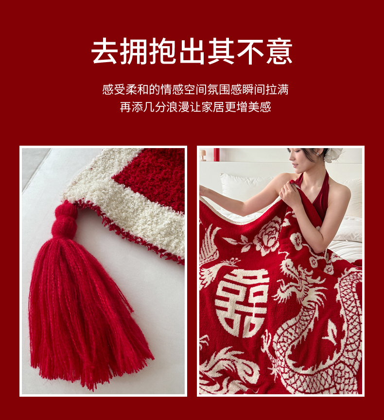 商品名称:(总)丹本家纺 2026新款龙凤呈祥A类结婚订婚红双喜半边绒流苏吊坠手工针织毯毛毯毯子