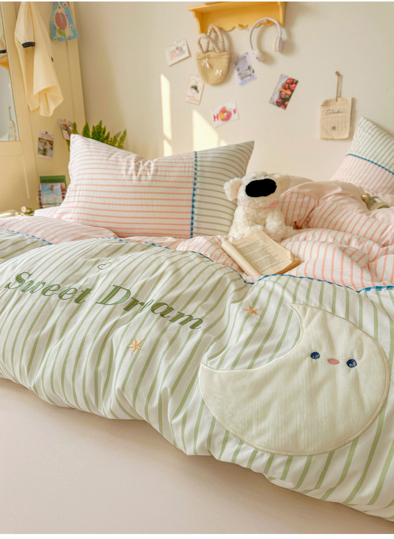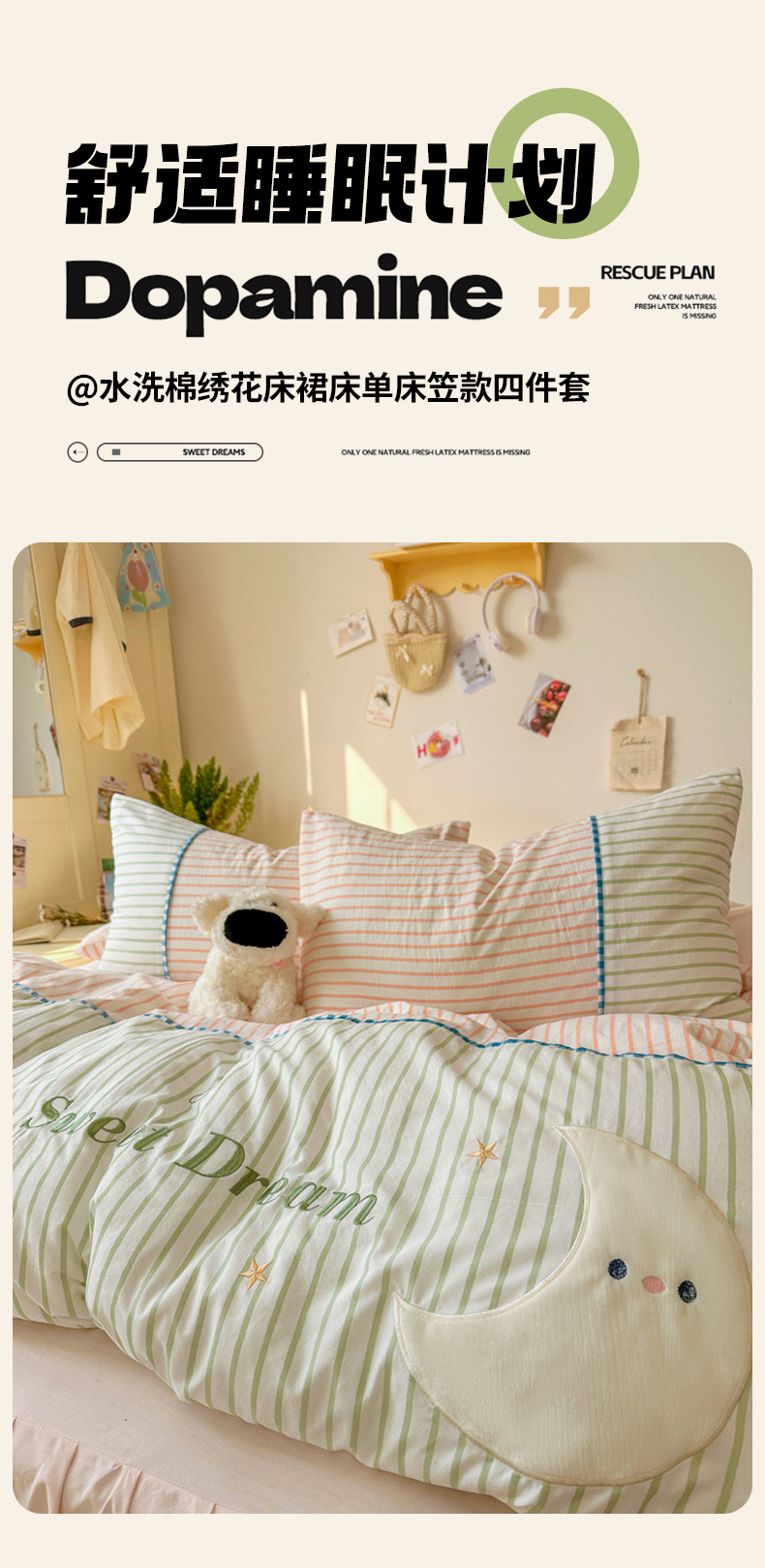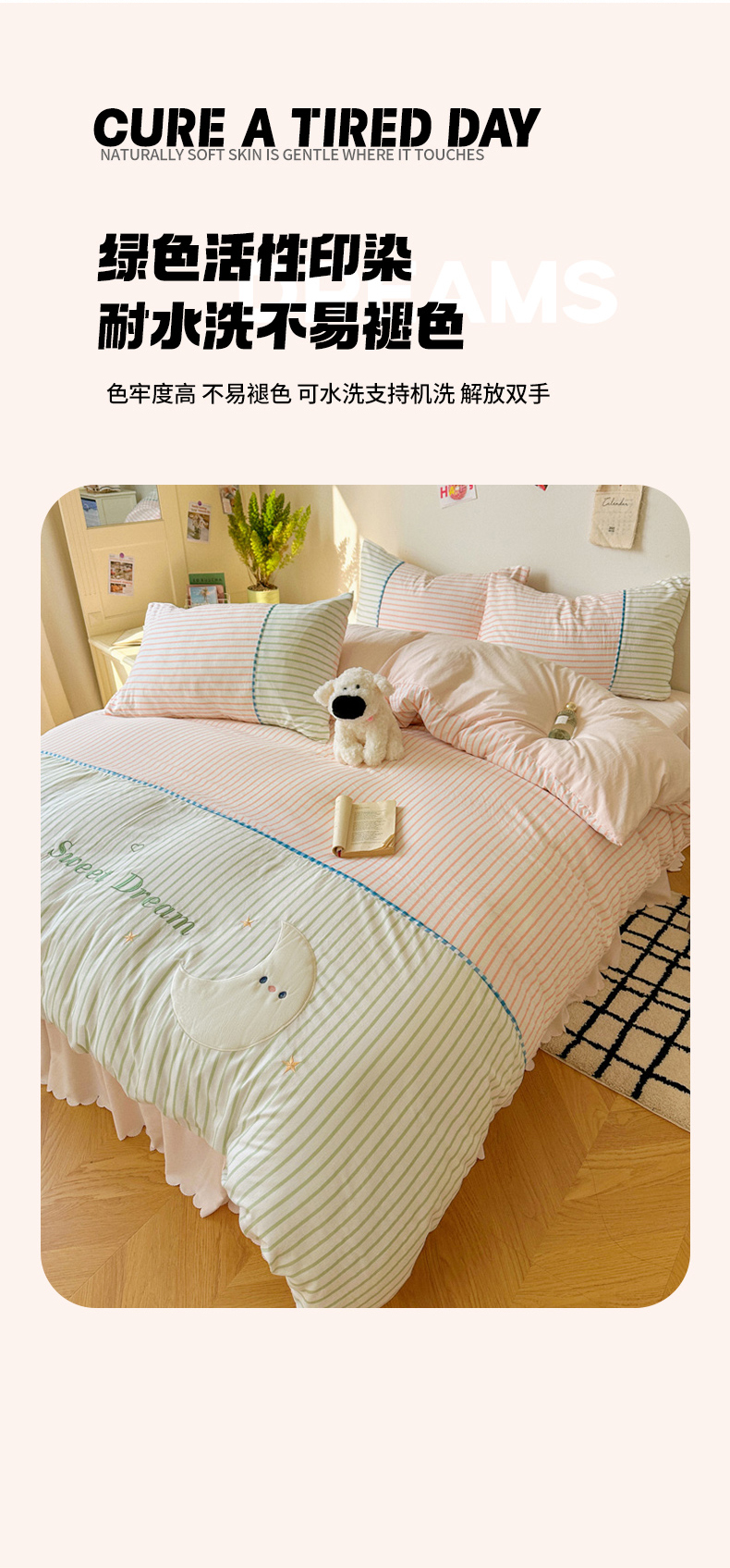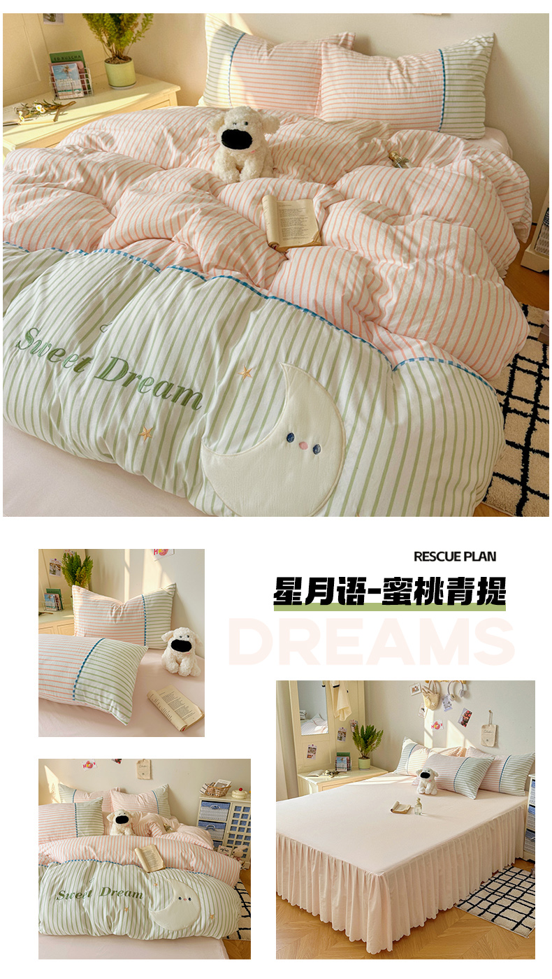 贝凯瑞 2026款仿棉木棉水洗棉绣花ins小清新床裙床单款四件套-星月语 星月语-蜜桃青提,星月语-蜜桃青提