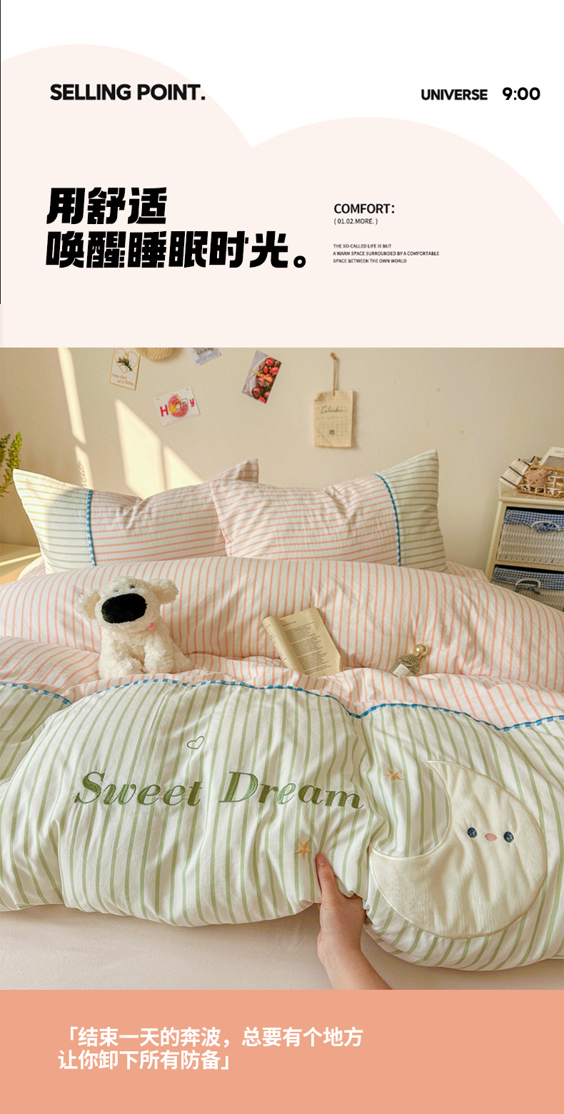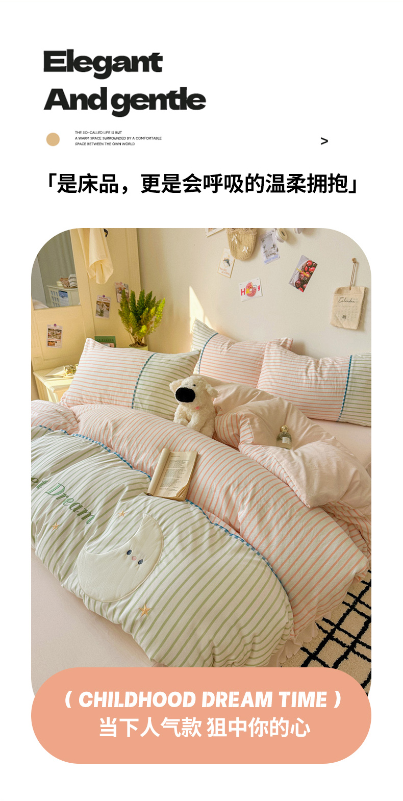 • 91家纺网 家纺一手货源 找家纺 贝凯瑞 2026款仿棉木棉水洗棉绣花ins小清新床裙床单款四件套-星月语 星月语-蜜桃青提,星月语-蜜桃青提