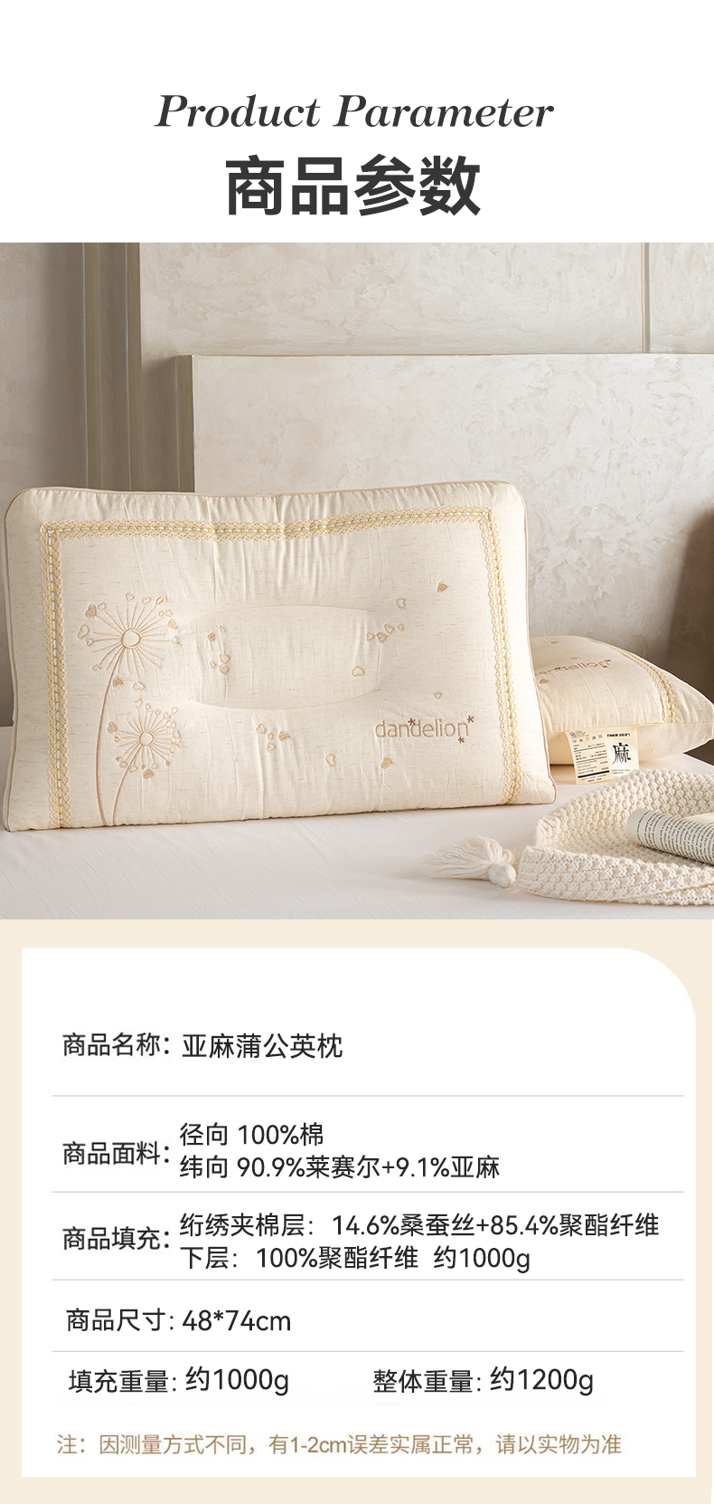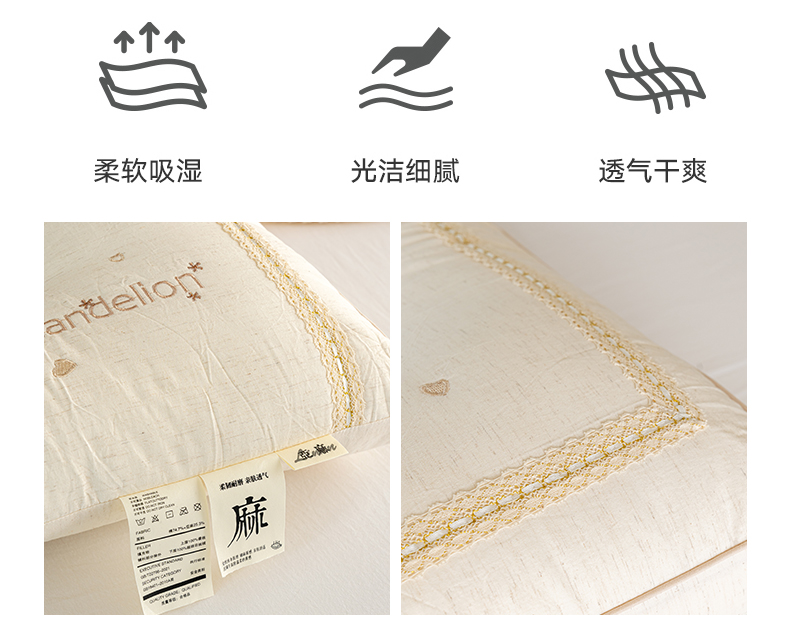 商品名称:昕科 2026新款亚麻蒲公英枕-棉麻枕芯刺绣亚麻枕头 亚麻蒲公英枕/一只装