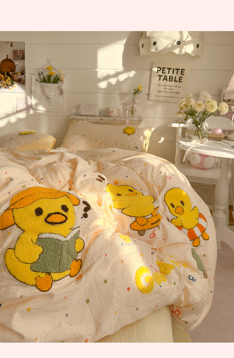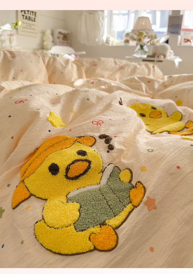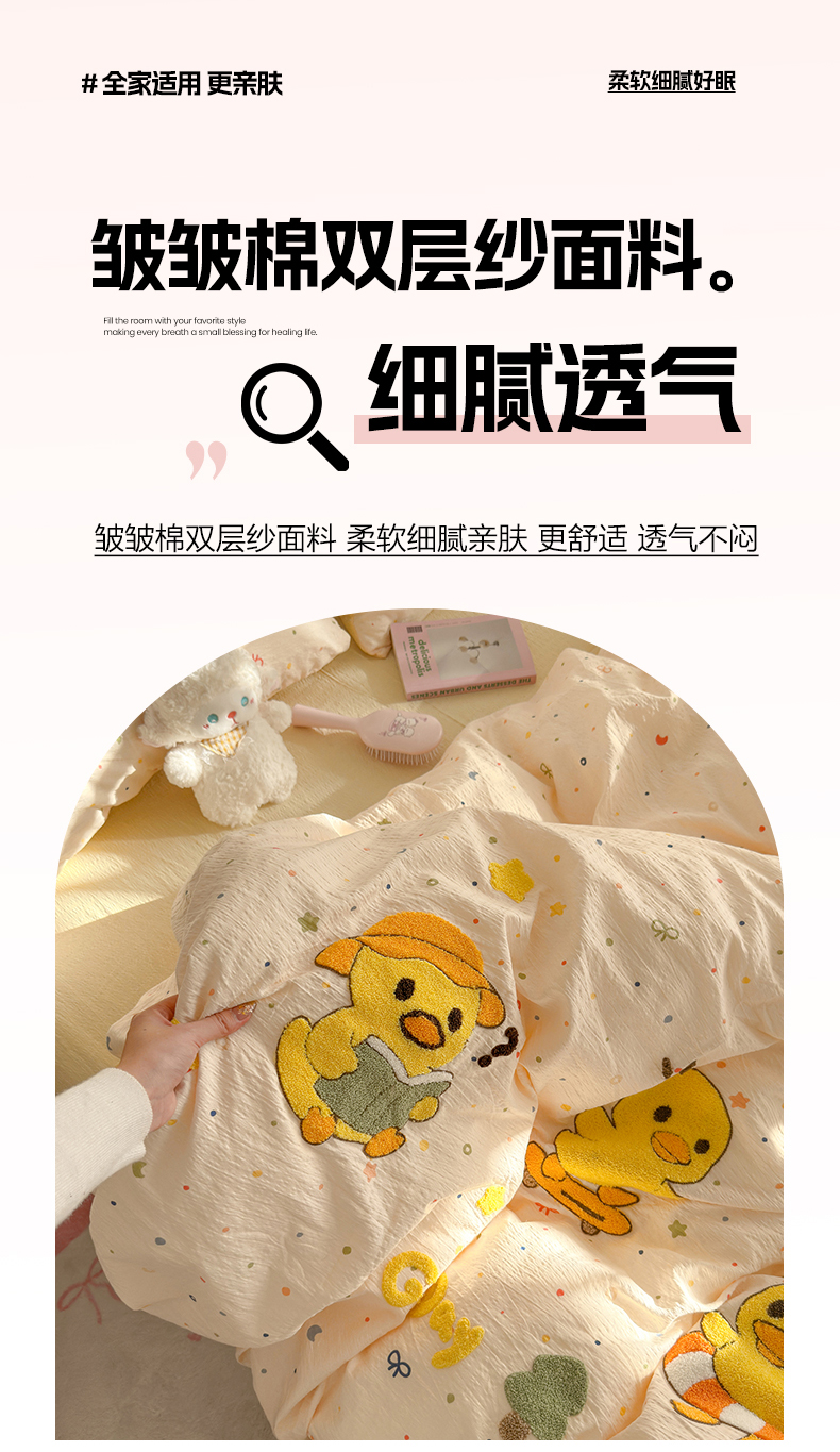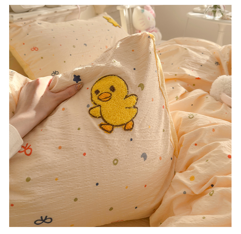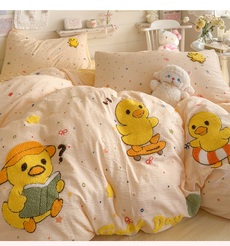 当前位置: 91家纺网 > 商品网购 > 床品套件 > 四件套 > 其它四件套 > 卡斯诺家纺馆 2026新款皱皱棉双层纱毛巾绣四件套(下载文件包含买家秀) 开心小鸭