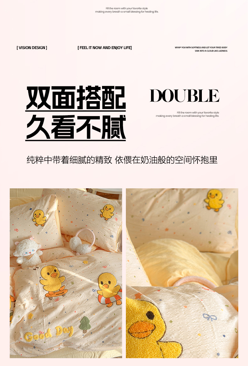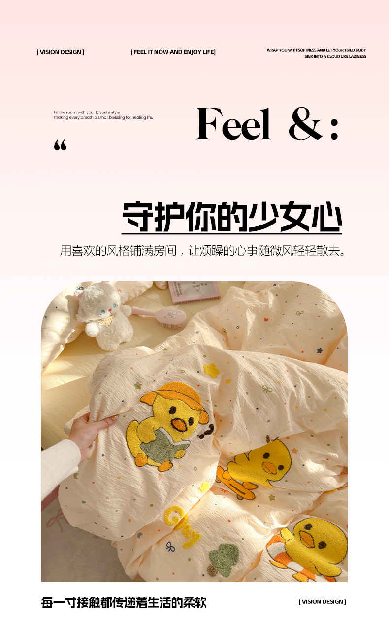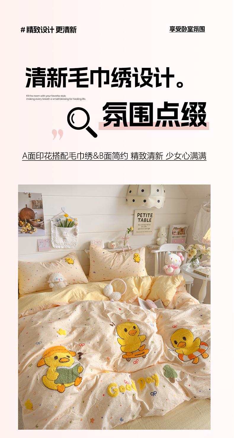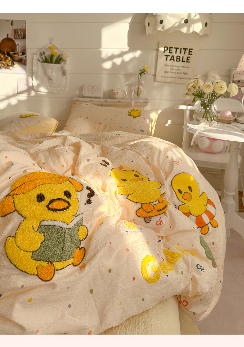 当前位置: 91家纺网 > 商品网购 > 床品套件 > 四件套 > 其它四件套 > 卡斯诺家纺馆 2026新款皱皱棉双层纱毛巾绣四件套(下载文件包含买家秀) 开心小鸭