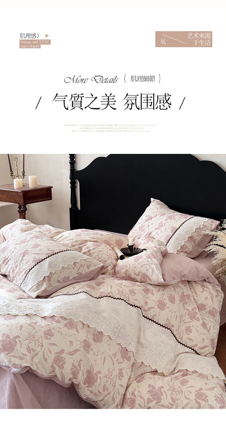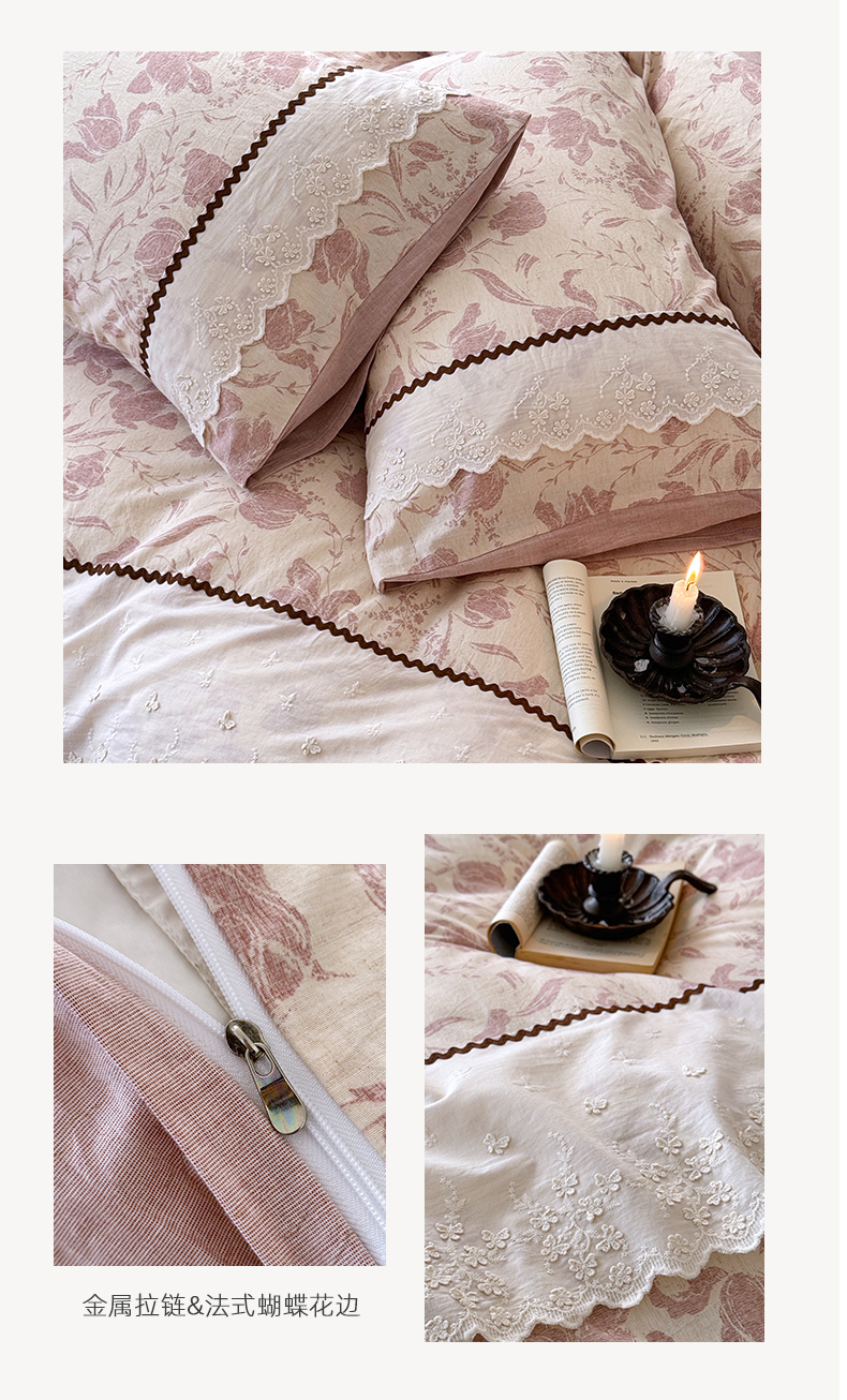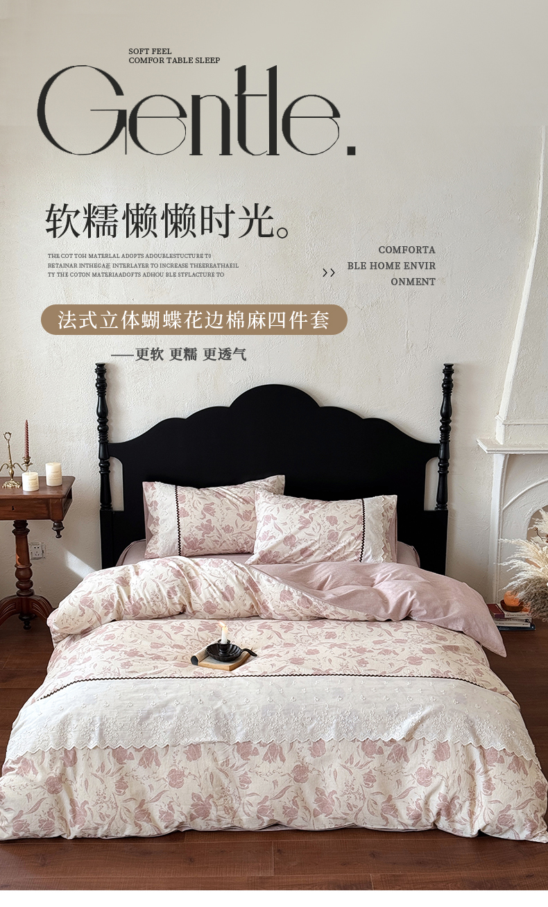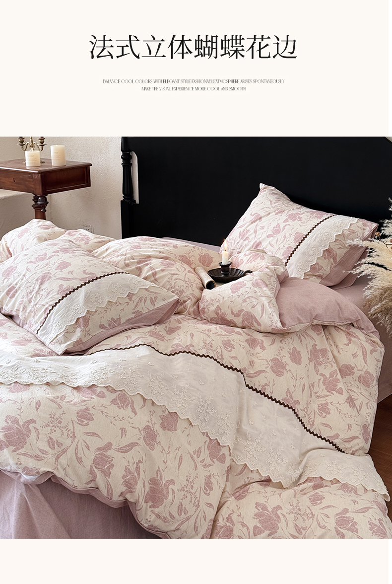(总)淑女公社家纺 2026新款法式立体蝴蝶花边棉麻四件套,花香满园 绿,秋棠 红,时雨 咖,晚枝 红