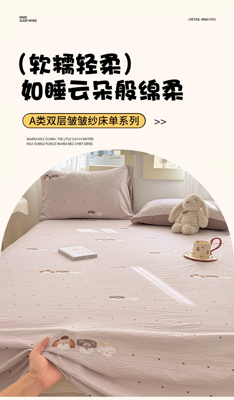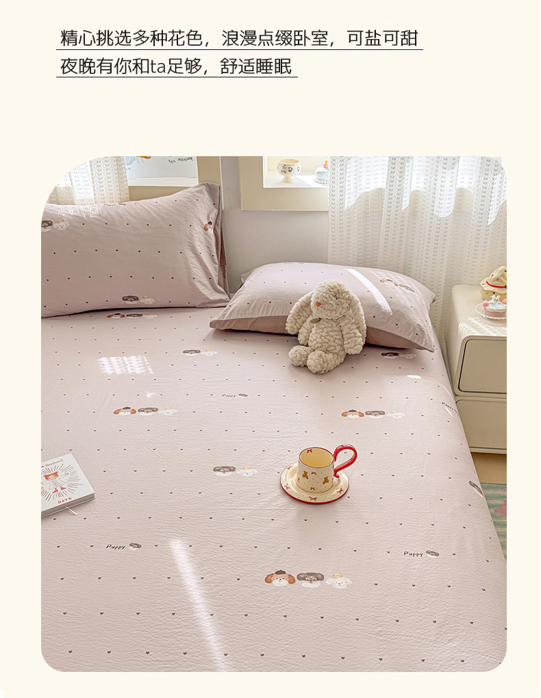 (总)丽美人家纺 2026新款双层皱皱纱大豆夹棉床笠单床笠床笠单件,JM花开漫漫,JM贝拉,JM布兰卡,JM粉格猫咪,JM格仔萌宠,JM可爱小狗,JM腊肠狗,JM乐园,JM玛丽,JM时光,JM月境骑踪,JM紫雾叶兔