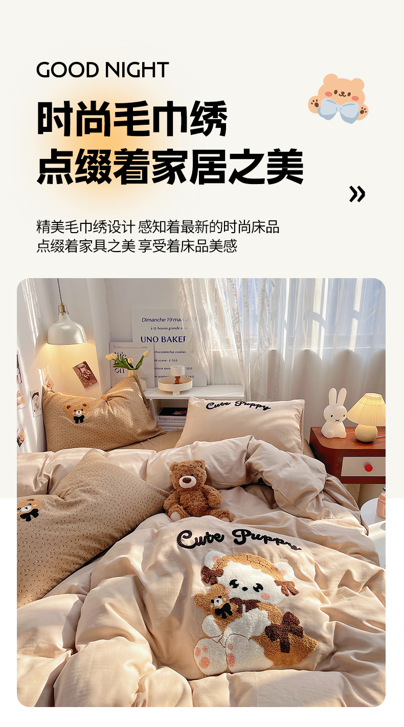 (总)炫拼家纺 2026新款全棉A类双层纱卡通毛巾绣四件套-泡芙系列,泡芙-小猫,泡芙-动物朋友,泡芙-哈尼熊,泡芙-汉堡卡皮,泡芙-红军兔,泡芙-卡皮派对,泡芙-奶油狗,泡芙-女孩派对,泡芙-趣味猫,泡芙-三只小猪,泡芙-晚安狗,泡芙-小狗,泡芙-小狗派对,泡芙-椰暴富