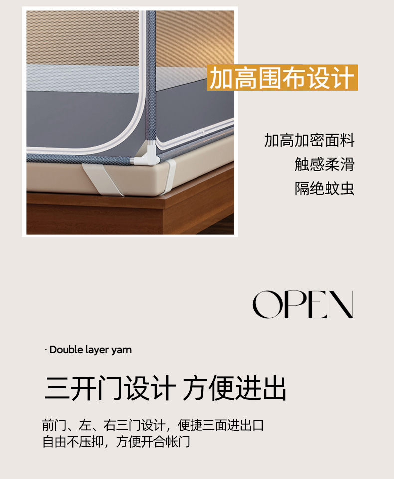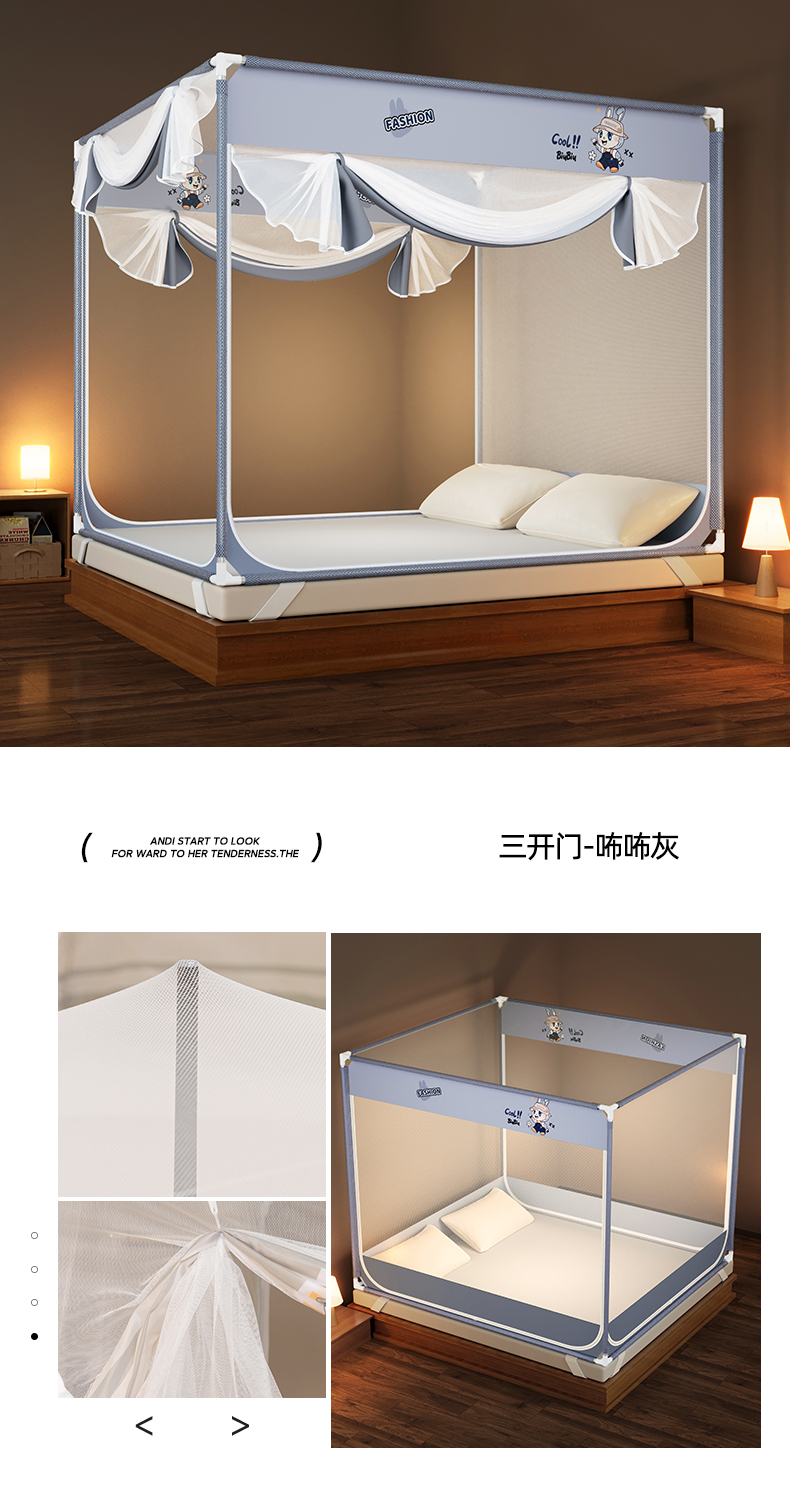 商品名称:青竹苑 2026新款三门全底外穿坐床式蚊帐儿童防摔防蚊拉链方帐 咘咘灰