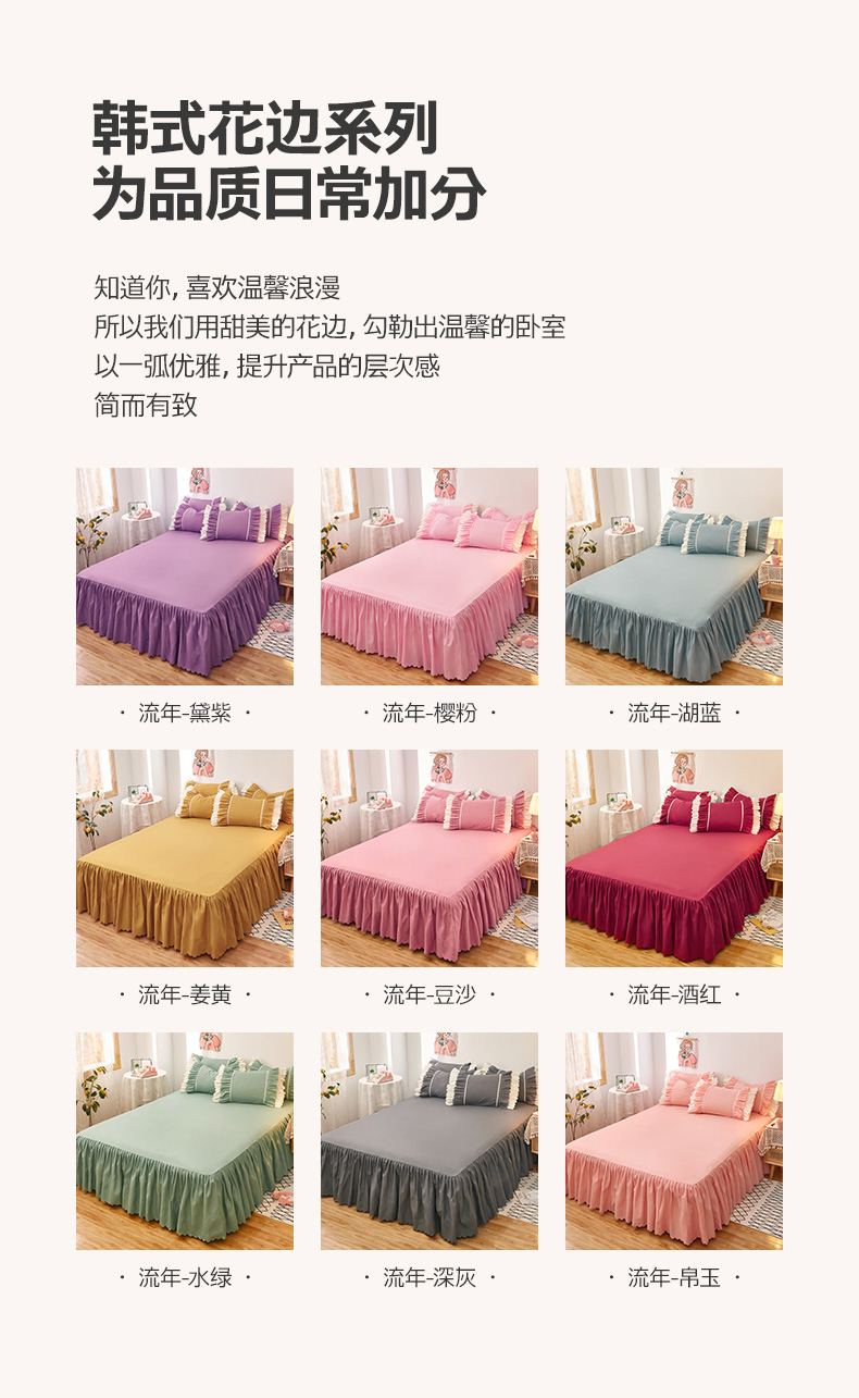 (总)沐珩家纺 2026新款荷叶边亲肤磨毛单床裙—流年系列,流年-帛玉,流年-黛紫,流年-豆沙,流年-湖蓝,流年-酒红,流年-墨绿,流年-深灰,流年-水绿,流年-樱粉