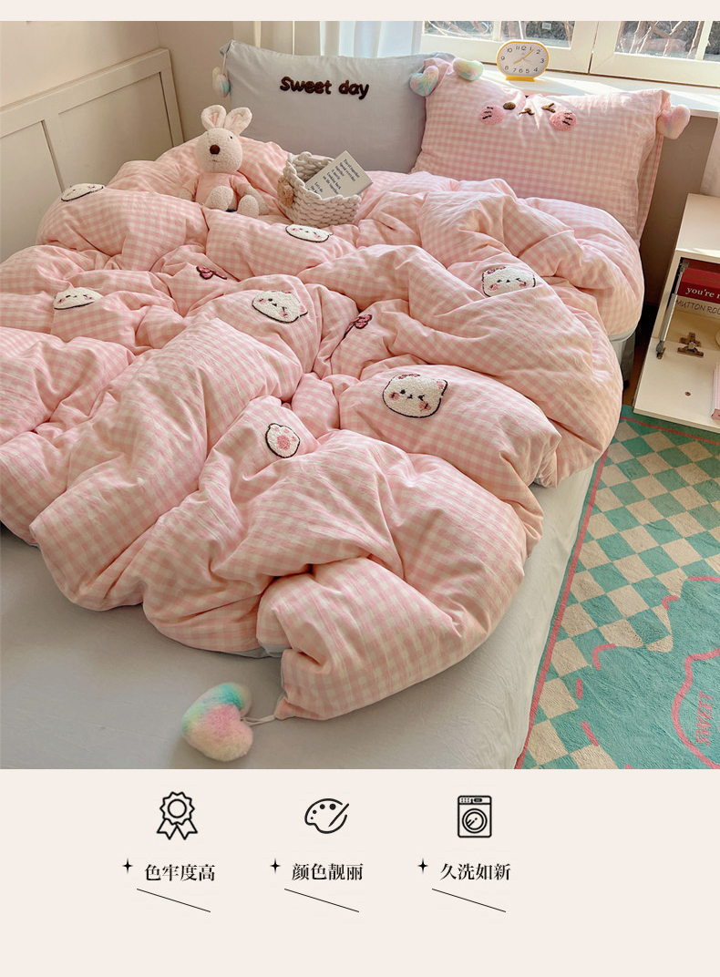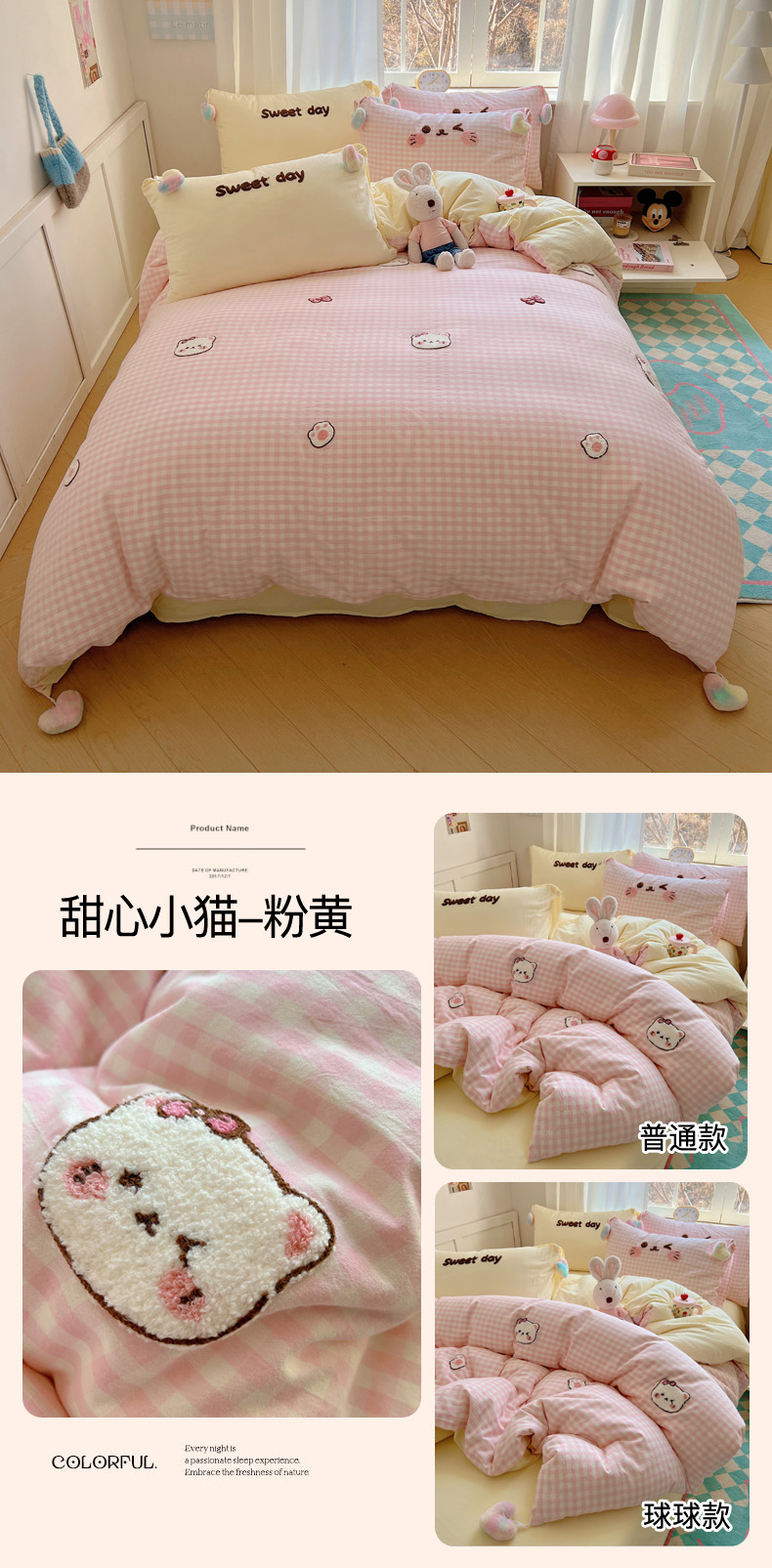 当前位置: 91家纺网 > 商品网购 > 床品套件 > 四件套 > 全棉普通四件套 > 丽涵家纺 2026新款全棉色织水洗棉毛巾绣四件套-甜心小猫 甜心小猫-粉蓝-毛球款