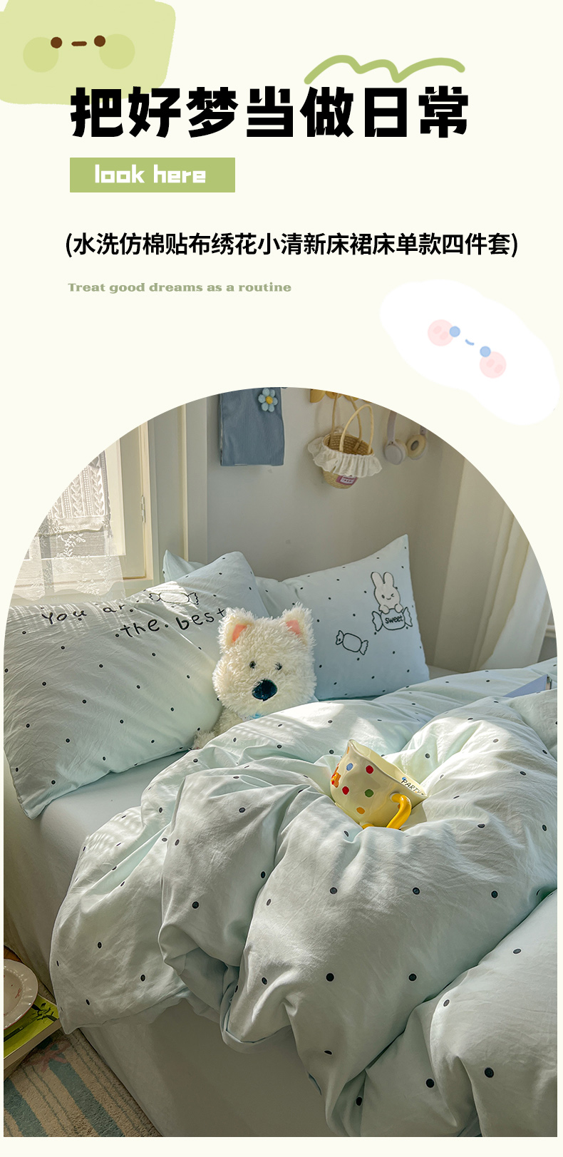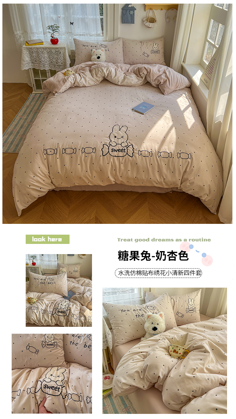 商品名称:(总)贝凯瑞 2026新款仿棉木棉水洗棉绣花ins小清新床裙床单款四件套-糖果兔系列