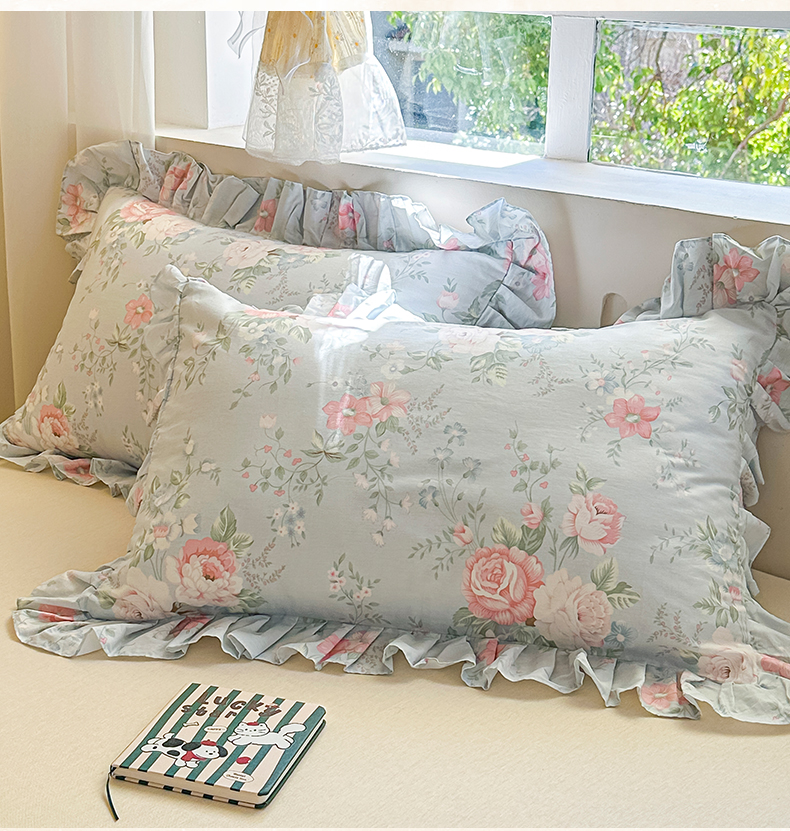 忘忧草 2026新款全棉纯棉印花精致花边枕套单枕套 枕套单件 华庭庄园-蓝