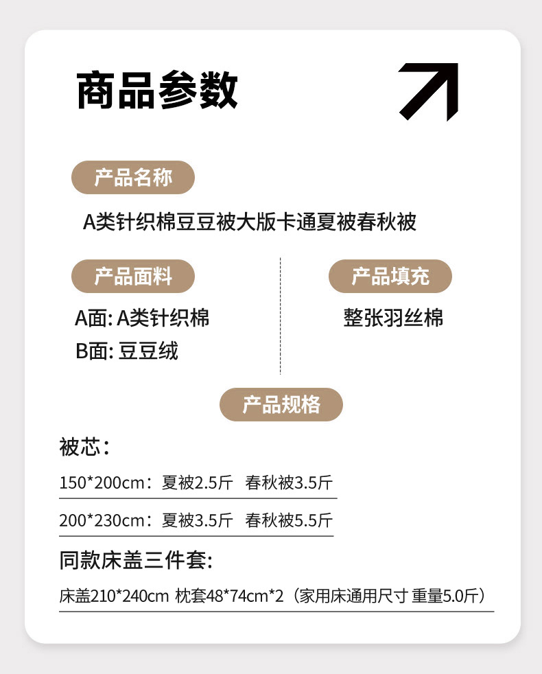 [{"sp_id":1,"sp_name":"\u989c\u8272","sp_format":2,"sp_list":[{"sp_value_id":664,"sp_value_name":"\u5c0f\u5154\u4e56\u4e56","sp_value_image":{"id":999,"path":"https:\/\/img3.91jf.com\/ghelp\/2026\/20260315\/20260315153332_917034.jpg"},"sp_value_video":{"id":0,"img":"","path":"","time":0,"download_num":0,"play_num":0},"price":"65.00","storage":2000,"weight":"1.250","is_check_weight":0,"plus_price":"","sp_sort":23}]},{"sp_id":27,"sp_name":"\u5c3a\u5bf8","sp_format":1,"sp_list":[{"sp_value_id":302,"sp_value_name":"150*200cm \u590f\u88ab--2.5\u65a4","sp_value_image":{"id":0,"path":""},"sp_value_video":{"id":0,"img":"","path":"","time":0,"download_num":0,"play_num":0},"price":"65.00","storage":500,"weight":"1.250","is_check_weight":0,"plus_price":"","sp_sort":5},{"sp_value_id":303,"sp_value_name":"200*230cm \u590f\u88ab--3.5\u65a4","sp_value_image":{"id":0,"path":""},"sp_value_video":{"id":0,"img":"","path":"","time":0,"download_num":0,"play_num":0},"price":"75.00","storage":500,"weight":"1.750","is_check_weight":0,"plus_price":"","sp_sort":6},{"sp_value_id":304,"sp_value_name":"150*200cm \u6625\u79cb\u88ab--3.8\u65a4","sp_value_image":{"id":0,"path":""},"sp_value_video":{"id":0,"img":"","path":"","time":0,"download_num":0,"play_num":0},"price":"75.00","storage":500,"weight":"1.900","is_check_weight":0,"plus_price":"","sp_sort":7},{"sp_value_id":305,"sp_value_name":"200*230cm \u6625\u79cb\u88ab--5.8\u65a4","sp_value_image":{"id":0,"path":""},"sp_value_video":{"id":0,"img":"","path":"","time":0,"download_num":0,"play_num":0},"price":"85.00","storage":500,"weight":"2.900","is_check_weight":0,"plus_price":"","sp_sort":8}]}]