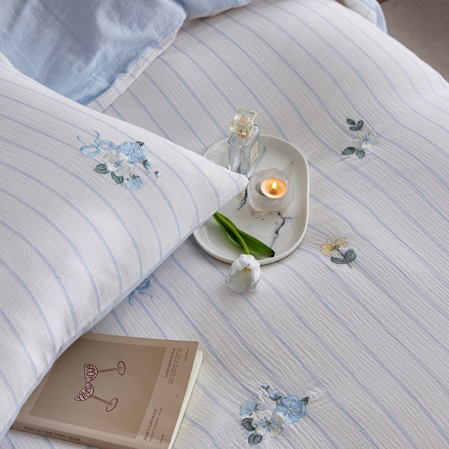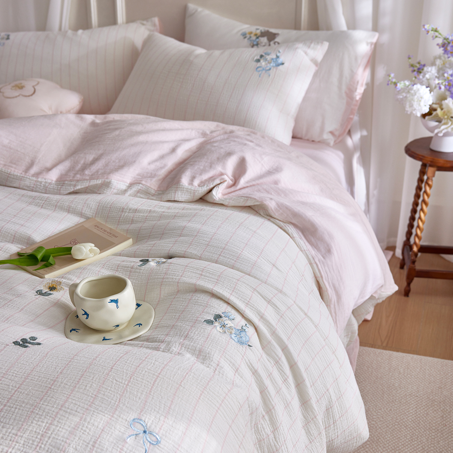 当前位置: 91家纺网 > 商品网购 > 床品套件 > 四件套 > 全棉普通四件套 > 沐珩家纺 2026新款直播爆款A类母婴级条纹全棉双层皱皱纱纯棉绣花双层纱四件套 奶盐可露丽