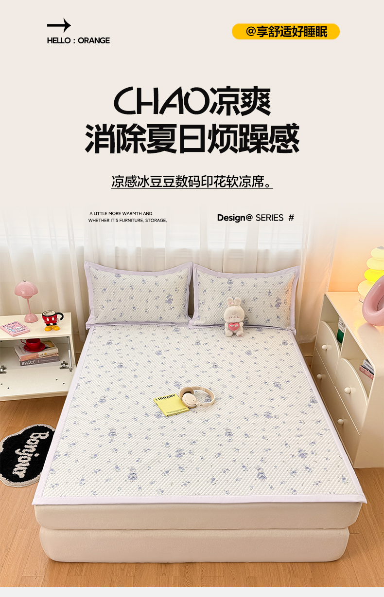 • 91家纺网 家纺一手货源 找家纺 蓝极人 2026新款小清新冰豆豆数码印花席三明治底席子凉席 糖果小狗