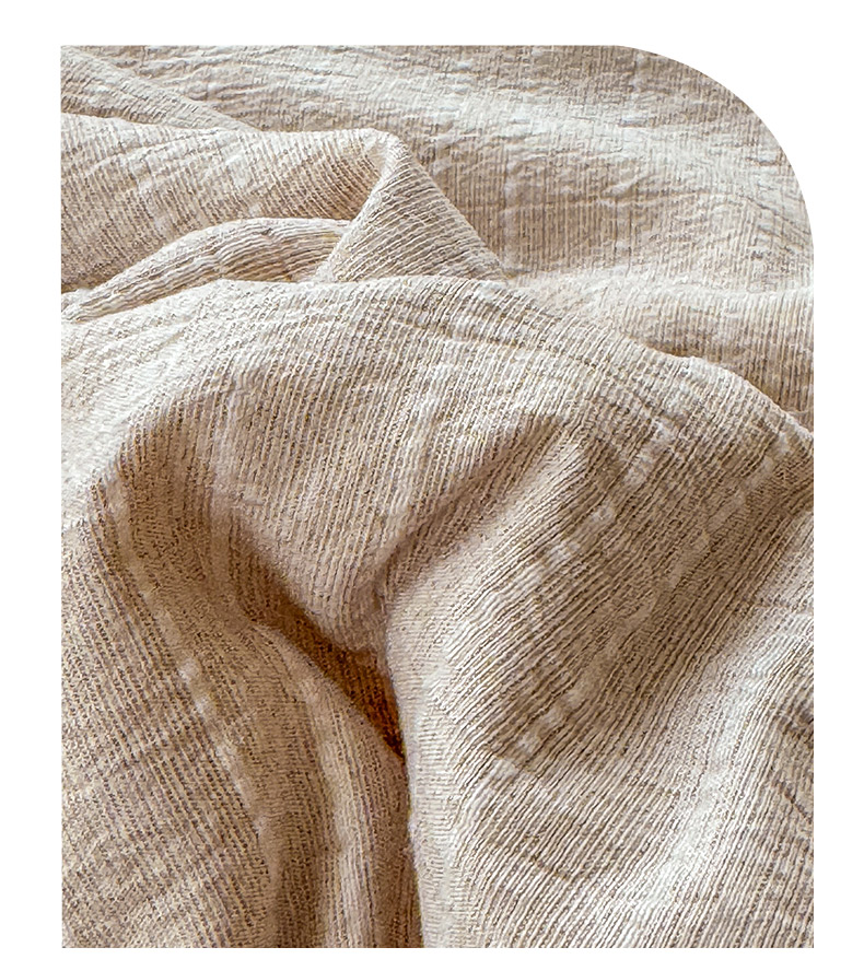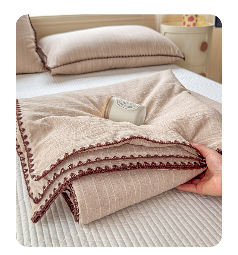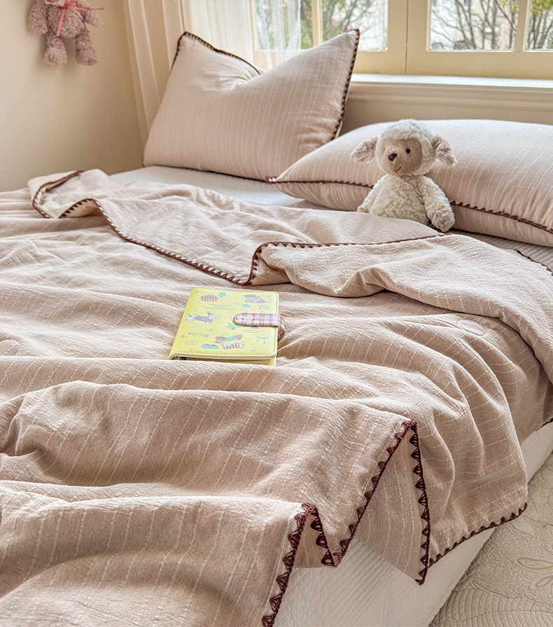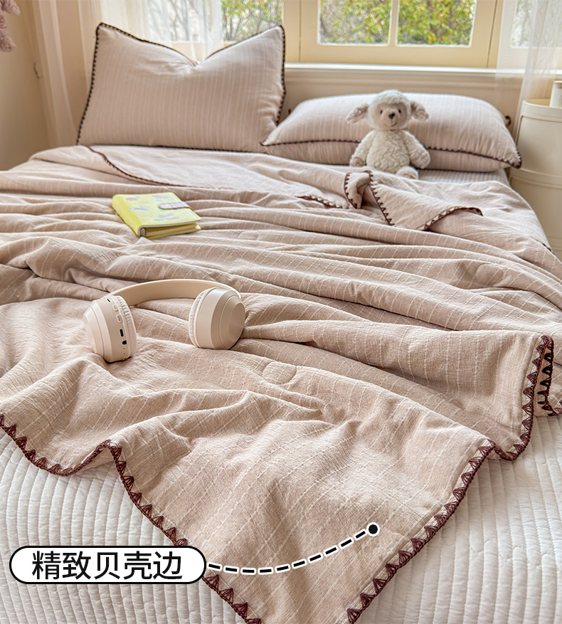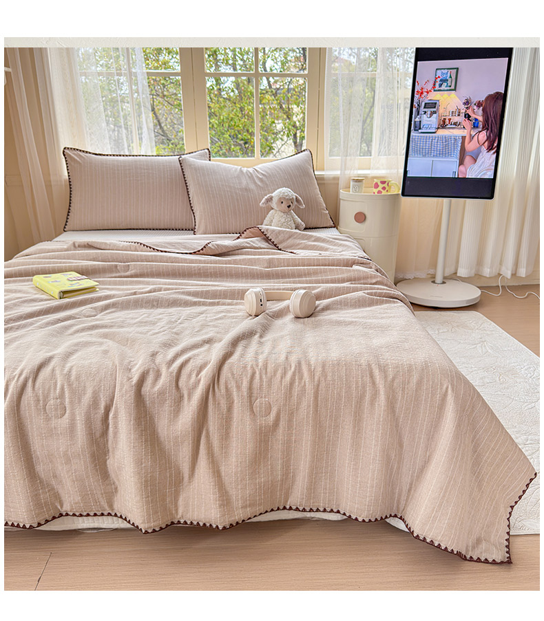被子 > 夏被 > 鑫利来家纺 2026新款纯色无印风夏被简约素色法式麻夏凉被阳离子色织提花单人双人学生夏凉被-场景二 青禾-奶咖
