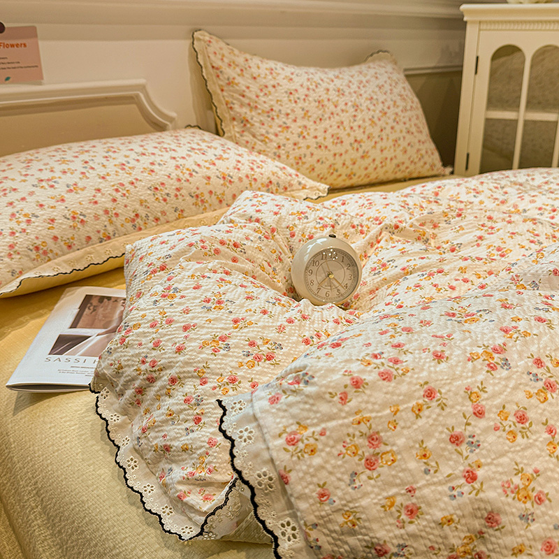 (总)一比一家纺 2026新款彩色全棉花边木棉皱皱纱四件套,阿吉豆,初心粉,初心蓝,扶摇,赫本,花间女孩,花漫漫,花蜜,阑珊,罗卡,奶芙喵,甜心格格,午后花园,小马驹,邂逅,野餐兔,樱花季,悠然,紫烟